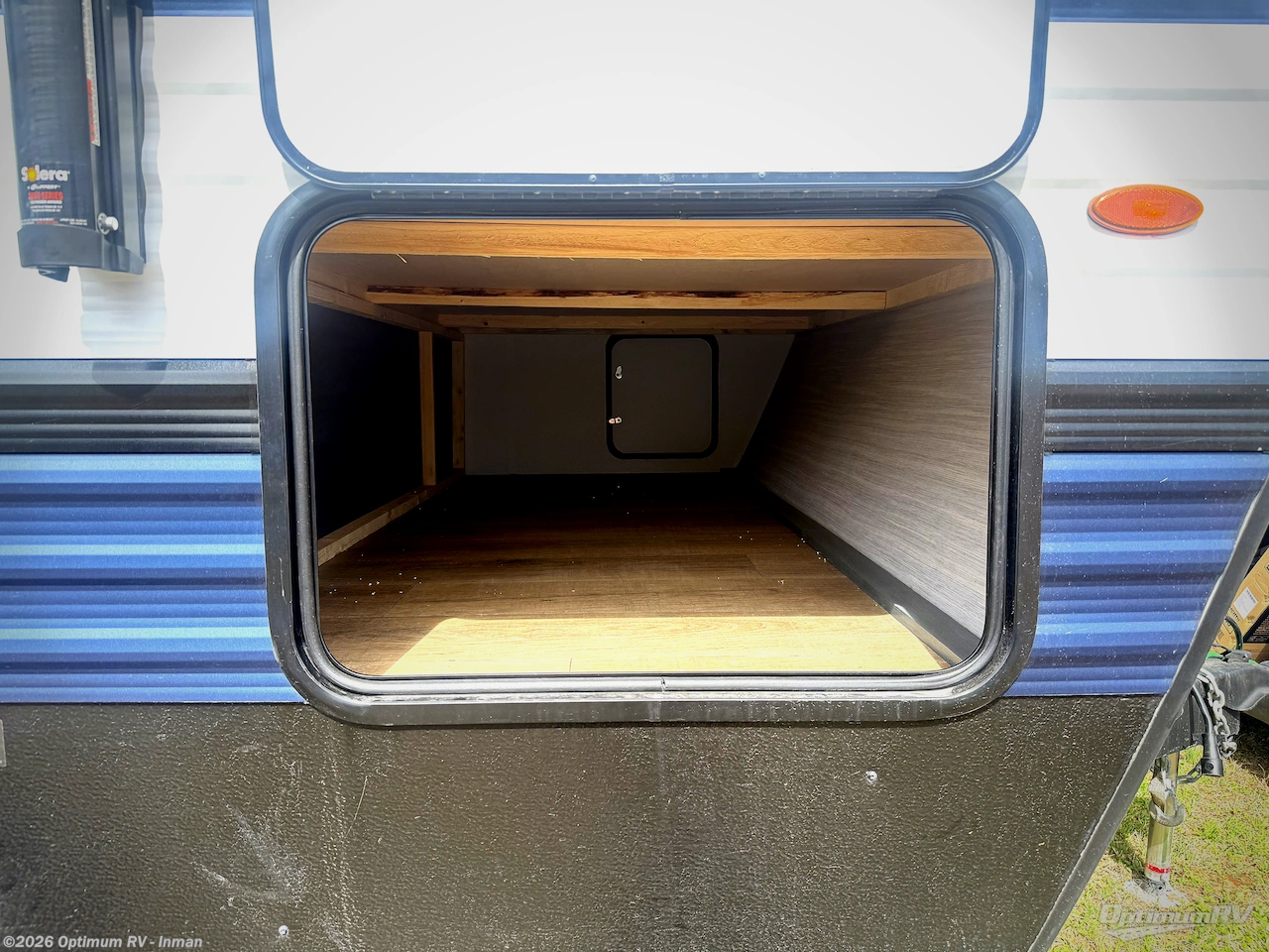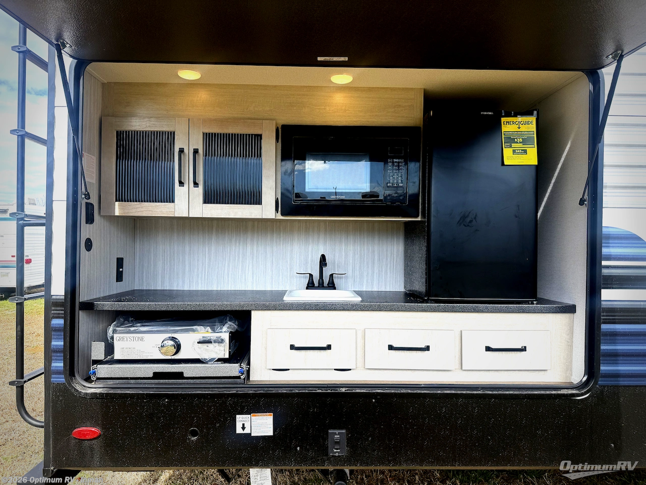 The kids will love having their own rear private bunkhouse in this travel trailer! Inside the bunkhouse is a 38" x 76" bunk above an entertainment center, a closet, and a 32" x 69" bunk above a jiffy sofa slide. The full bathroom with a 34" x 34" radius shower is just outside the bunkhouse for them to easily access it at night. They can even invite a friend or two to tag along and sleep on the sofa and U-shaped dinette once converted. Behind the entertainment center is a closet/pantry to keep your favorite snacks and the kitchen has a 12V refrigerator to keep your beverages cold. When you're ready to wind down your nights, head to the front private bedroom and relax on the queen bed with shirt closets and nightstands on either side of it, plus it has one of the dual entry doors to the unit! This model also has an outside kitchen option if you enjoy cooking in the fresh outdoors!