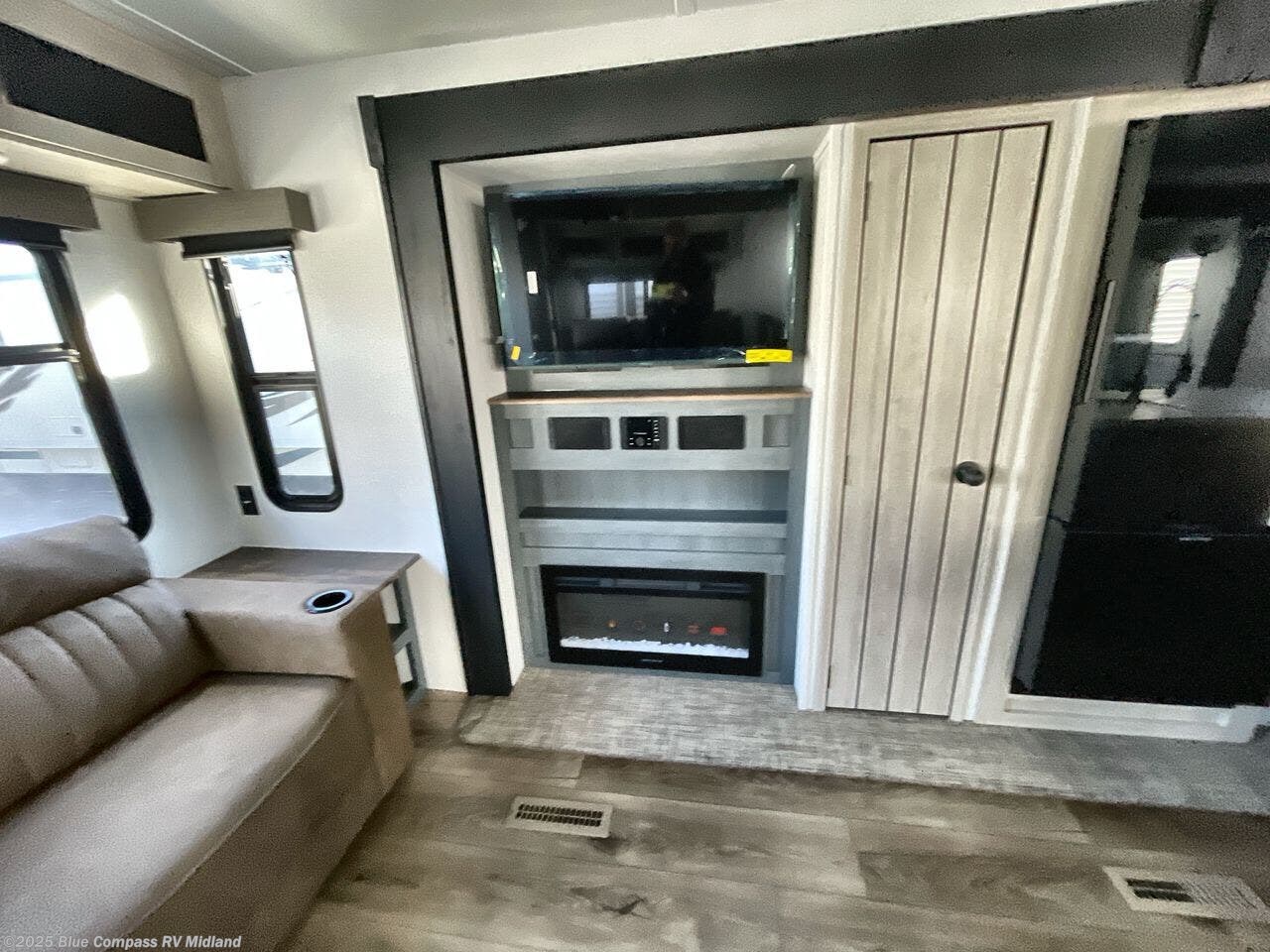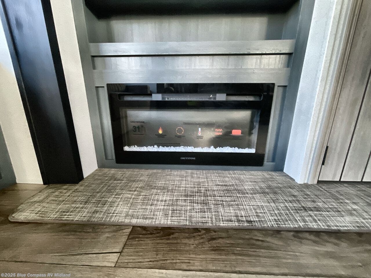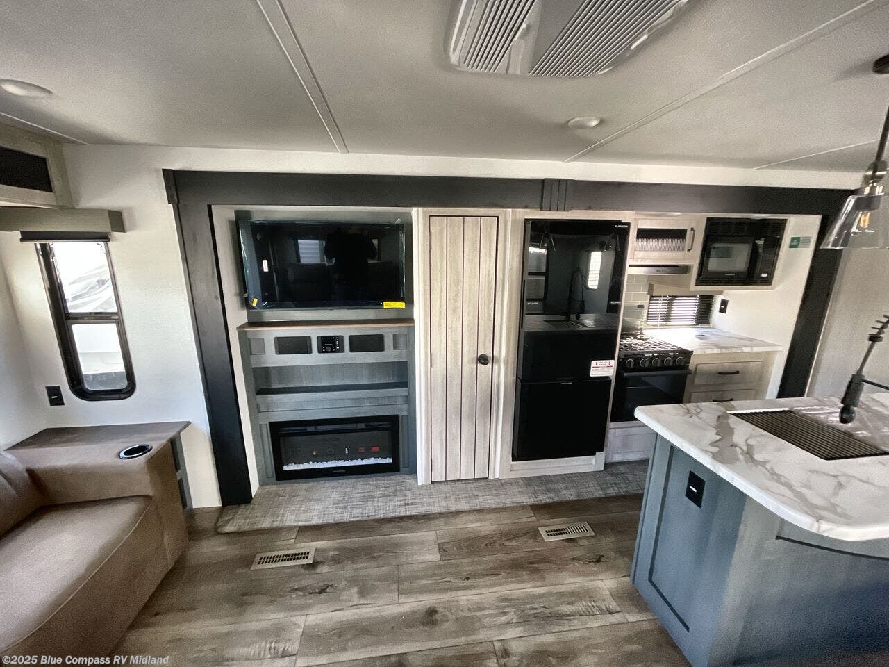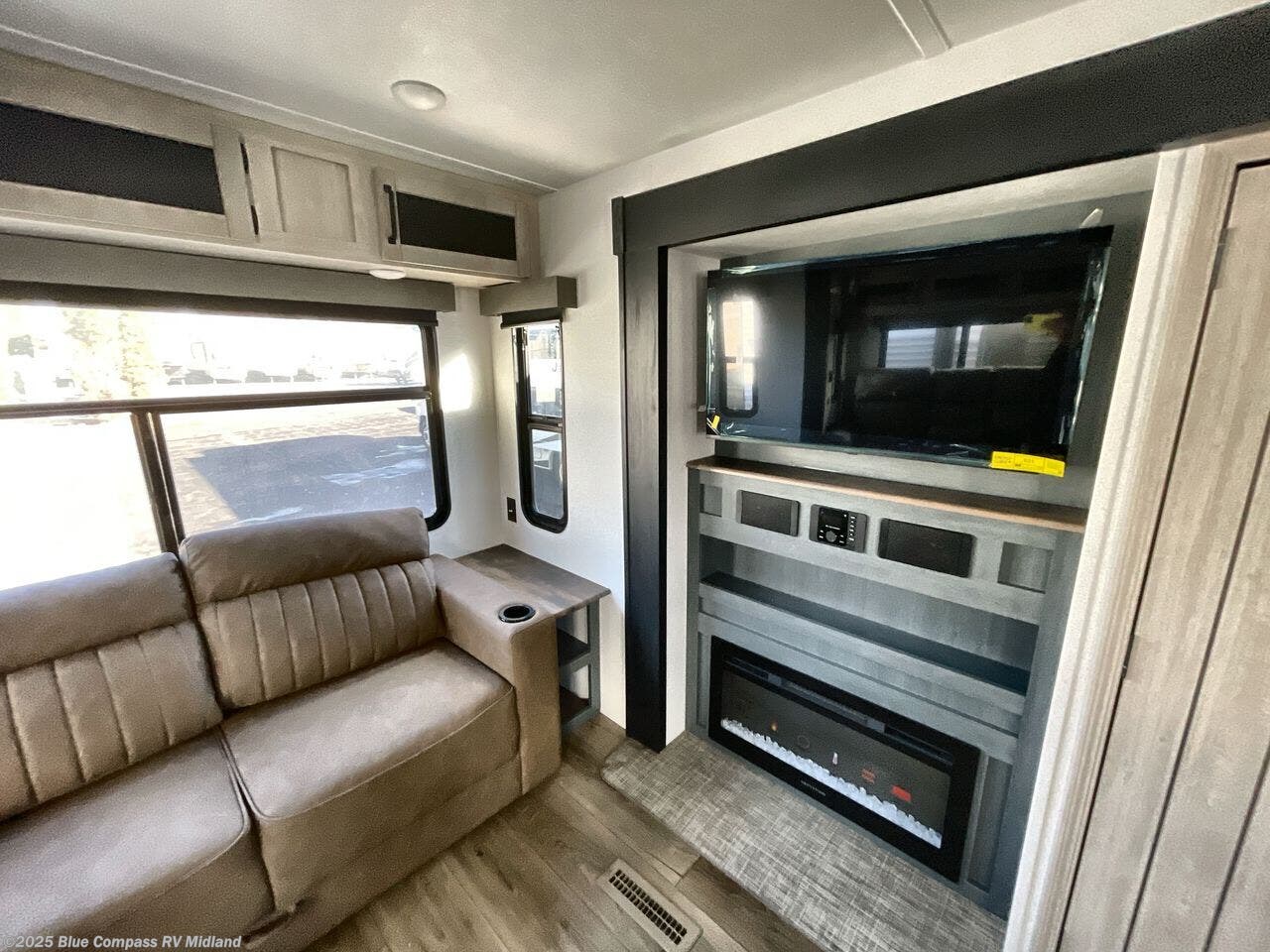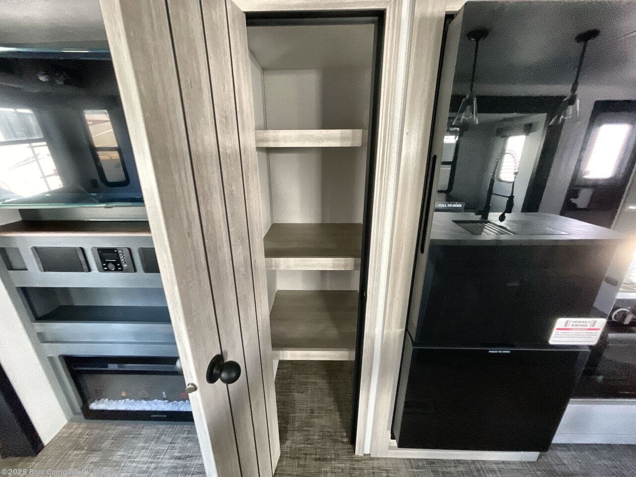 You're going to feel right at home in this travel trailer! The front private bedroom has a queen bed slide for a good night's rest, a dresser and front closet for your clothes, and another closet with washer and dryer prep. Freshen up each morning in the full bathroom with the 32" x 40" shower with a seat and then head to the kitchen to fry up some eggs on the stainless-steel oven and range. You will also appreciate having a kitchen island for easier meal prep and a walk-in pantry to easily see your canned goods and snacks. The booth dinette offers a comfortable place to dine, play, and even sleep once converted. What better way to wind down your nights than to relax on either the rear sofa or on the theater seating across from the entertainment center with a fireplace!