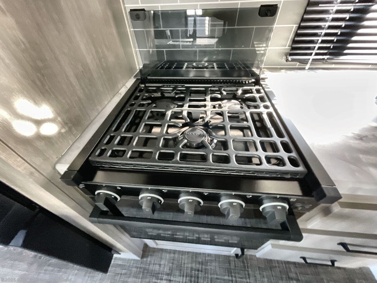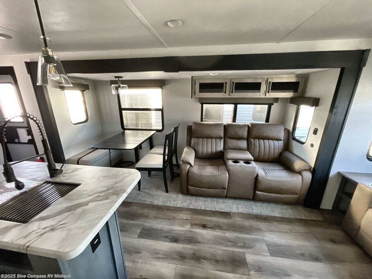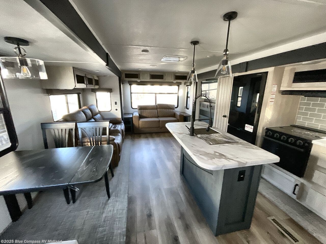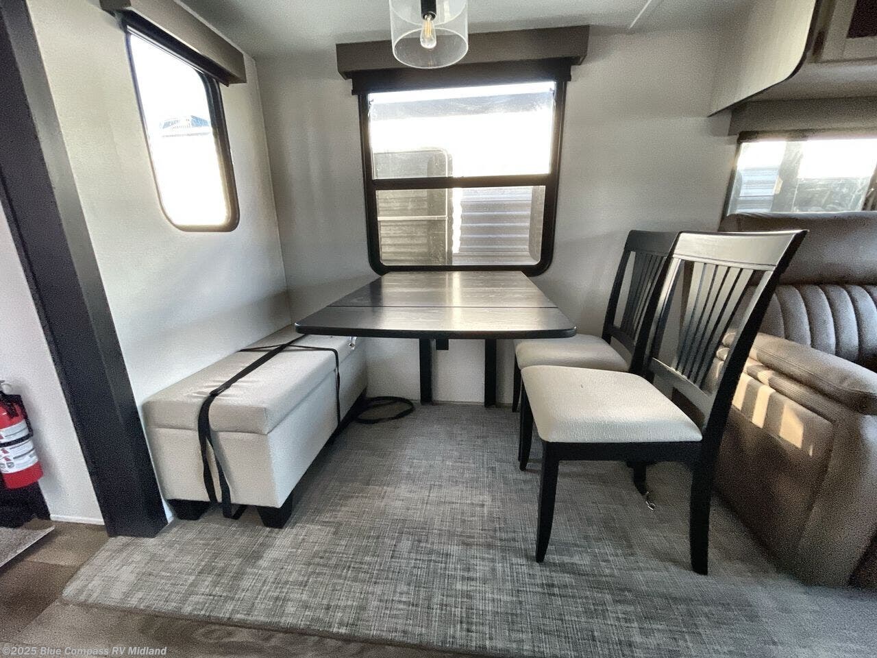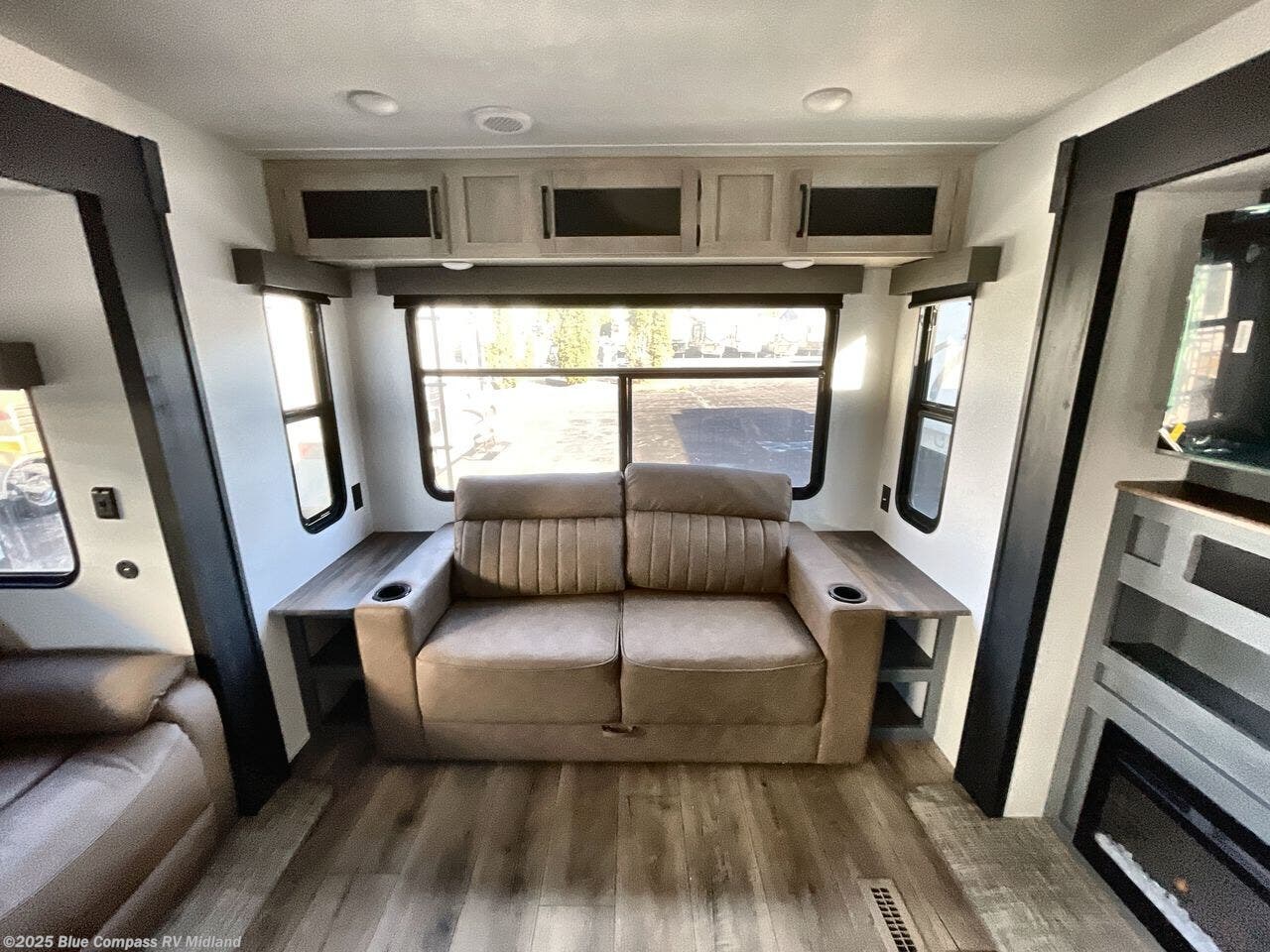 You're going to feel right at home in this travel trailer! The front private bedroom has a queen bed slide for a good night's rest, a dresser and front closet for your clothes, and another closet with washer and dryer prep. Freshen up each morning in the full bathroom with the 32" x 40" shower with a seat and then head to the kitchen to fry up some eggs on the stainless-steel oven and range. You will also appreciate having a kitchen island for easier meal prep and a walk-in pantry to easily see your canned goods and snacks. The booth dinette offers a comfortable place to dine, play, and even sleep once converted. What better way to wind down your nights than to relax on either the rear sofa or on the theater seating across from the entertainment center with a fireplace!