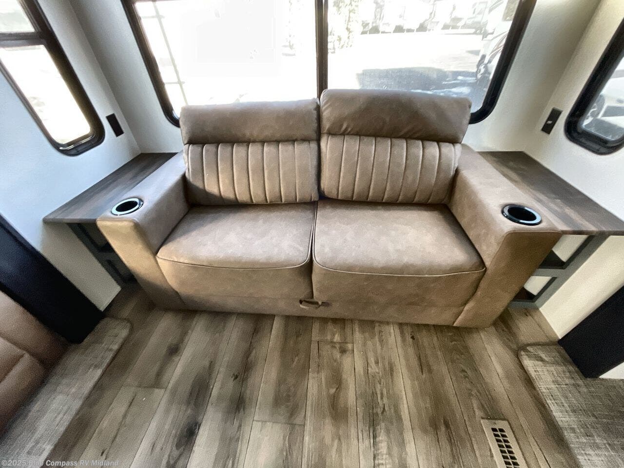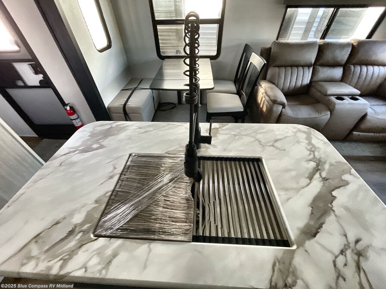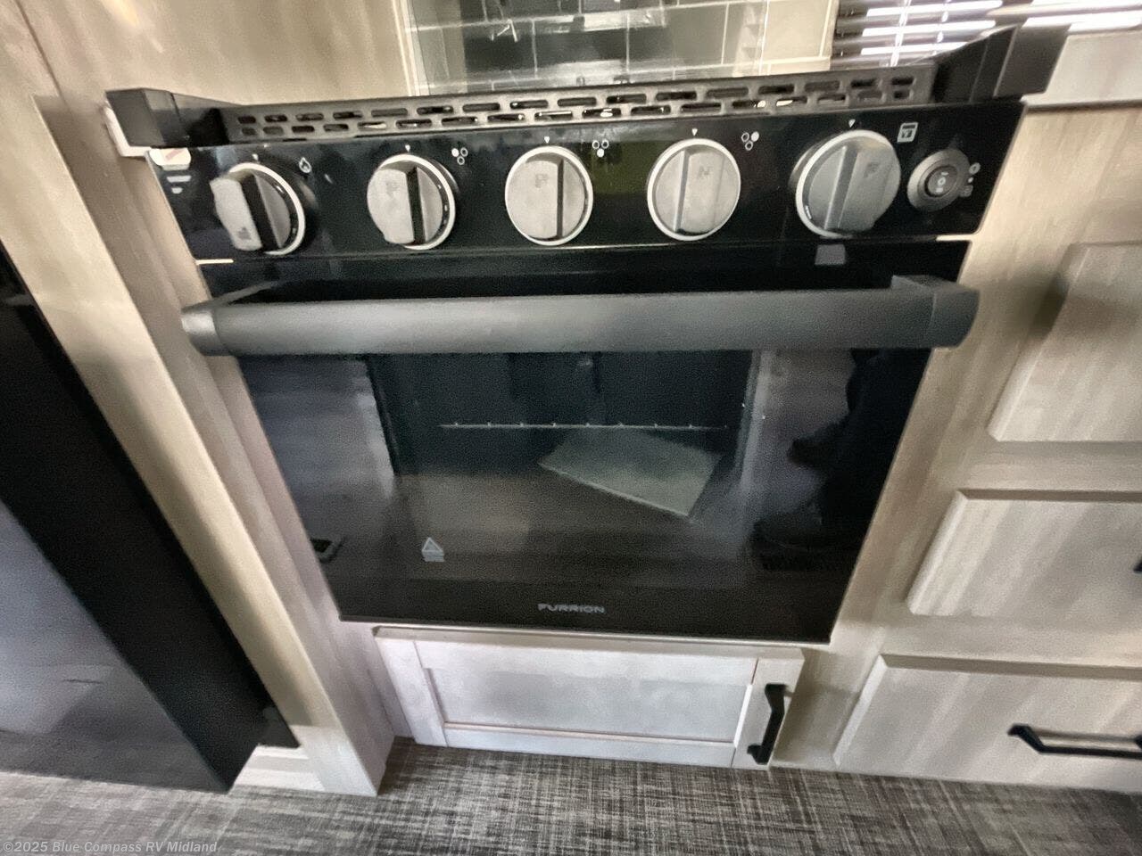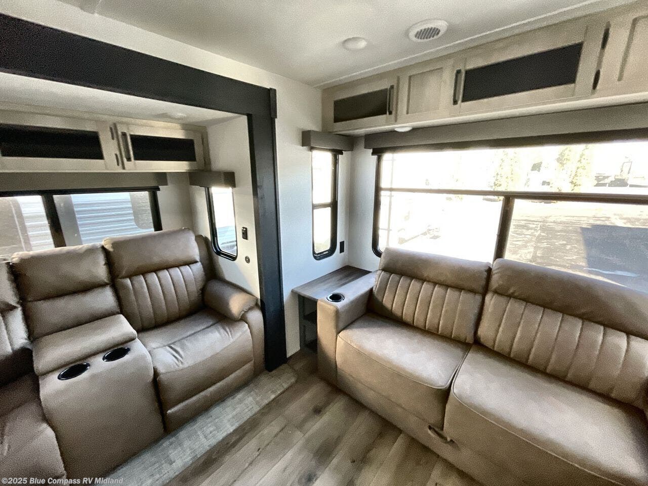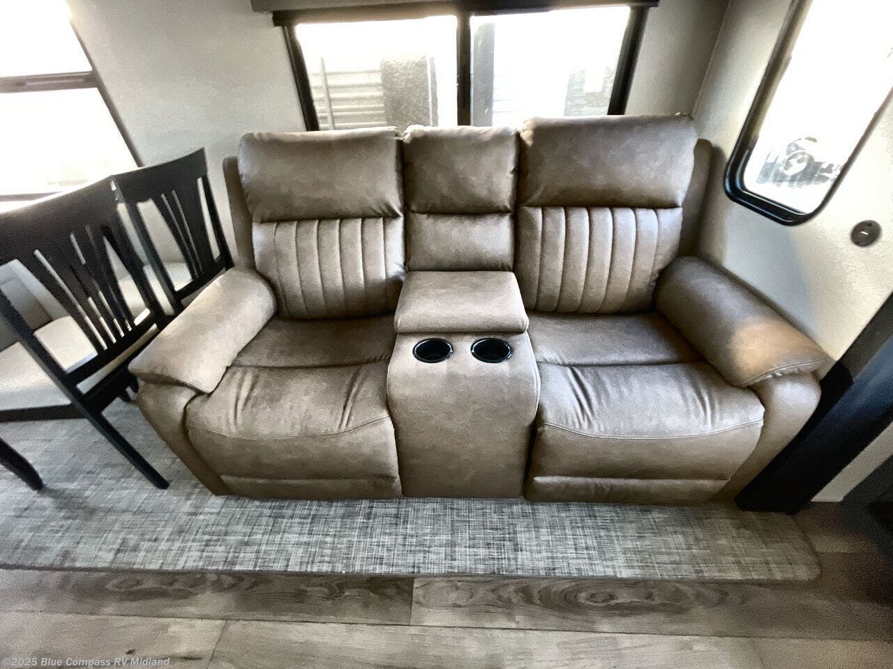 You're going to feel right at home in this travel trailer! The front private bedroom has a queen bed slide for a good night's rest, a dresser and front closet for your clothes, and another closet with washer and dryer prep. Freshen up each morning in the full bathroom with the 32" x 40" shower with a seat and then head to the kitchen to fry up some eggs on the stainless-steel oven and range. You will also appreciate having a kitchen island for easier meal prep and a walk-in pantry to easily see your canned goods and snacks. The booth dinette offers a comfortable place to dine, play, and even sleep once converted. What better way to wind down your nights than to relax on either the rear sofa or on the theater seating across from the entertainment center with a fireplace!