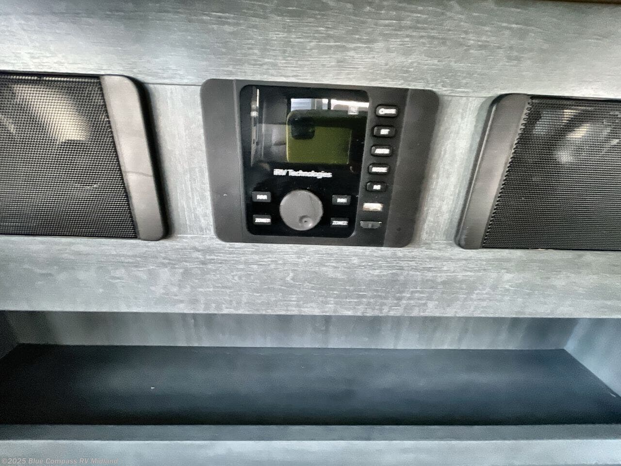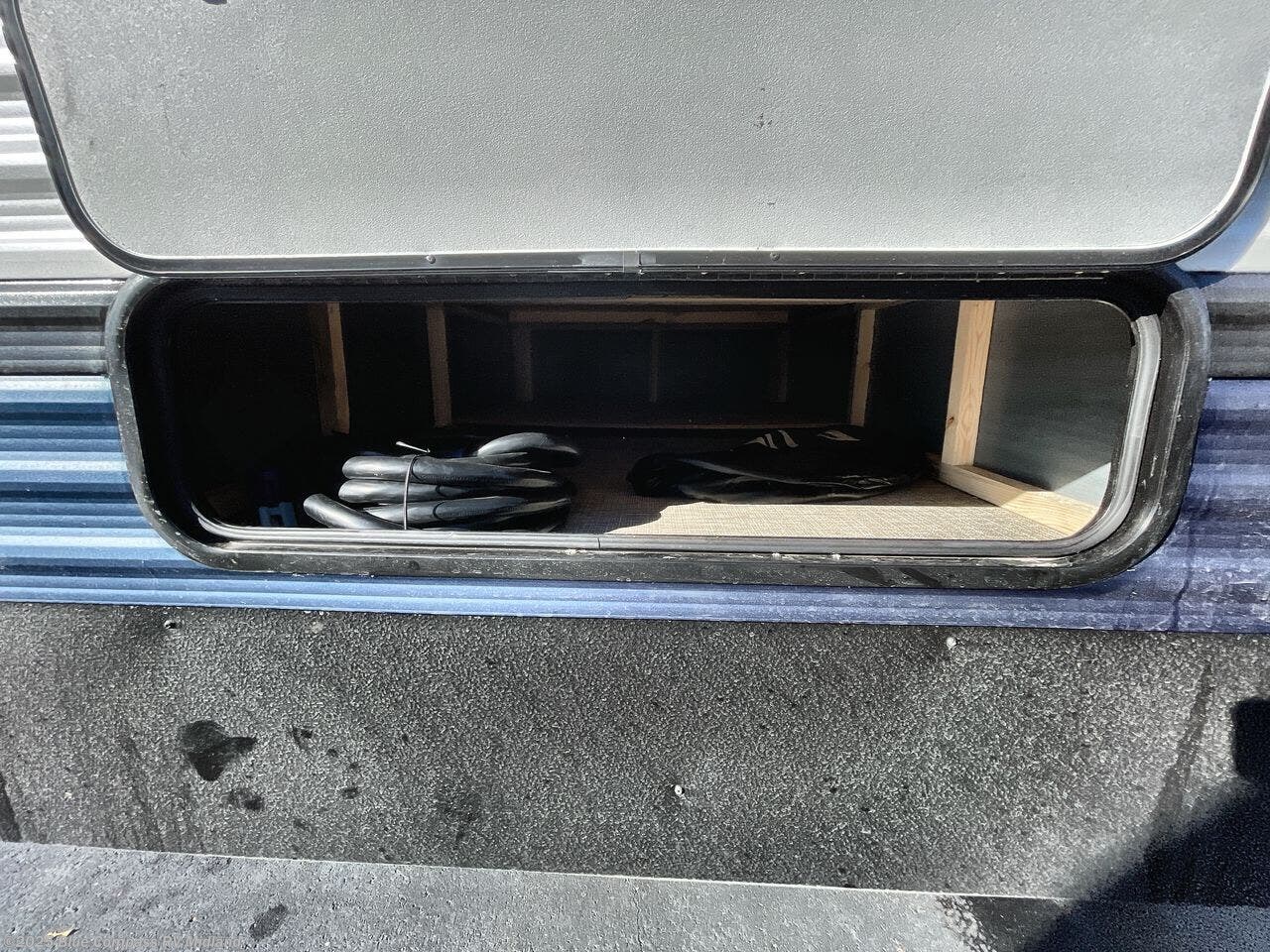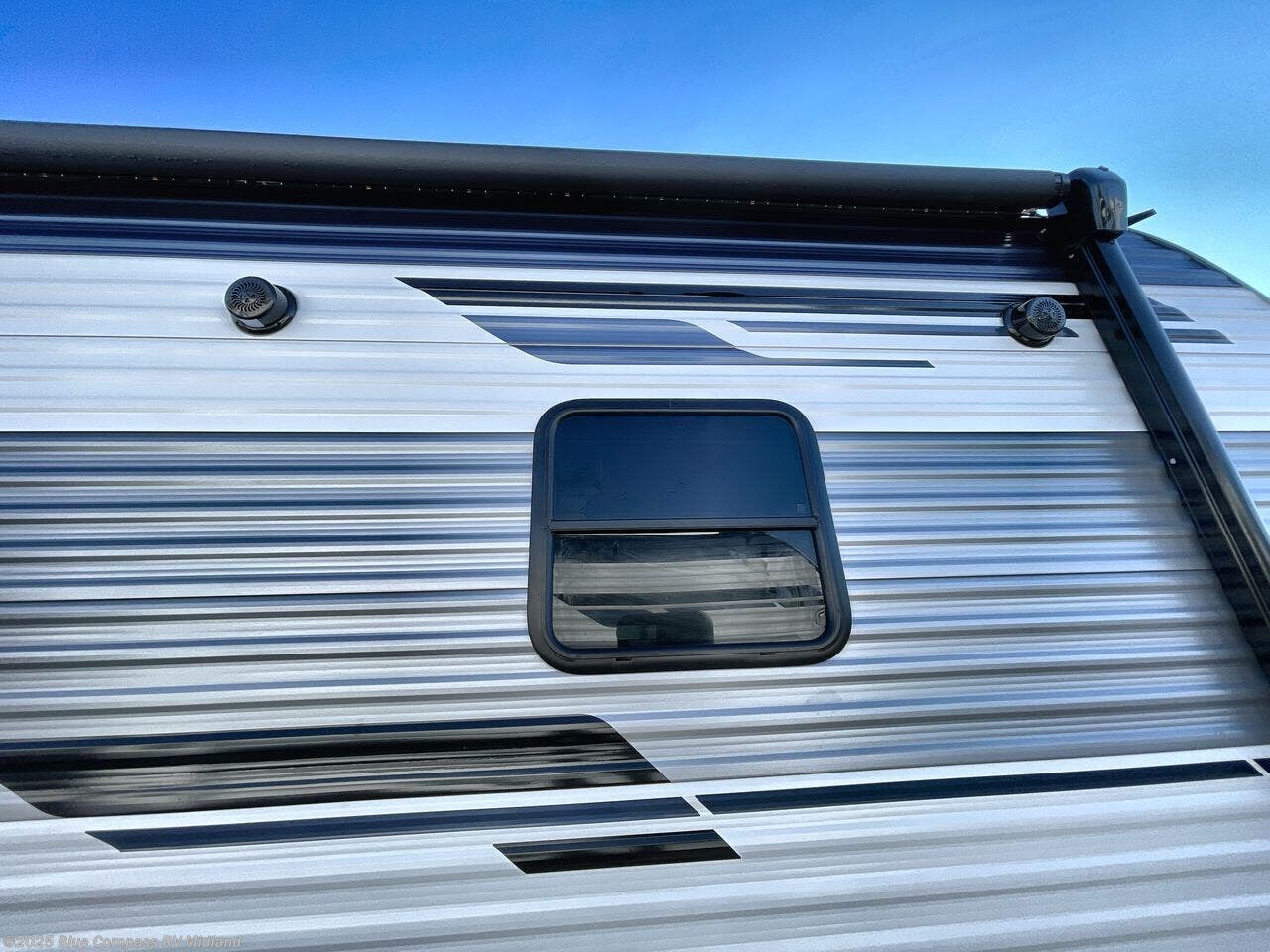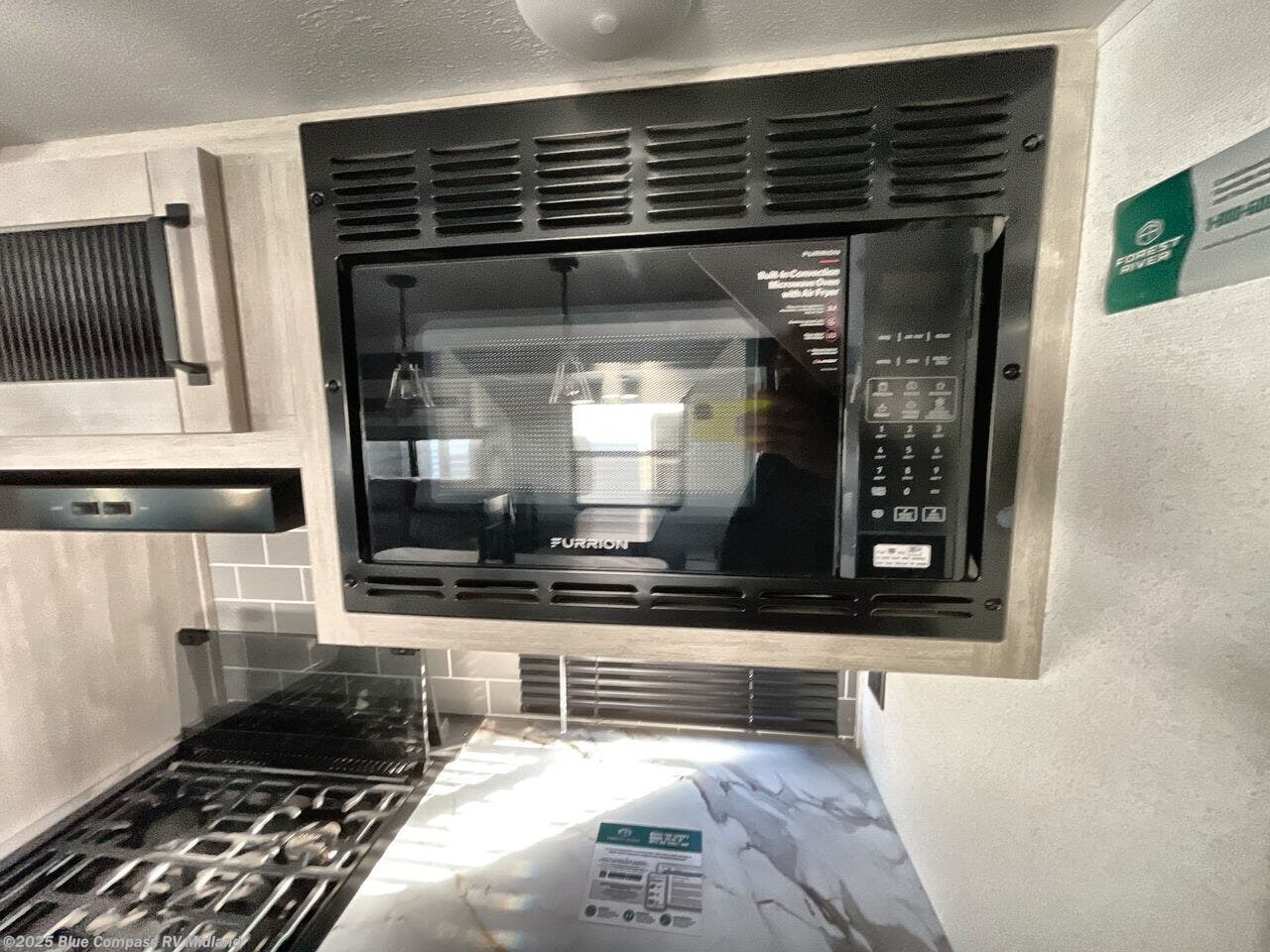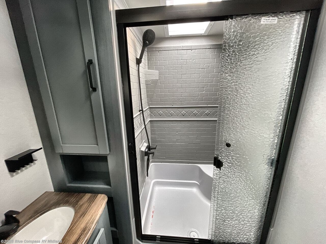 You're going to feel right at home in this travel trailer! The front private bedroom has a queen bed slide for a good night's rest, a dresser and front closet for your clothes, and another closet with washer and dryer prep. Freshen up each morning in the full bathroom with the 32" x 40" shower with a seat and then head to the kitchen to fry up some eggs on the stainless-steel oven and range. You will also appreciate having a kitchen island for easier meal prep and a walk-in pantry to easily see your canned goods and snacks. The booth dinette offers a comfortable place to dine, play, and even sleep once converted. What better way to wind down your nights than to relax on either the rear sofa or on the theater seating across from the entertainment center with a fireplace!