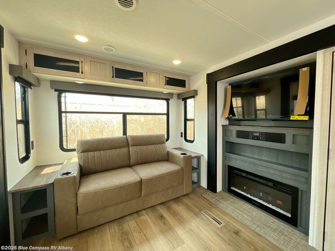 You're going to feel right at home in this travel trailer! The front private bedroom has a queen bed slide for a good night's rest, a dresser and front closet for your clothes, and another closet with washer and dryer prep. Freshen up each morning in the full bathroom with the 32" x 40" shower with a seat and then head to the kitchen to fry up some eggs on the stainless-steel oven and range. You will also appreciate having a kitchen island for easier meal prep and a walk-in pantry to easily see your canned goods and snacks. The booth dinette offers a comfortable place to dine, play, and even sleep once converted. What better way to wind down your nights than to relax on either the rear sofa or on the theater seating across from the entertainment center with a fireplace!