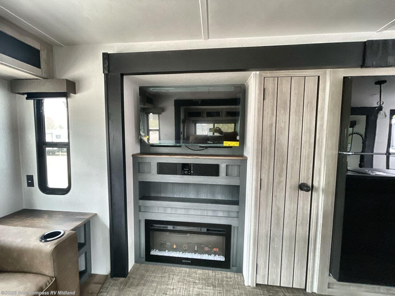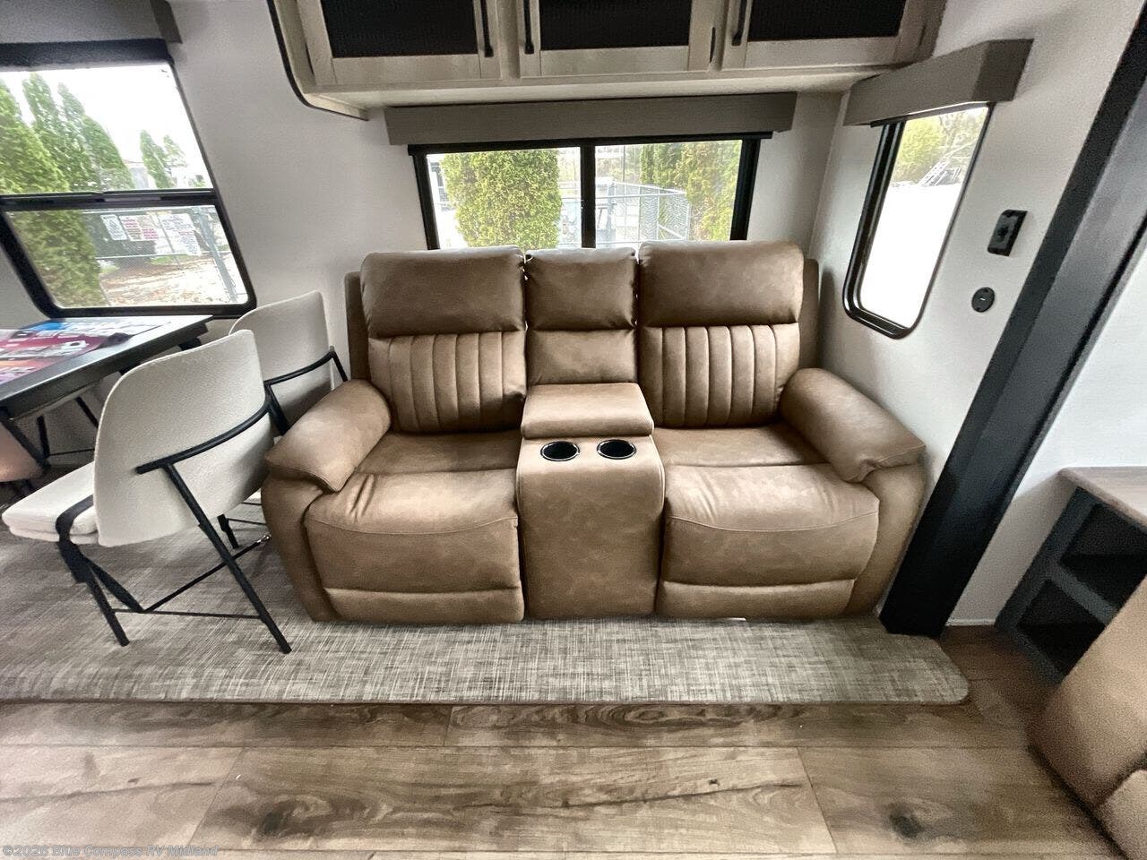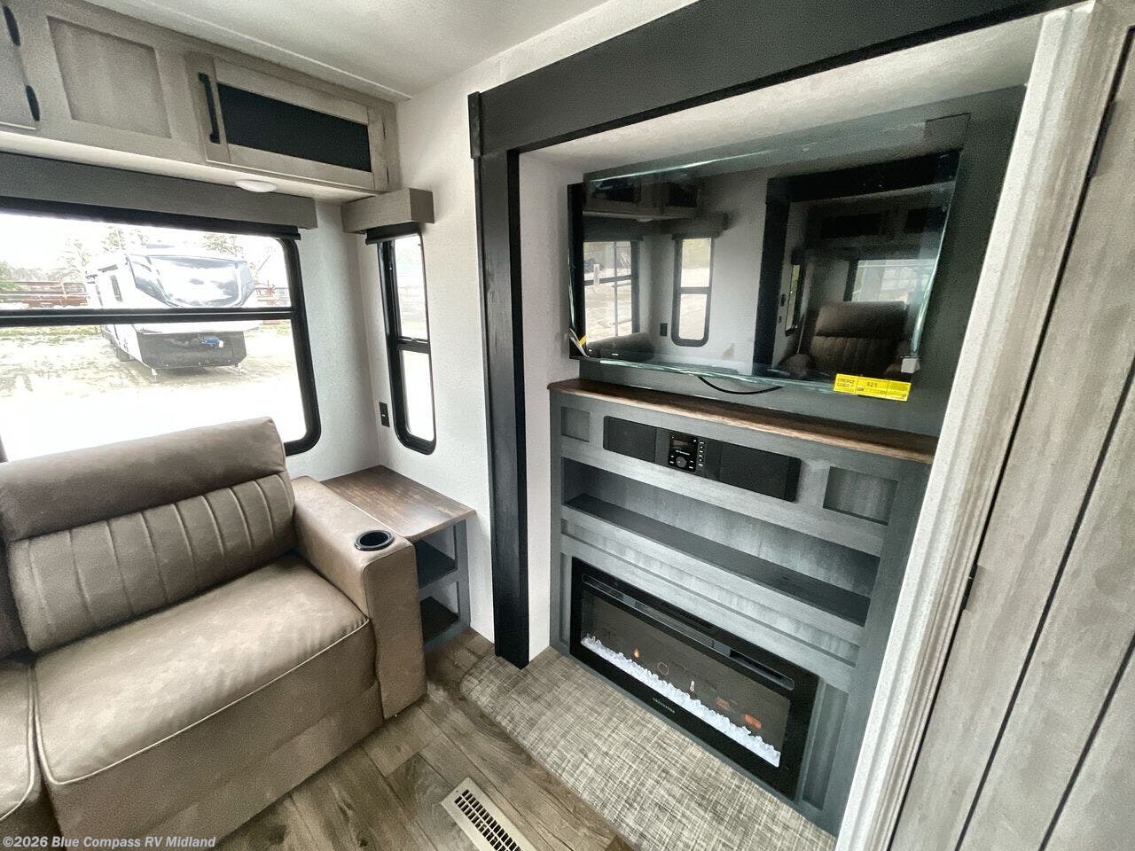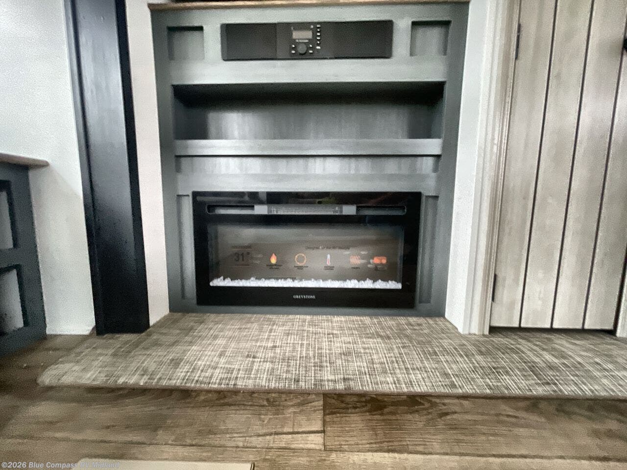 You're going to feel right at home in this travel trailer! The front private bedroom has a queen bed slide for a good night's rest, a dresser and front closet for your clothes, and another closet with washer and dryer prep. Freshen up each morning in the full bathroom with the 32" x 40" shower with a seat and then head to the kitchen to fry up some eggs on the stainless-steel oven and range. You will also appreciate having a kitchen island for easier meal prep and a walk-in pantry to easily see your canned goods and snacks. The booth dinette offers a comfortable place to dine, play, and even sleep once converted. What better way to wind down your nights than to relax on either the rear sofa or on the theater seating across from the entertainment center with a fireplace!