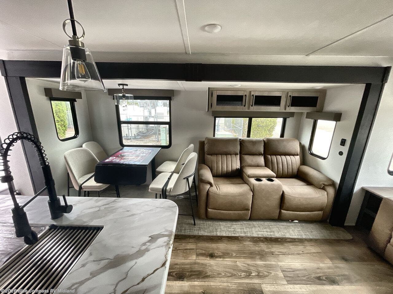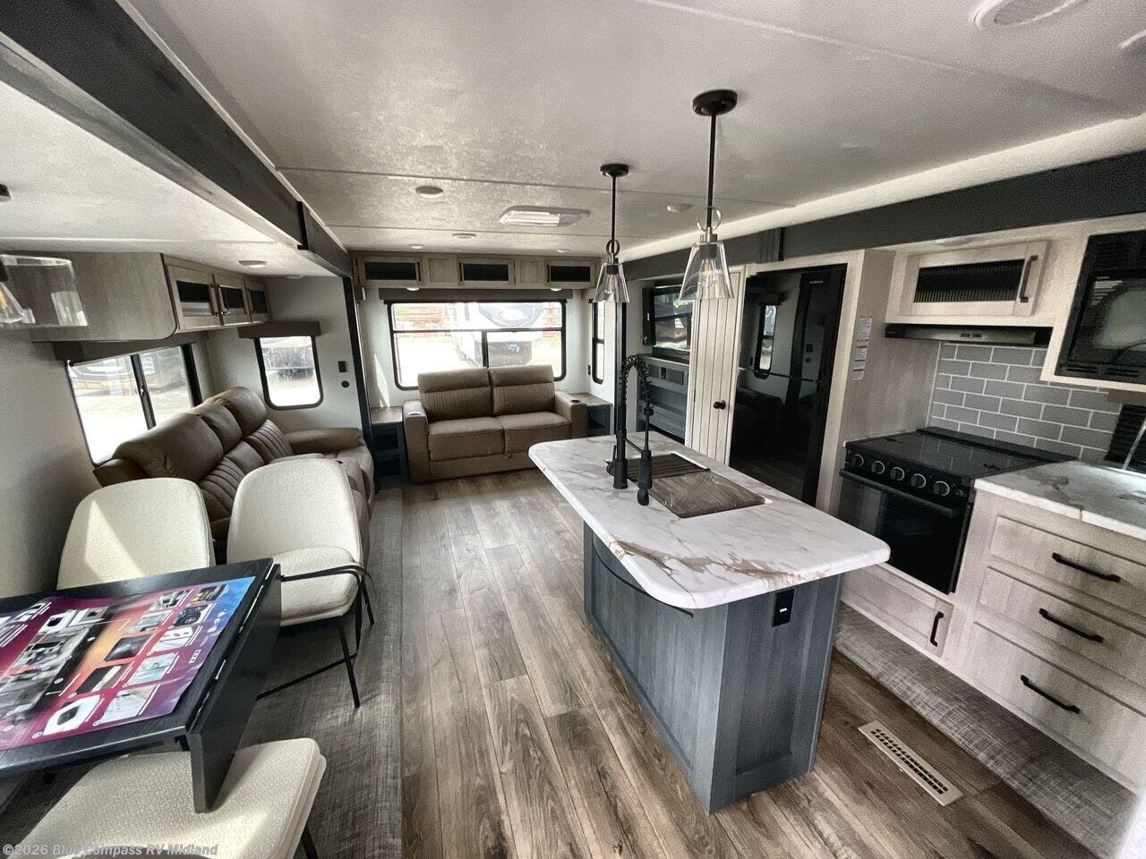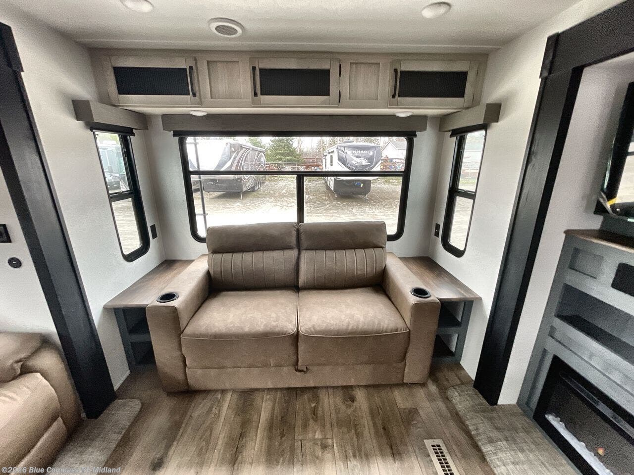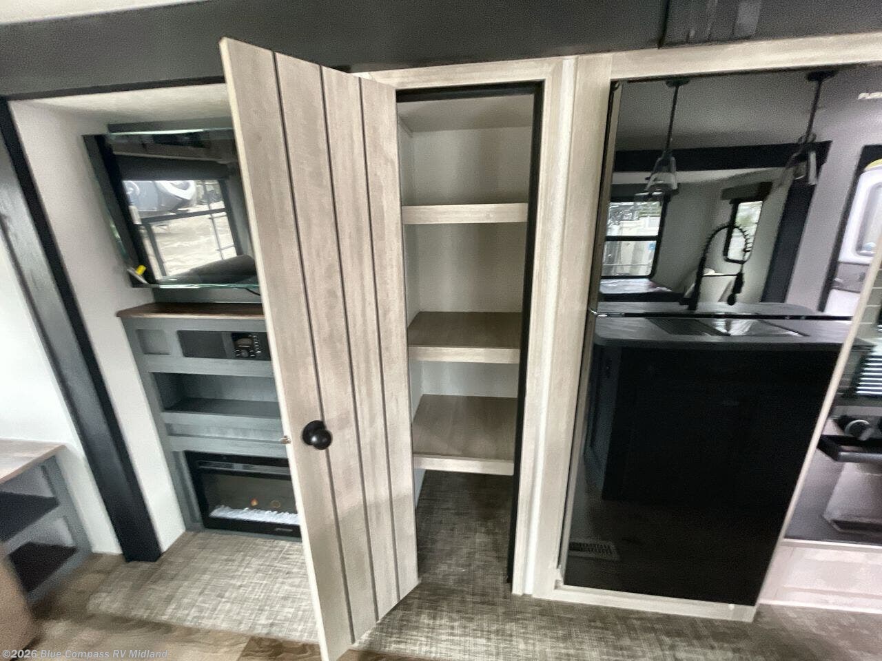 You're going to feel right at home in this travel trailer! The front private bedroom has a queen bed slide for a good night's rest, a dresser and front closet for your clothes, and another closet with washer and dryer prep. Freshen up each morning in the full bathroom with the 32" x 40" shower with a seat and then head to the kitchen to fry up some eggs on the stainless-steel oven and range. You will also appreciate having a kitchen island for easier meal prep and a walk-in pantry to easily see your canned goods and snacks. The booth dinette offers a comfortable place to dine, play, and even sleep once converted. What better way to wind down your nights than to relax on either the rear sofa or on the theater seating across from the entertainment center with a fireplace!