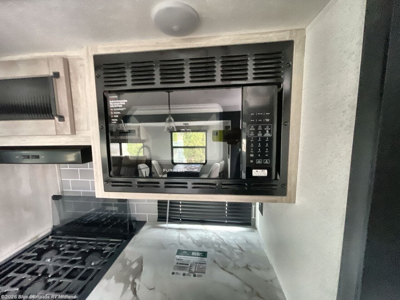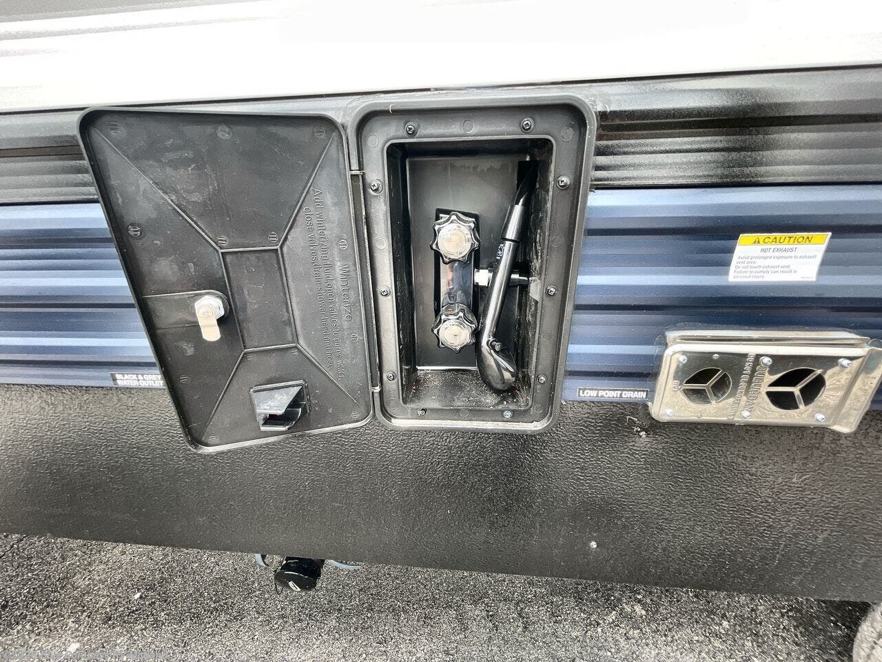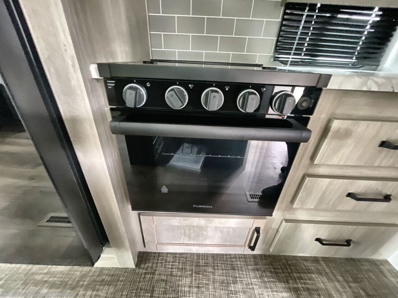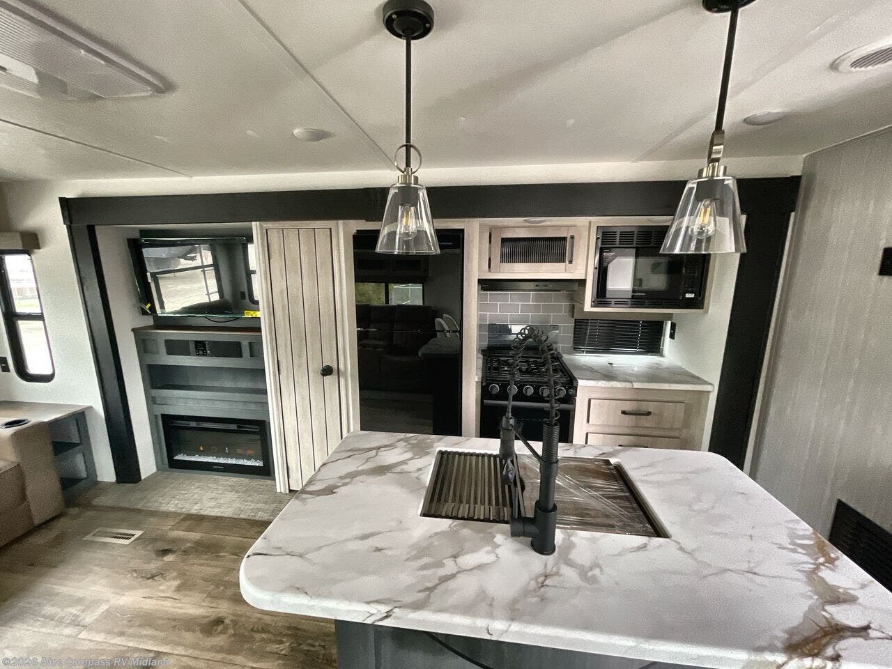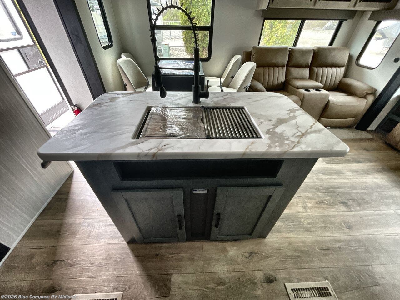 You're going to feel right at home in this travel trailer! The front private bedroom has a queen bed slide for a good night's rest, a dresser and front closet for your clothes, and another closet with washer and dryer prep. Freshen up each morning in the full bathroom with the 32" x 40" shower with a seat and then head to the kitchen to fry up some eggs on the stainless-steel oven and range. You will also appreciate having a kitchen island for easier meal prep and a walk-in pantry to easily see your canned goods and snacks. The booth dinette offers a comfortable place to dine, play, and even sleep once converted. What better way to wind down your nights than to relax on either the rear sofa or on the theater seating across from the entertainment center with a fireplace!