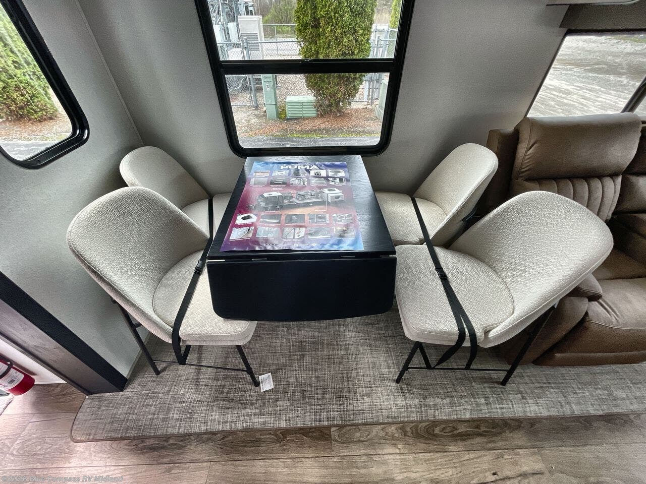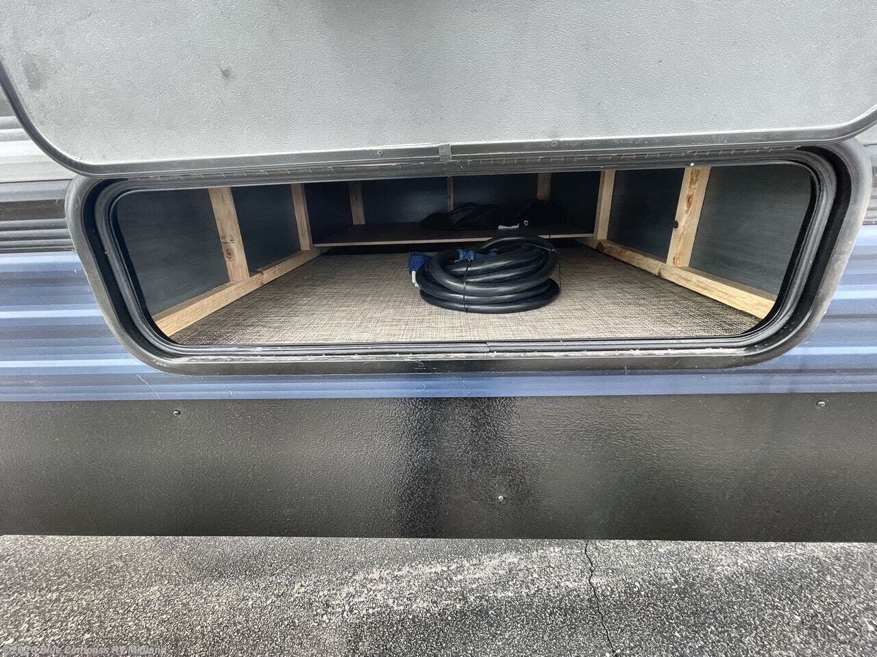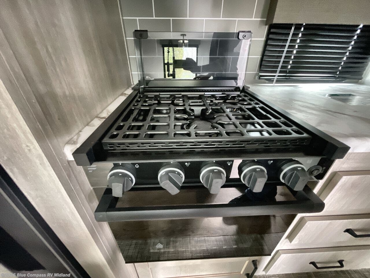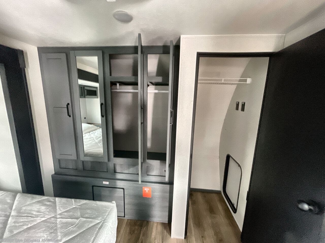You're going to feel right at home in this travel trailer! The front private bedroom has a queen bed slide for a good night's rest, a dresser and front closet for your clothes, and another closet with washer and dryer prep. Freshen up each morning in the full bathroom with the 32" x 40" shower with a seat and then head to the kitchen to fry up some eggs on the stainless-steel oven and range. You will also appreciate having a kitchen island for easier meal prep and a walk-in pantry to easily see your canned goods and snacks. The booth dinette offers a comfortable place to dine, play, and even sleep once converted. What better way to wind down your nights than to relax on either the rear sofa or on the theater seating across from the entertainment center with a fireplace!
