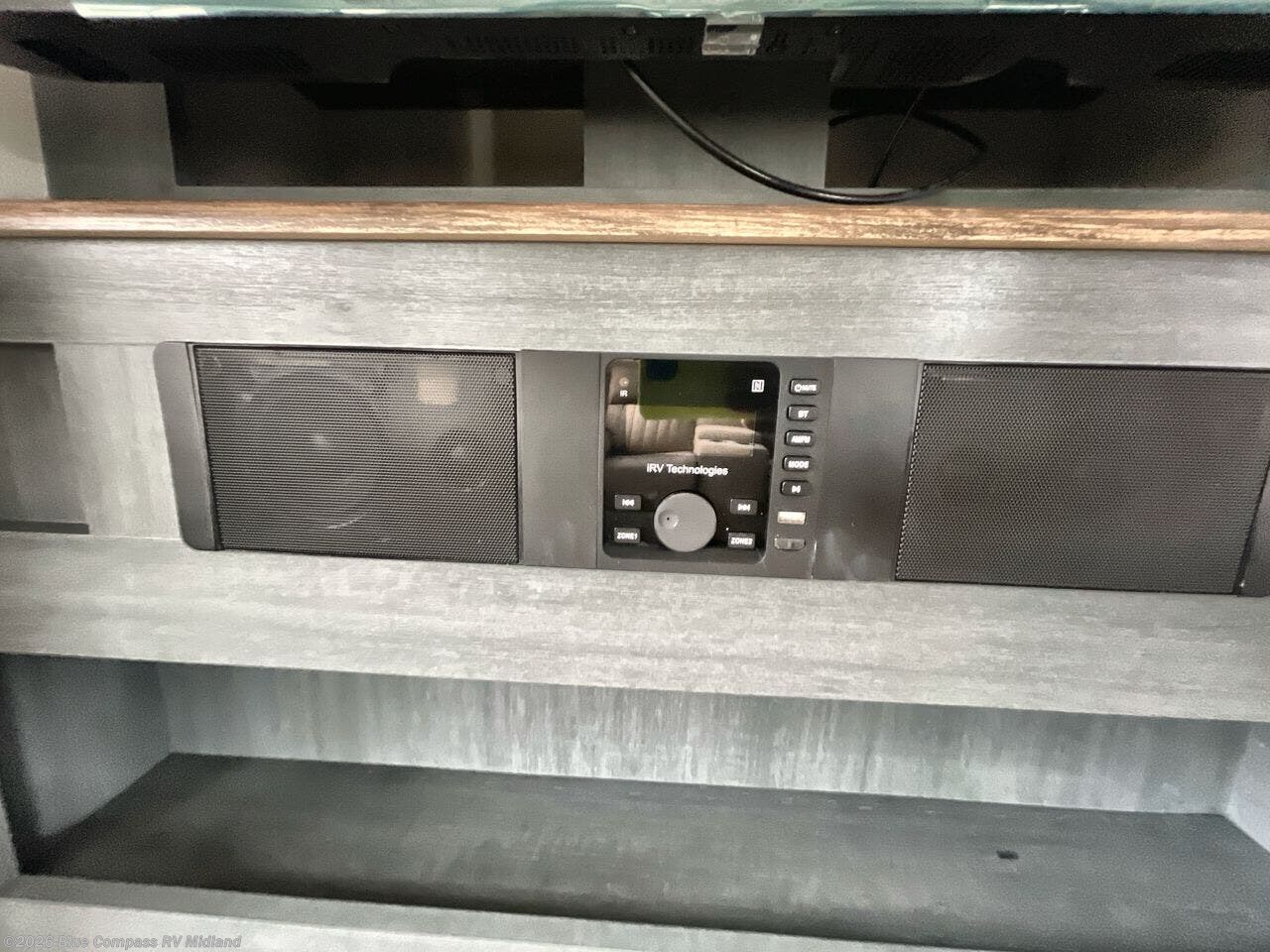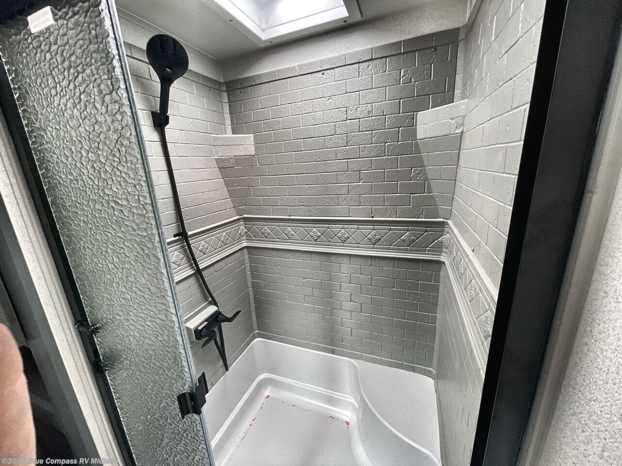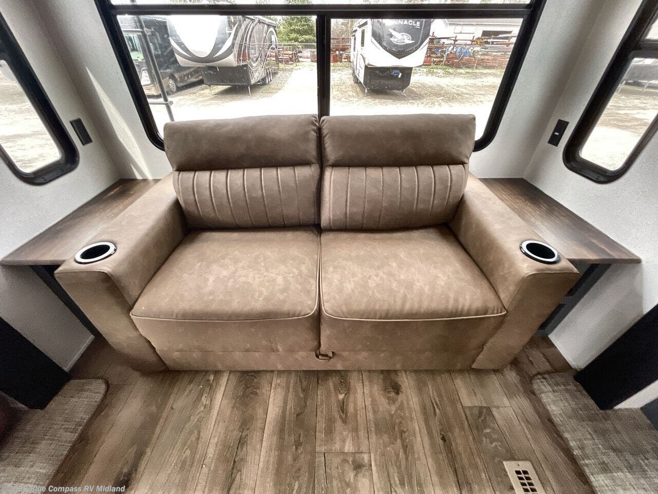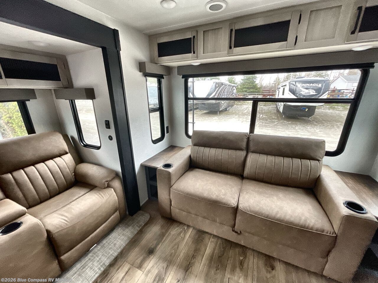 You're going to feel right at home in this travel trailer! The front private bedroom has a queen bed slide for a good night's rest, a dresser and front closet for your clothes, and another closet with washer and dryer prep. Freshen up each morning in the full bathroom with the 32" x 40" shower with a seat and then head to the kitchen to fry up some eggs on the stainless-steel oven and range. You will also appreciate having a kitchen island for easier meal prep and a walk-in pantry to easily see your canned goods and snacks. The booth dinette offers a comfortable place to dine, play, and even sleep once converted. What better way to wind down your nights than to relax on either the rear sofa or on the theater seating across from the entertainment center with a fireplace!