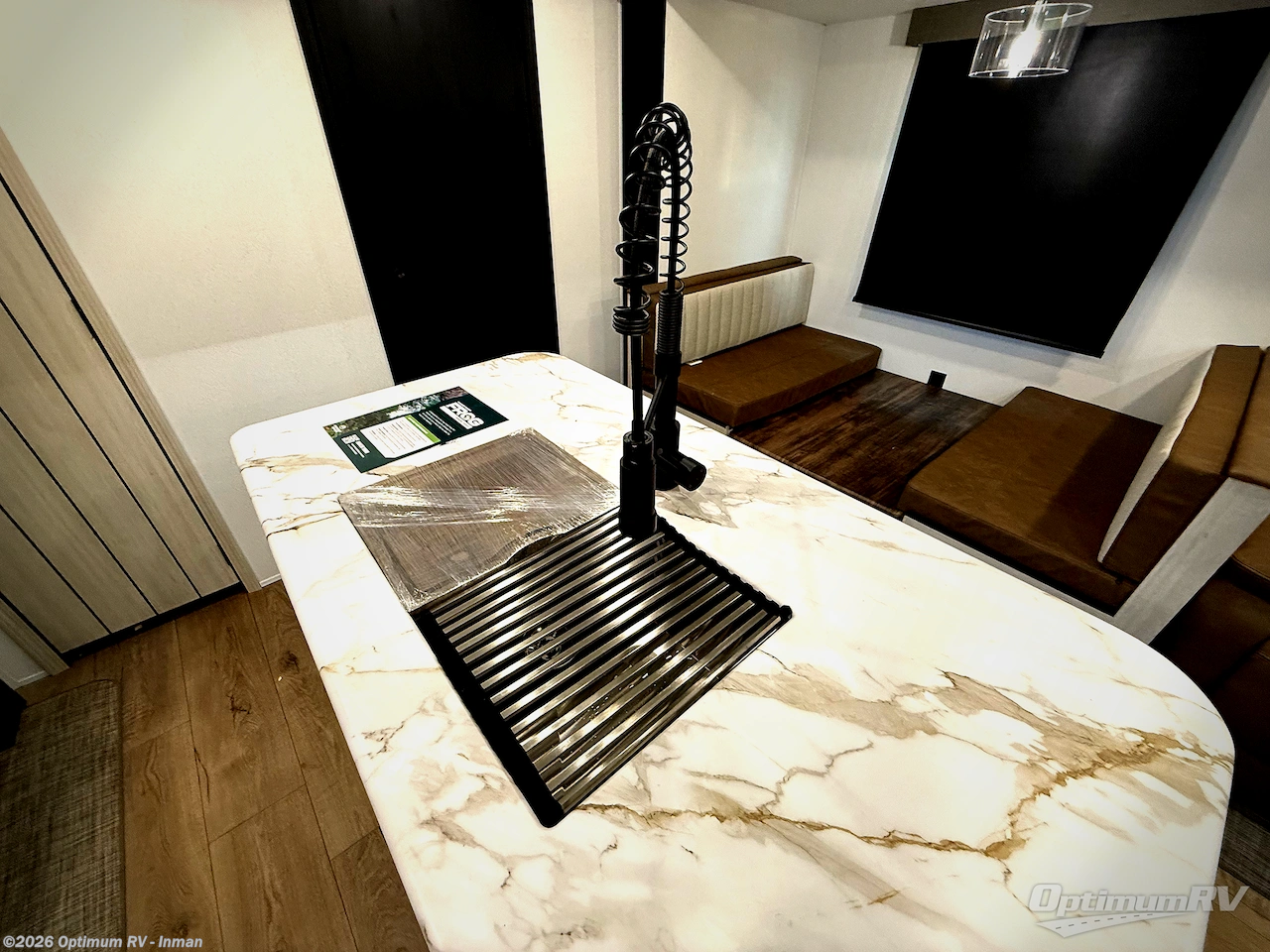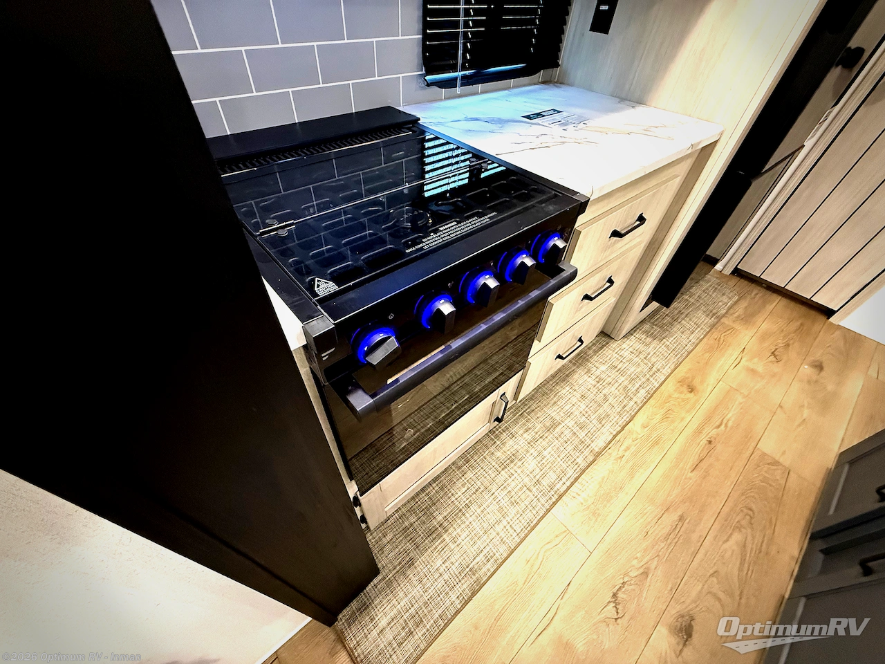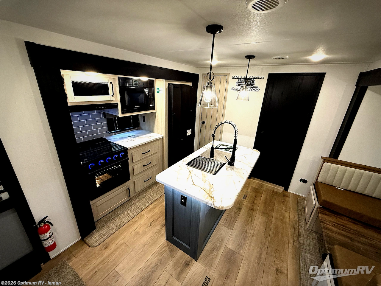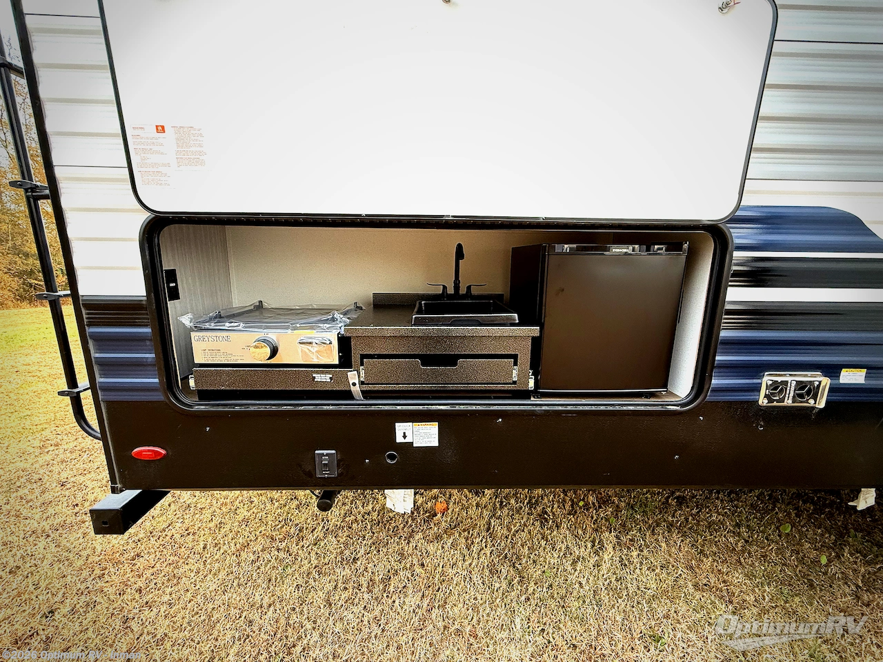 You will be the talk of the campground with this travel trailer! The front private bedroom has a queen bed slide across from a dresser and a front closet plus a second closet with washer and dryer prep . Freshen up each morning in the full bathroom with the 34" x 34" radius shower then head to the kitchen to fry up some eggs with the stainless steel oven and range. You can enjoy your meals at the booth dinette, and the kitchen island will make your clean up easier with the sink that has a high rise faucet and sprayer. The rear private bunkhouse has a 32" x 69" bunk above a jiffy sofa slide, a 36" x 69" bunk above a 36" x 71" bunk and a linen closet. Choose the optional outside mini kitchen for even more convenience!
