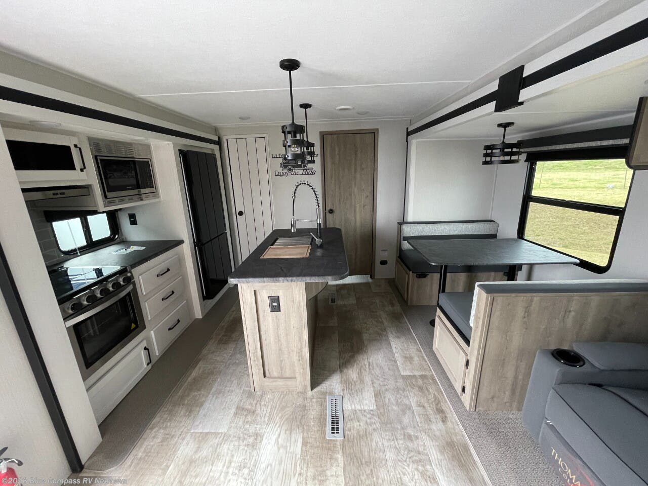 You will be the talk of the campground with this travel trailer! The front private bedroom has a queen bed slide across from a dresser and a front closet plus a second closet with washer and dryer prep. Freshen up each morning in the full bathroom with the 34" x 34" radius shower then head to the kitchen to fry up some eggs with the stainless-steel oven and range. You can enjoy your meals at the booth dinette, and the kitchen island will make your clean up easier with the sink that has a high-rise faucet and sprayer. The rear private bunkhouse has a 32" x 69" bunk above a jiffy sofa slide, a 36" x 69" bunk above a 36" x 71" bunk and a linen closet. Choose one of the outside kitchen options for even more convenience!