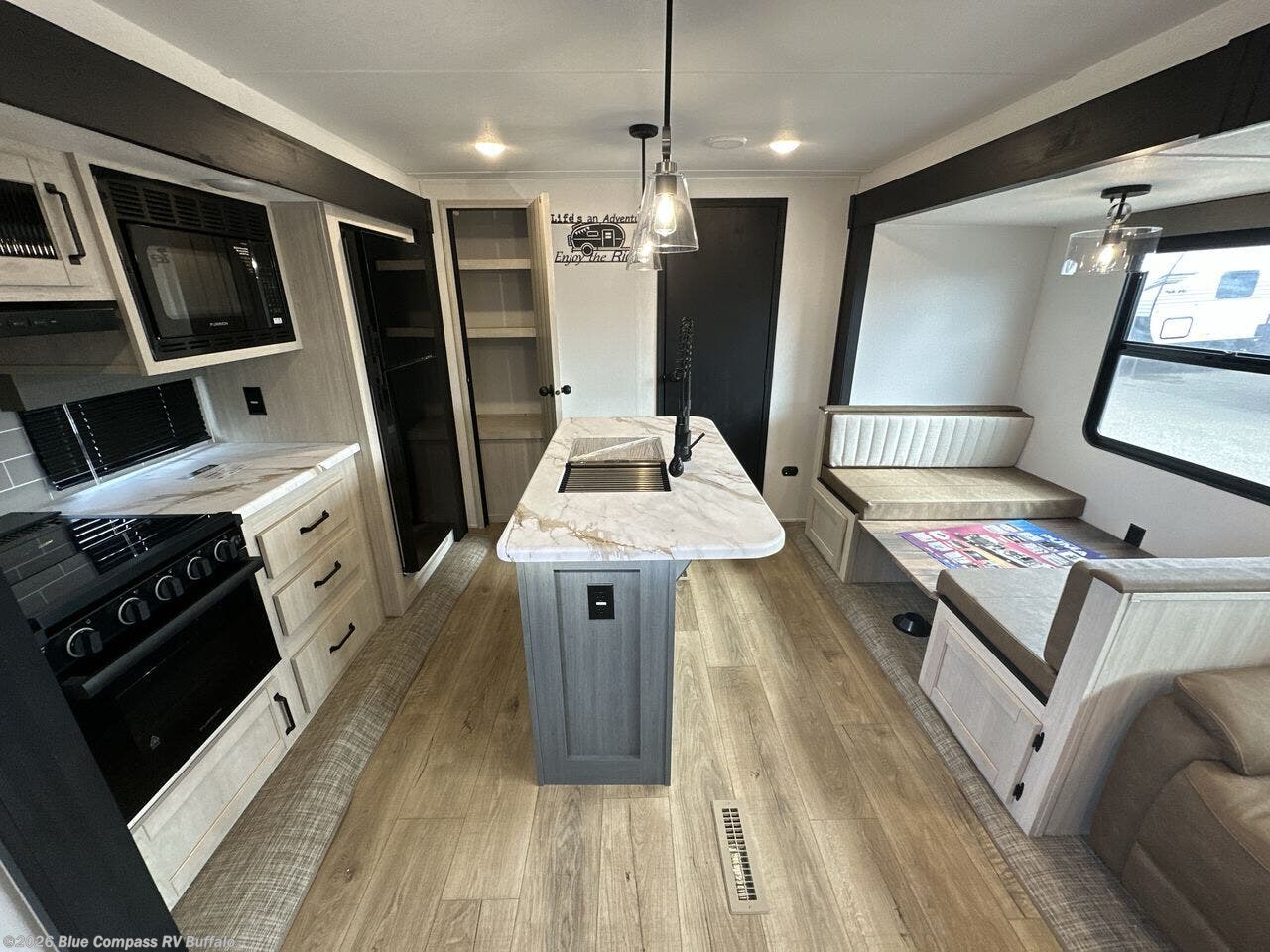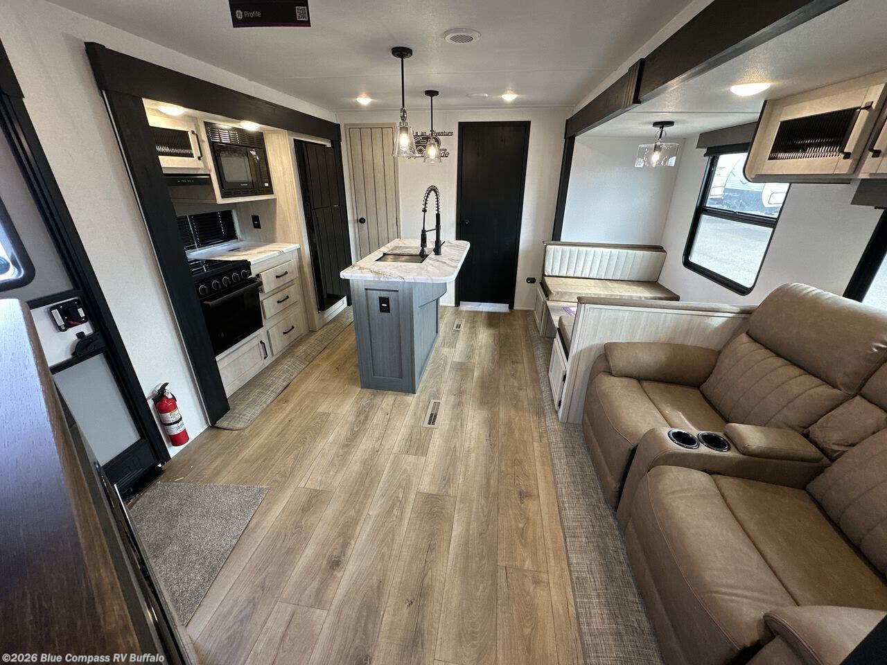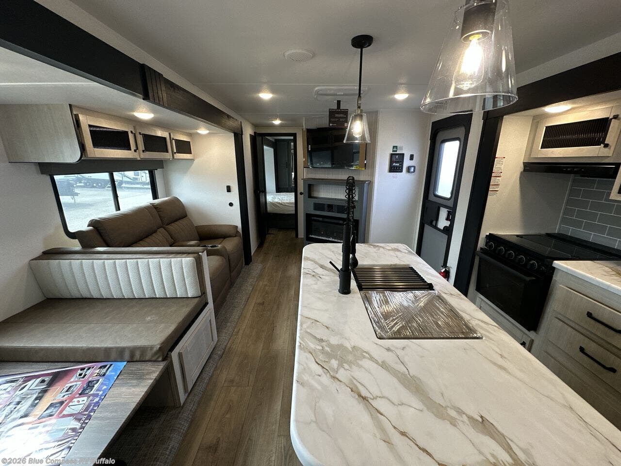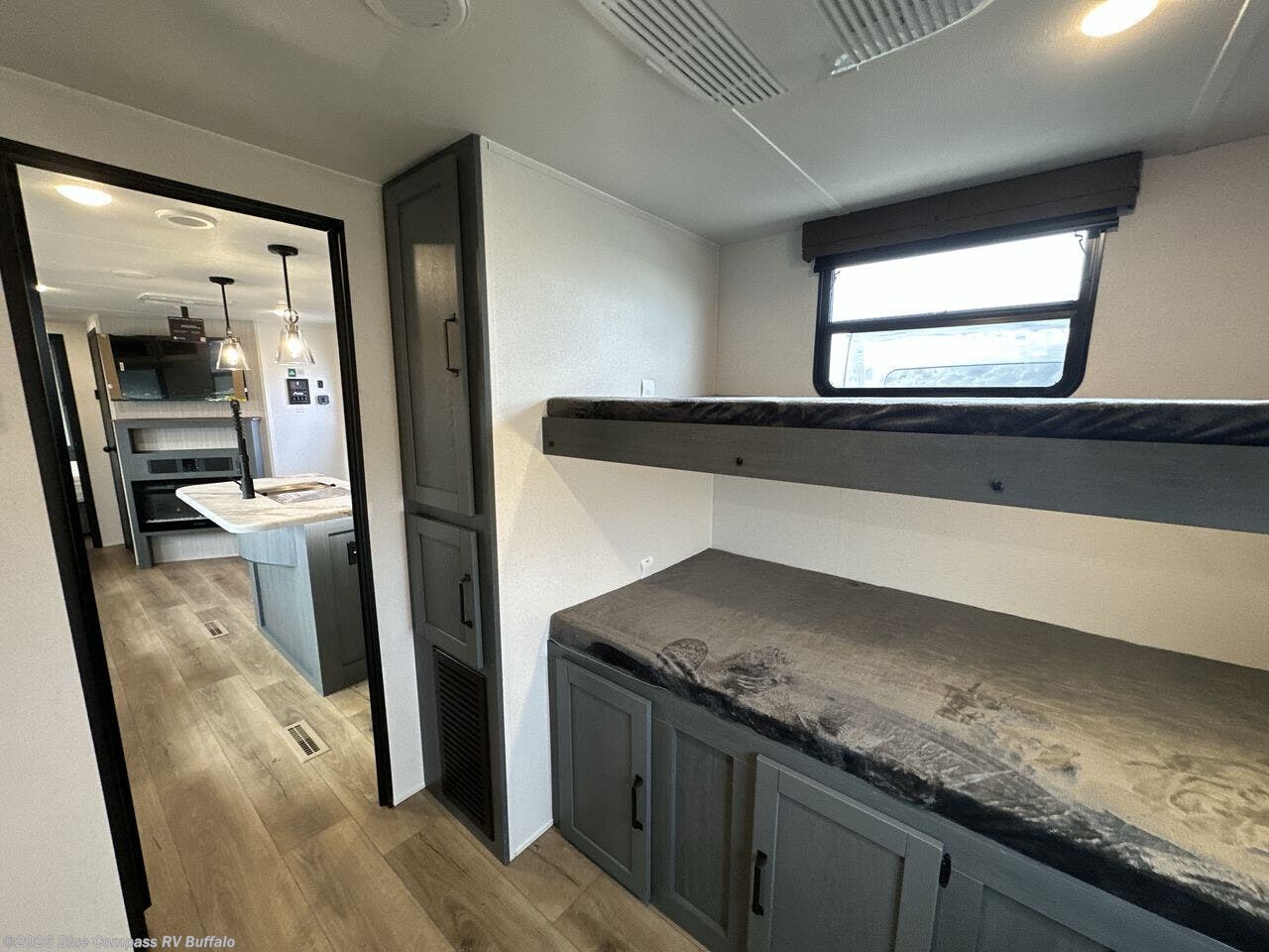 You will be the talk of the campground with this travel trailer! The front private bedroom has a queen bed slide across from a dresser and a front closet plus a second closet with washer and dryer prep. Freshen up each morning in the full bathroom with the 34" x 34" radius shower then head to the kitchen to fry up some eggs with the stainless-steel oven and range. You can enjoy your meals at the booth dinette, and the kitchen island will make your clean up easier with the sink that has a high-rise faucet and sprayer. The rear private bunkhouse has a 32" x 69" bunk above a jiffy sofa slide, a 36" x 69" bunk above a 36" x 71" bunk and a linen closet. Choose one of the outside kitchen options for even more convenience!