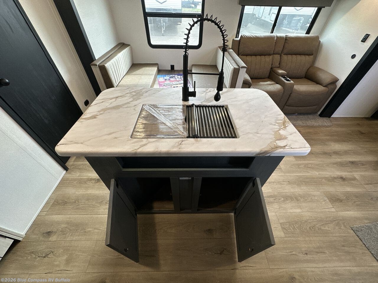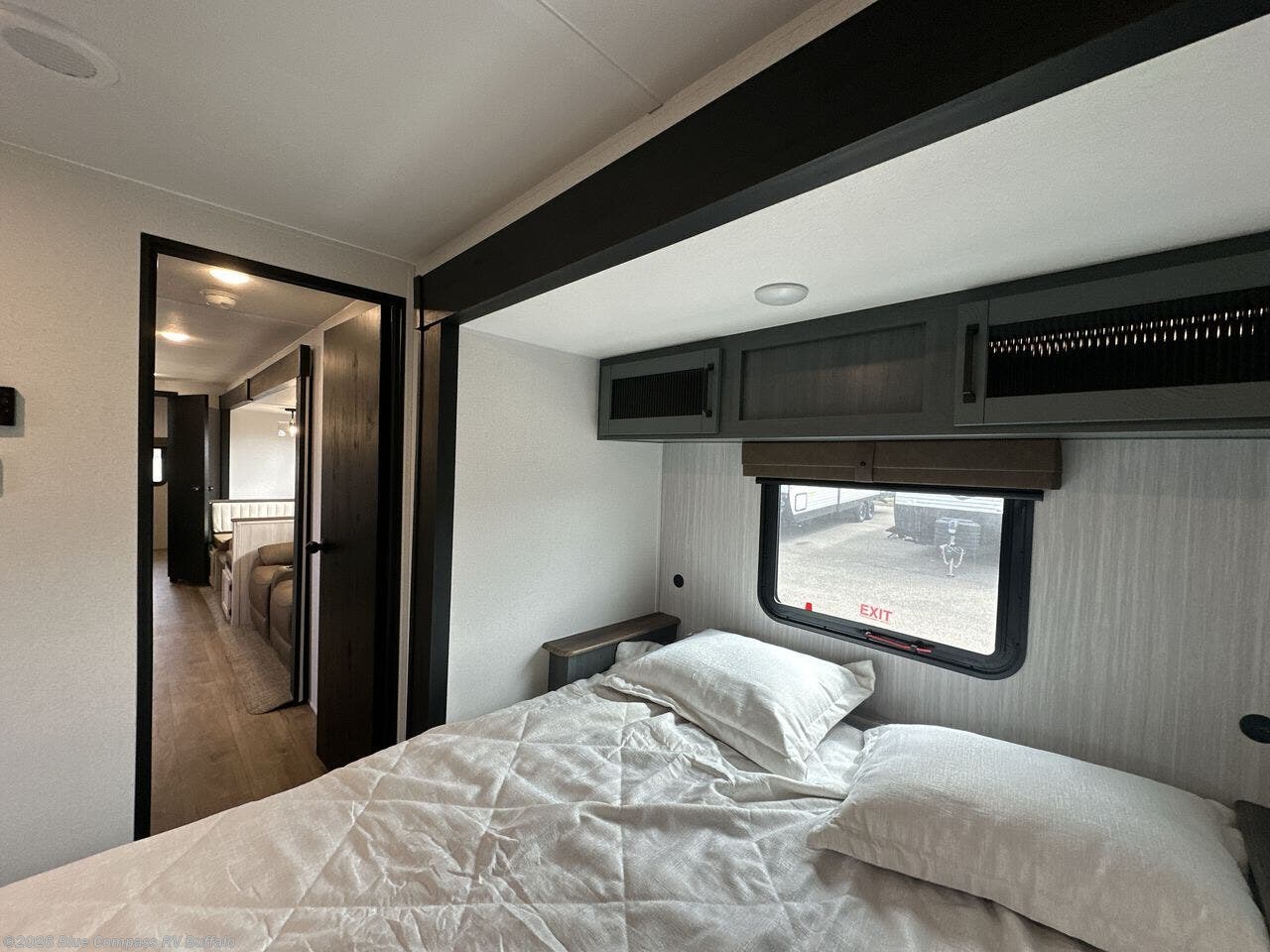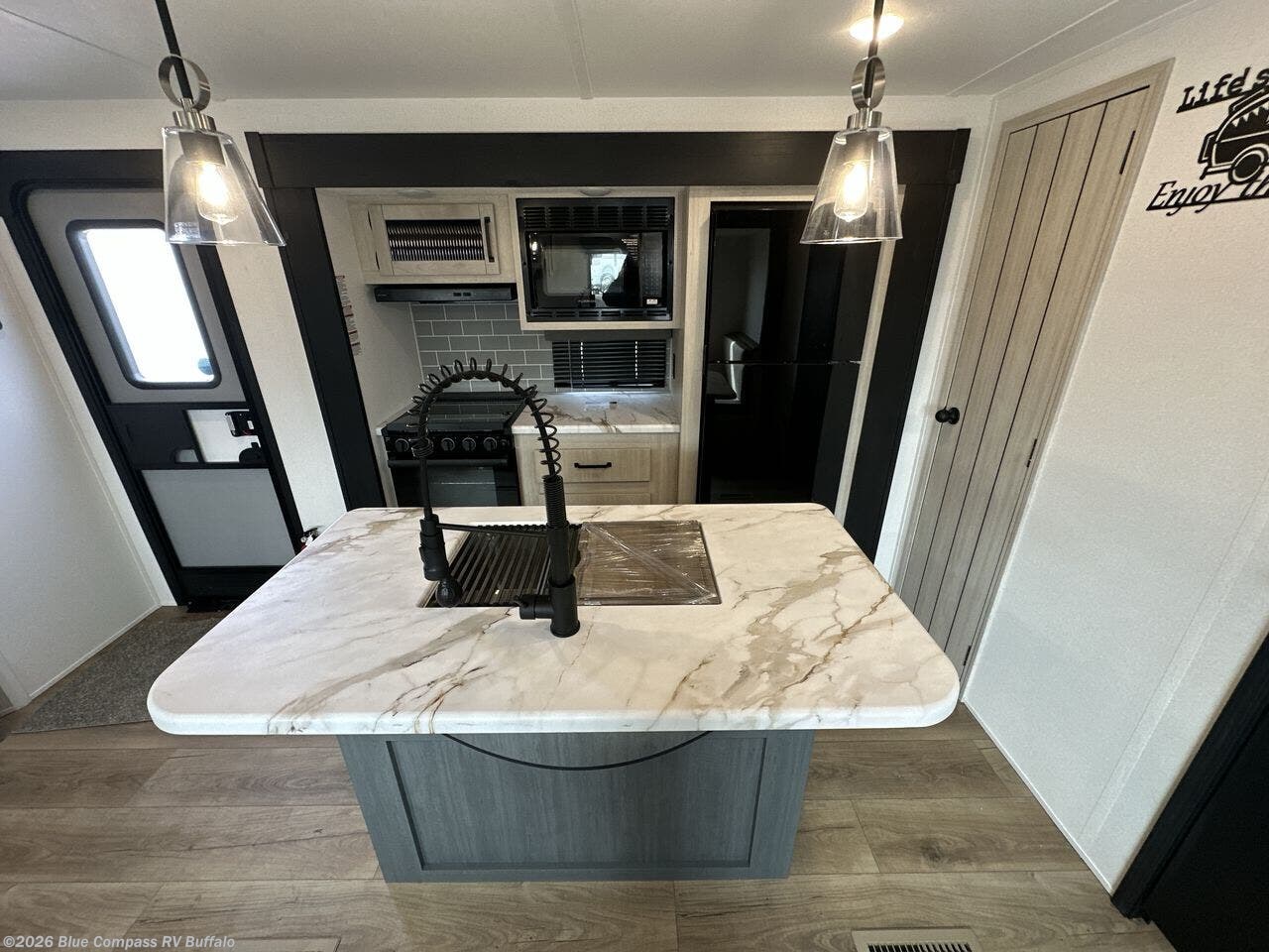 You will be the talk of the campground with this travel trailer! The front private bedroom has a queen bed slide across from a dresser and a front closet plus a second closet with washer and dryer prep. Freshen up each morning in the full bathroom with the 34" x 34" radius shower then head to the kitchen to fry up some eggs with the stainless-steel oven and range. You can enjoy your meals at the booth dinette, and the kitchen island will make your clean up easier with the sink that has a high-rise faucet and sprayer. The rear private bunkhouse has a 32" x 69" bunk above a jiffy sofa slide, a 36" x 69" bunk above a 36" x 71" bunk and a linen closet. Choose one of the outside kitchen options for even more convenience!