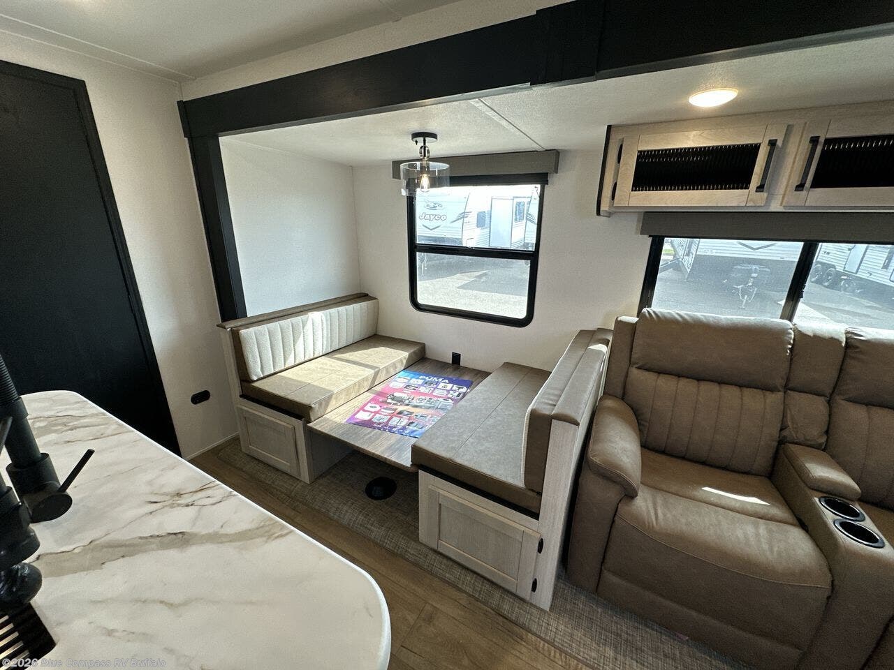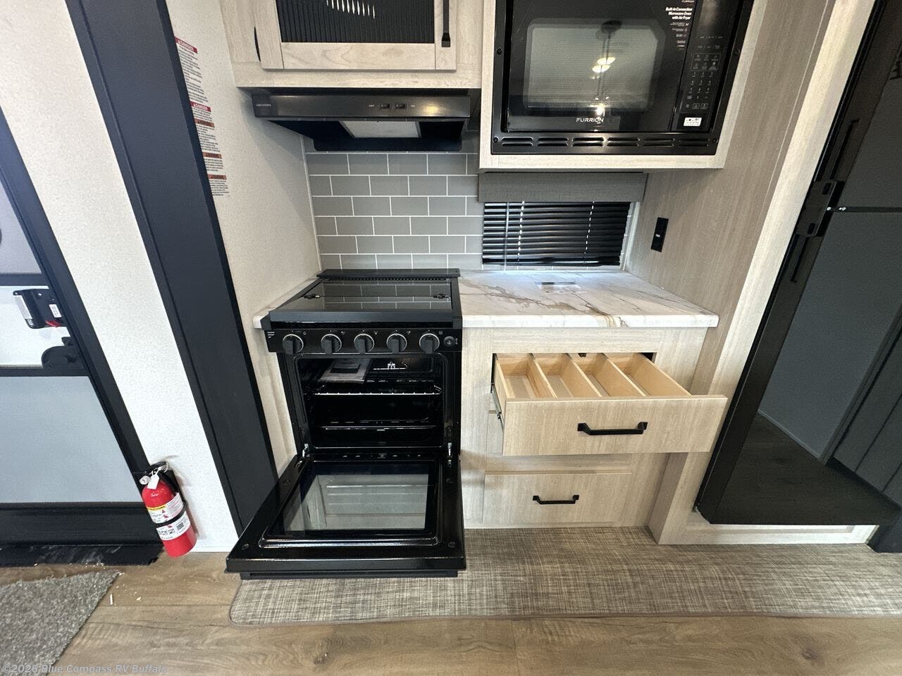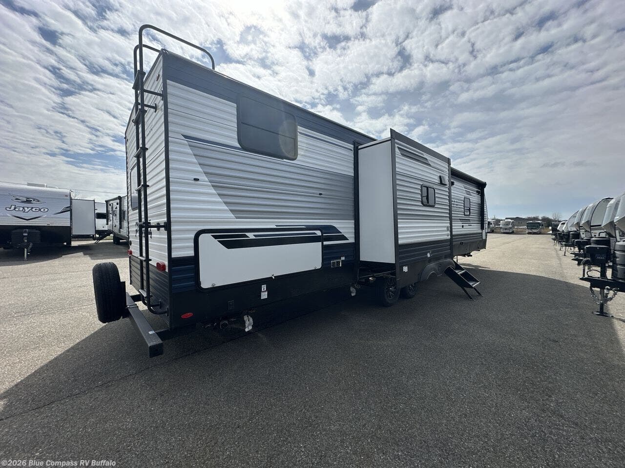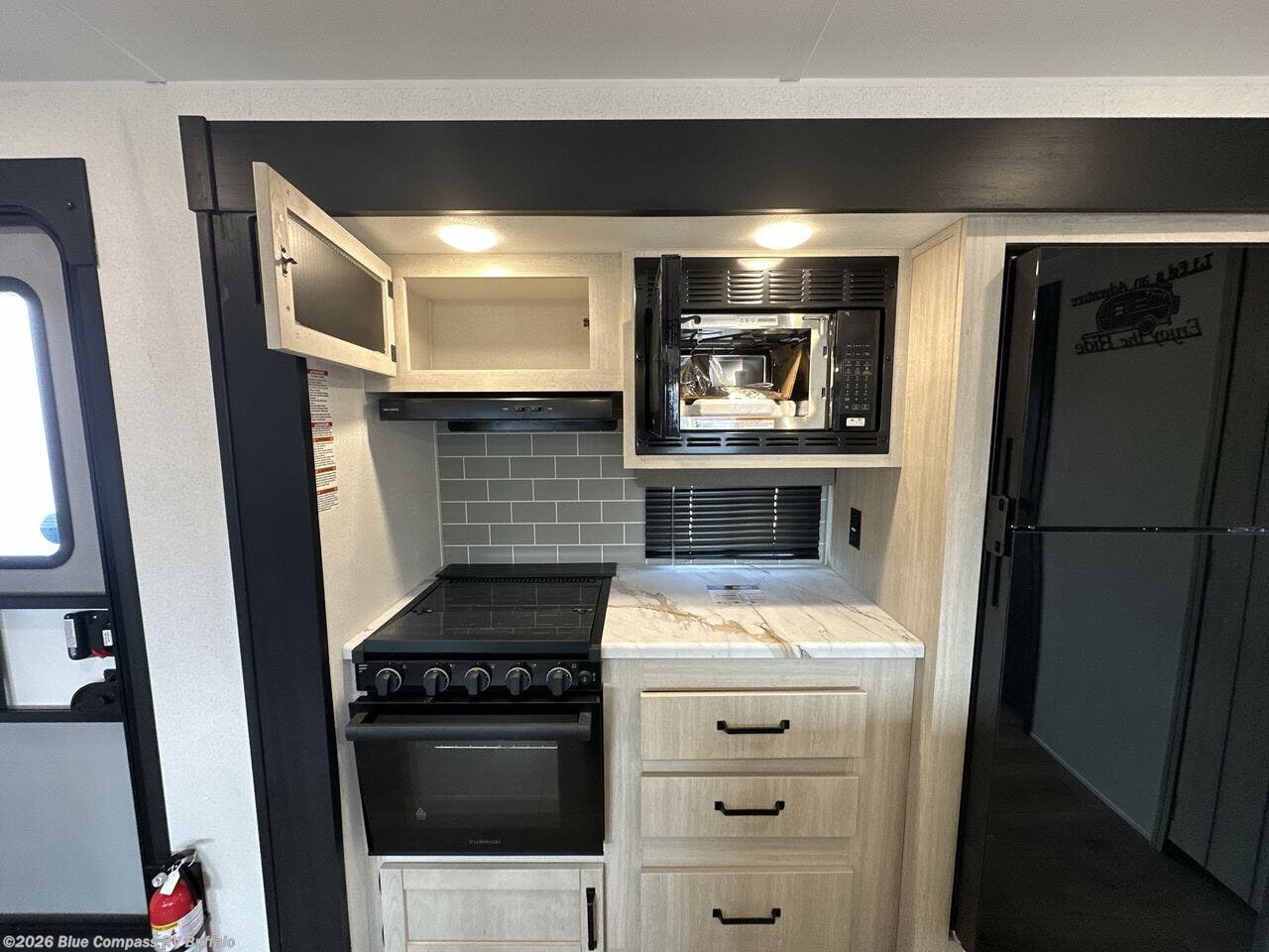 You will be the talk of the campground with this travel trailer! The front private bedroom has a queen bed slide across from a dresser and a front closet plus a second closet with washer and dryer prep. Freshen up each morning in the full bathroom with the 34" x 34" radius shower then head to the kitchen to fry up some eggs with the stainless-steel oven and range. You can enjoy your meals at the booth dinette, and the kitchen island will make your clean up easier with the sink that has a high-rise faucet and sprayer. The rear private bunkhouse has a 32" x 69" bunk above a jiffy sofa slide, a 36" x 69" bunk above a 36" x 71" bunk and a linen closet. Choose one of the outside kitchen options for even more convenience!