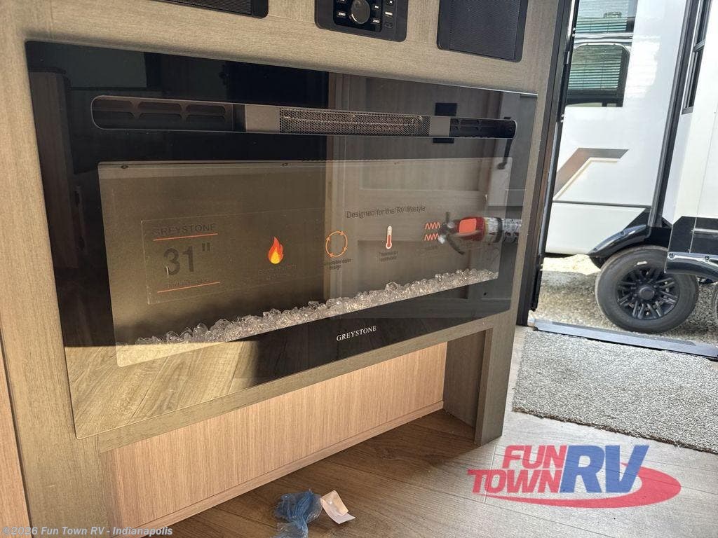 With dual entry doors and a bath and a half, you will have the ultimate in convenience with this travel trailer! The bedroom also has a front closet to keep your clothes looking their best and a queen bed slide for you to sleep your best. Everyone can freshen up in the full bathroom with the 34" x 34" radius shower and fill their bellies with scrambled eggs cooked with the stainless steel oven and range. Enjoy your meals, play games, and even sleep at the booth dinette or relax on the sofa while watching a movie with the entertainment center and fireplace. And your guests will love the rear private bunkhouse with three bunks, a jiffy sofa, and a slide out for more space! This model also includes an optional outside mini kitchen with a griddle!