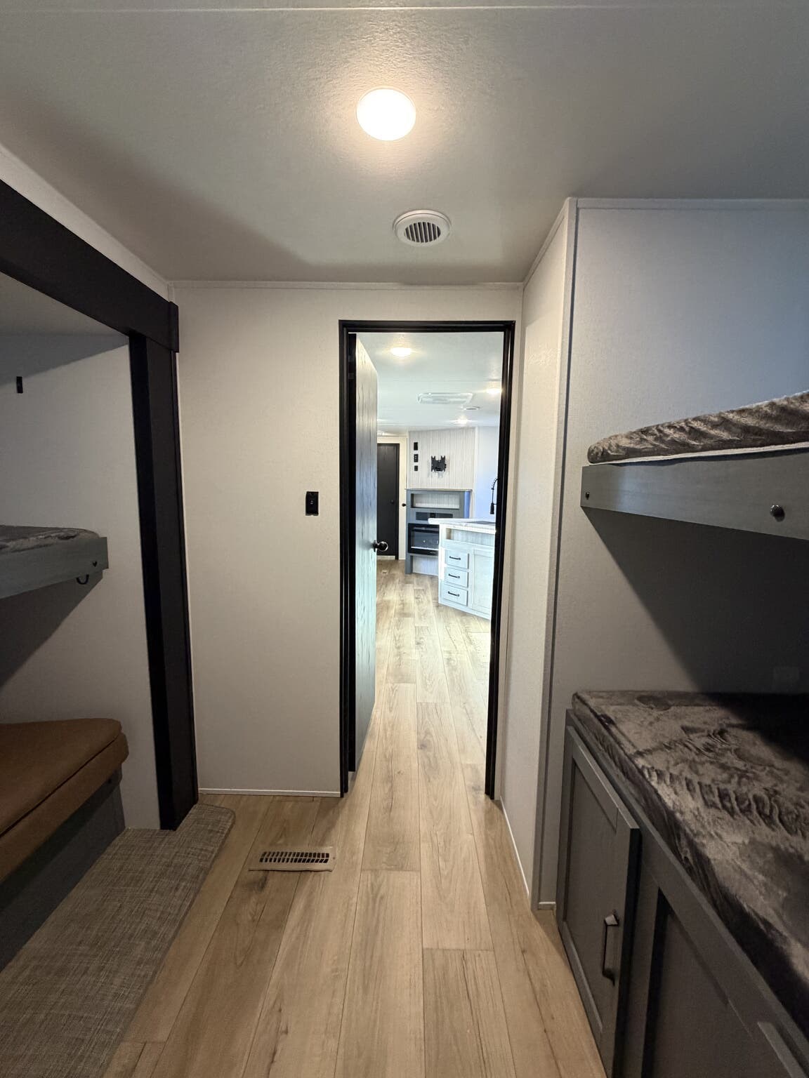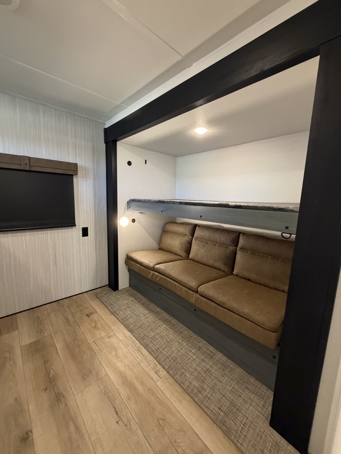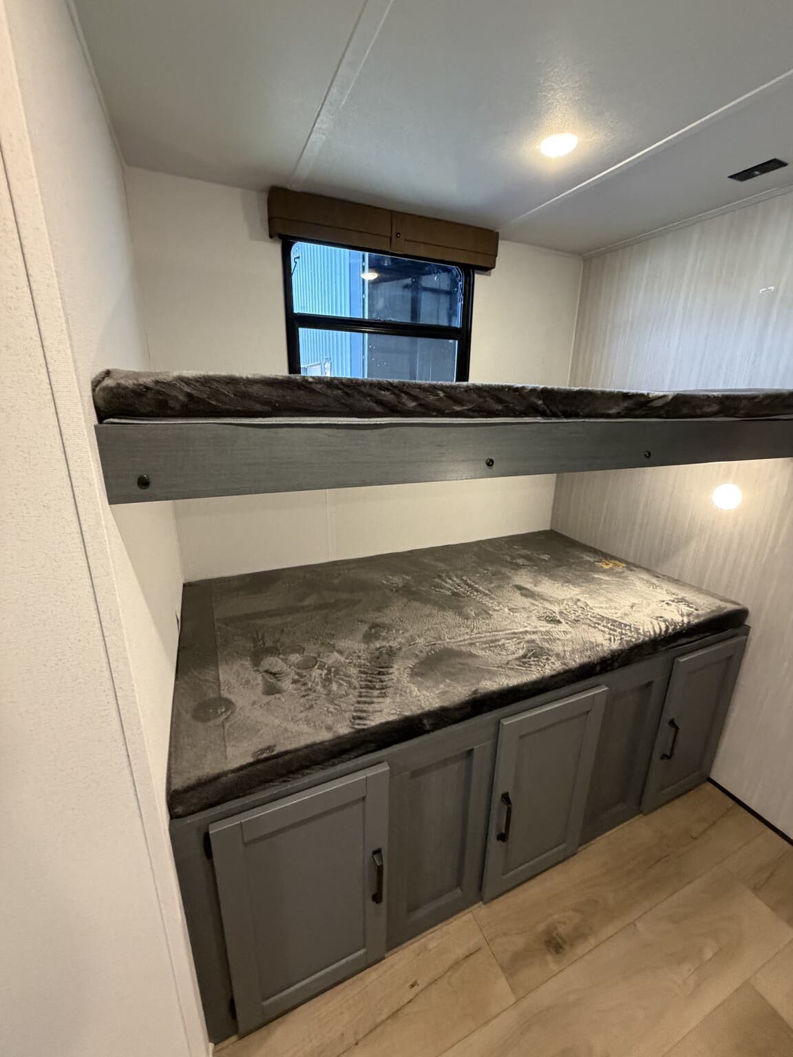 Booth Dinette, Bunk Beds, Dinette, Dinette Bed, Glass Shower Door, Kitchen Sink, Queen Bed, Roof Vents, Shower, Sofa Bed, Toilet