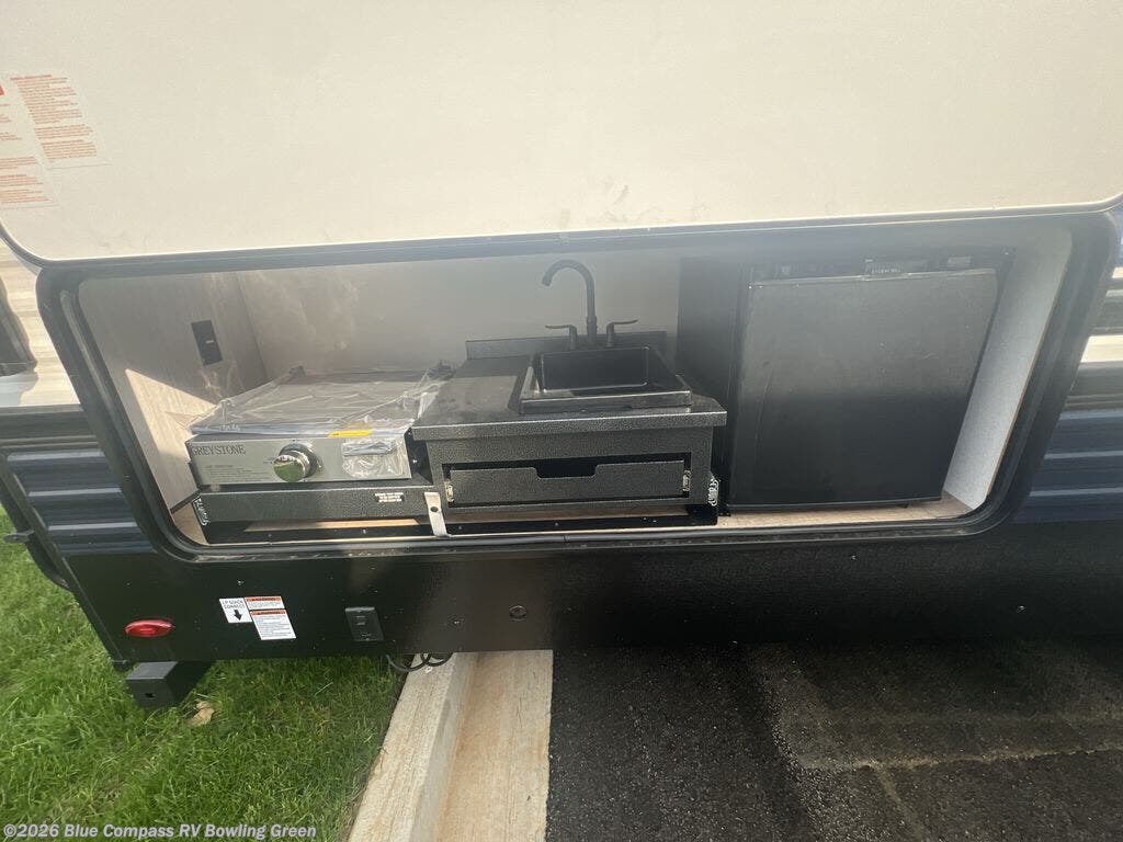 With dual entry doors and a bath and a half, you will have the ultimate in convenience with this travel trailer! The bedroom also has a front closet to keep your clothes looking their best and a queen bed slide for you to sleep your best. Everyone can freshen up in the full bathroom with the 34" x 34" radius shower and fill their bellies with scrambled eggs cooked with the stainless steel oven and range. Enjoy your meals, play games, and even sleep at the booth dinette or relax on the sofa while watching a movie with the entertainment center and fireplace. And your guests will love the rear private bunkhouse with three bunks, a jiffy sofa, and a slide out for more space! This model also includes an optional outside mini kitchen with a griddle!