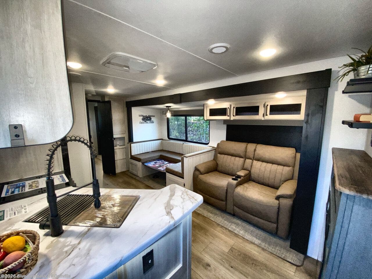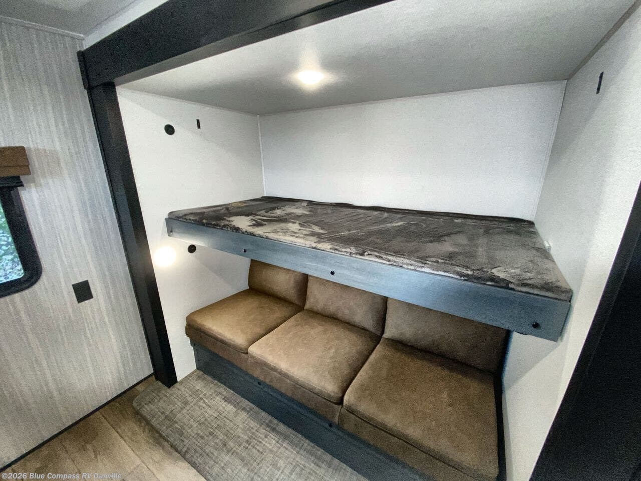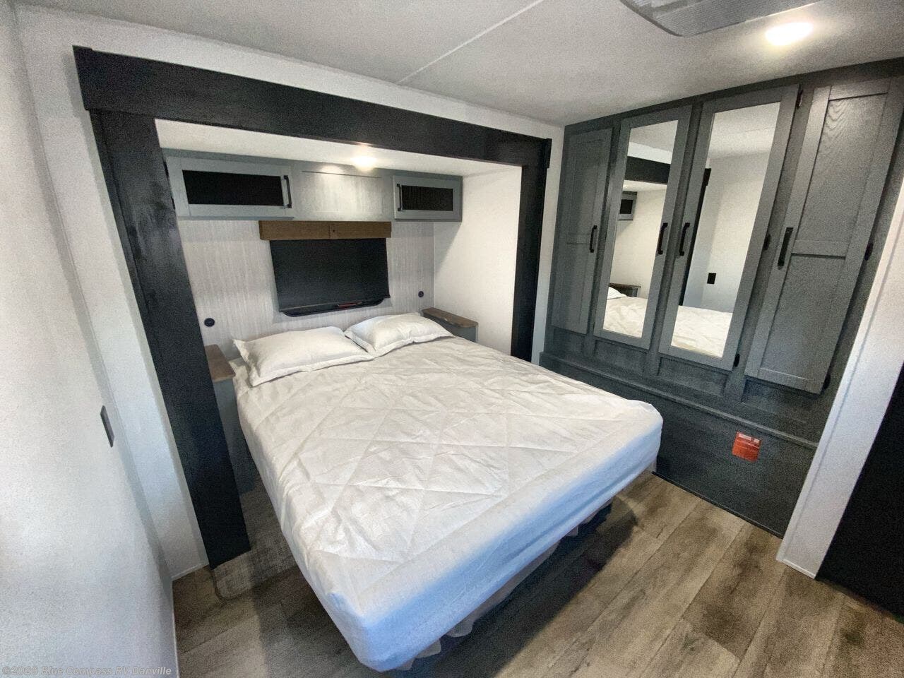 The whole family will love camping in this travel trailer! The kids will have their own privacy with the rear private bunkhouse which has a 32" x 69" bunk above a jiffy sofa slide and a 38" x 76" bunk above an entertainment center to keep them occupied on those rainy days. And you will have your own privacy with the front private bedroom that has a queen bed slide across from a dresser and a front closet. There is even a second closet with washer and dryer prep if you choose to add those appliances. Everyone can stay clean in the full bathroom with the 34" x 34" radius shower and their bellies full with the full kitchen. And you can choose between two outside kitchen options for even more convenience!