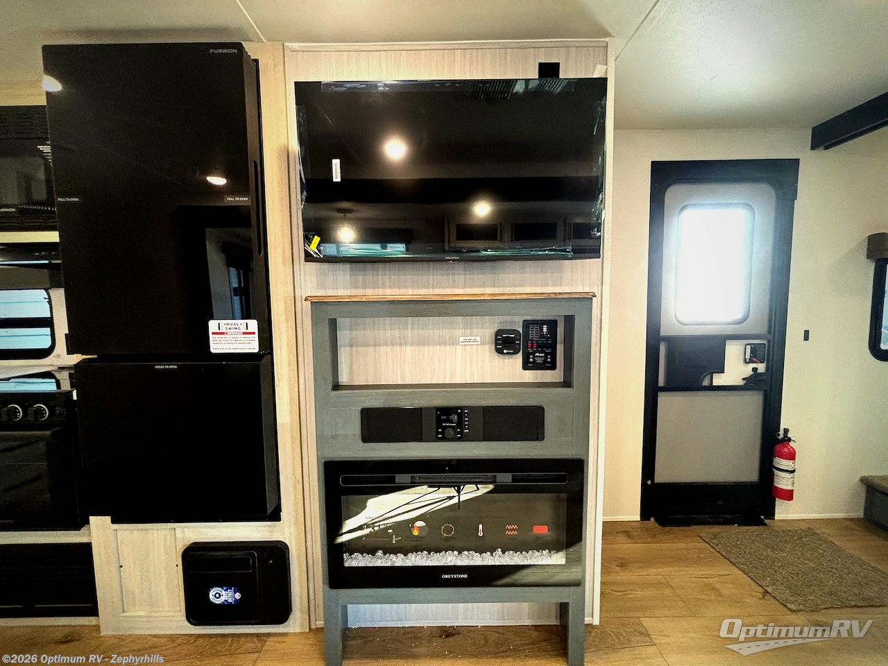 This travel trailer is perfect for camping with a larger group of friends or if you have older kids since there are two private bunkrooms! Each room includes a bunk bed and storage space for clothes, shoes, and more. You'll enjoy your own space up front in the master bedroom that includes a queen bed, dual shirt closets, and one of the dual entry doors to the unit for added convenience. Everyone can come together in the combined living area and kitchen that includes a large slide out with a sofa and booth dinette, plus there is a fireplace to make this space feel more like home. A full kitchen inside lets you create home-cooked meals each day, and you can choose to add the optional micro kitchen with a griddle for a pancake breakfast outdoors!