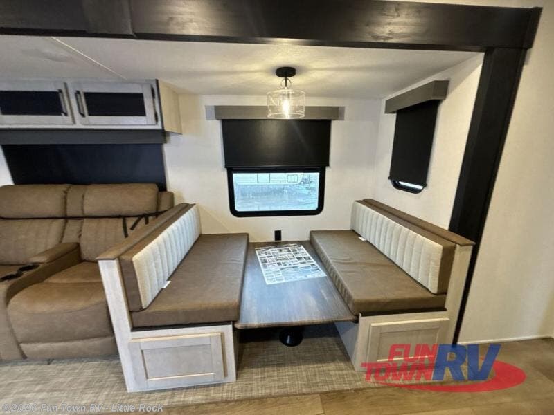 This travel trailer is perfect for camping with a larger group of friends or if you have older kids since there are two private bunkrooms! Each room includes a bunk bed and storage space for clothes, shoes, and more. You'll enjoy your own space up front in the master bedroom that includes a queen bed, dual shirt closets, and one of the dual entry doors to the unit for added convenience. Everyone can come together in the combined living area and kitchen that includes a large slide out with a sofa and booth dinette, plus there is a fireplace to make this space feel more like home. A full kitchen inside lets you create home-cooked meals each day, and you can choose to add the optional micro kitchen with a griddle for a pancake breakfast outdoors!