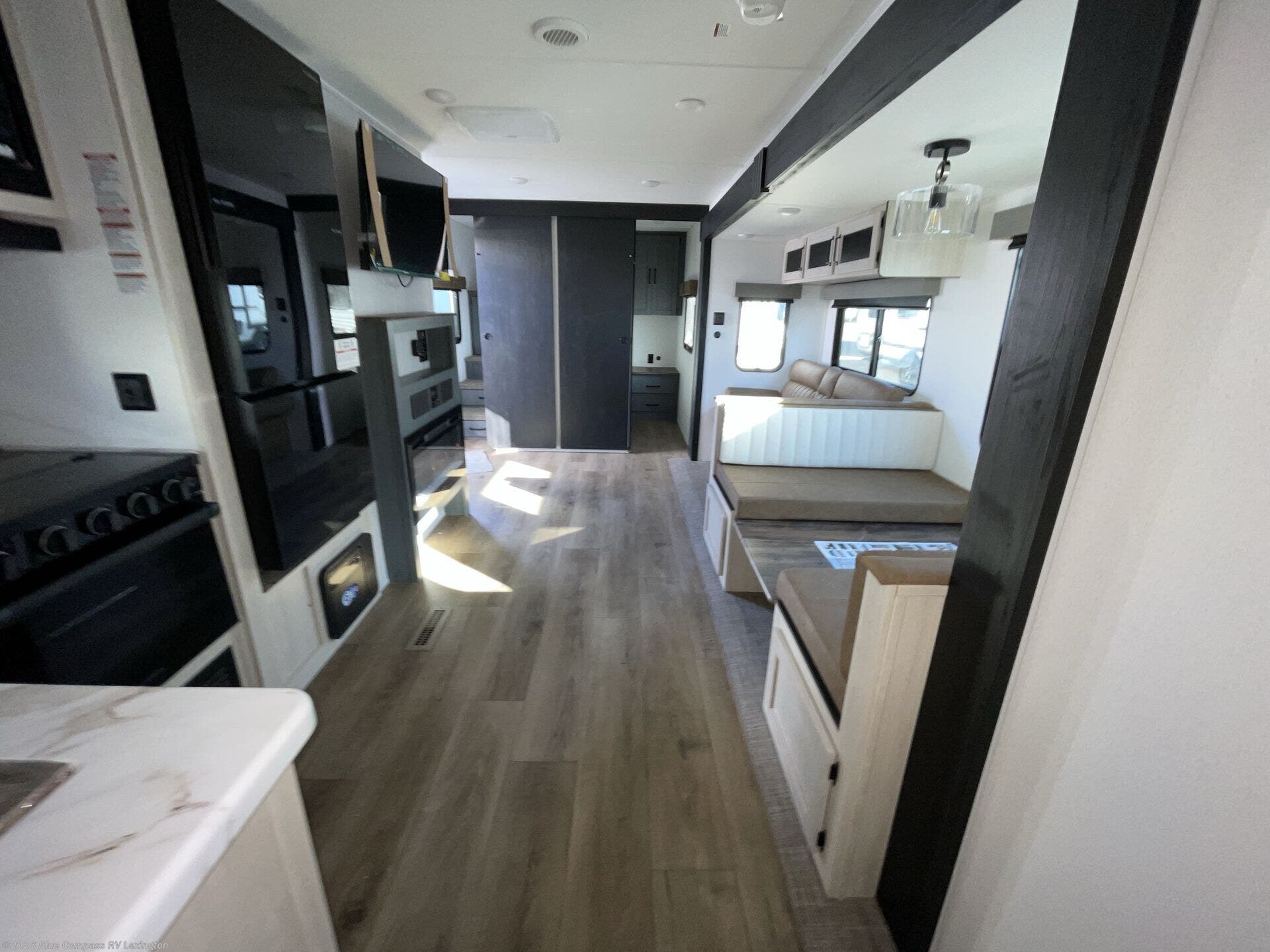 This travel trailer is perfect for camping with a larger group of friends or if you have older kids since there are two private bunkrooms! Each room includes a bunk bed and storage space for clothes, shoes, and more. You'll enjoy your own space up front in the master bedroom that includes a queen bed, dual shirt closets, and one of the dual entry doors to the unit for added convenience. Everyone can come together in the combined living area and kitchen that includes a large slide out with a sofa and booth dinette, plus there is a fireplace to make this space feel more like home. And a full kitchen lets you create home-cooked meals each day.