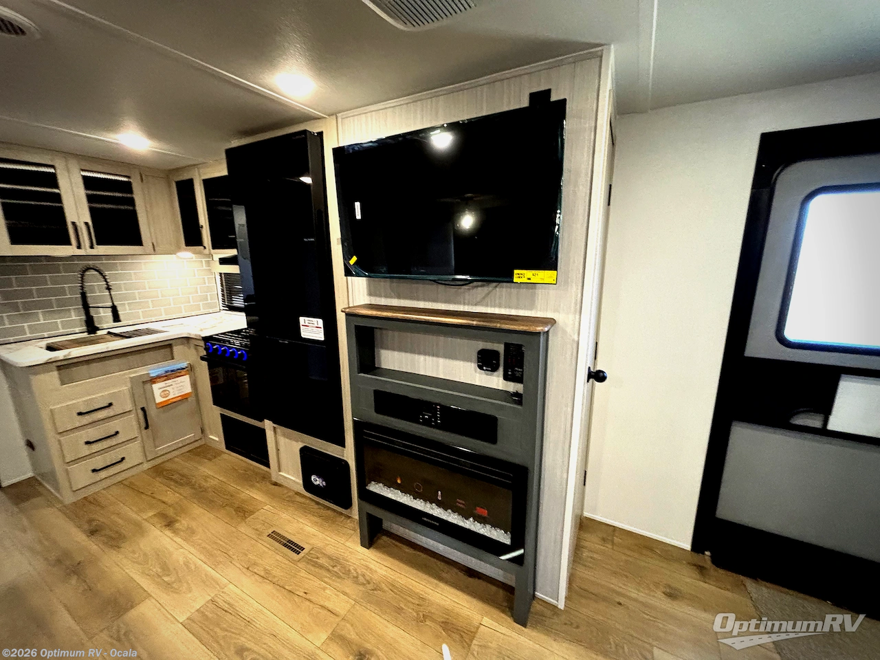 This travel trailer is perfect for camping with a larger group of friends or if you have older kids since there are two private bunkrooms! Each room includes a bunk bed and storage space for clothes, shoes, and more. You'll enjoy your own space up front in the master bedroom that includes a queen bed, dual shirt closets, and one of the dual entry doors to the unit for added convenience. Everyone can come together in the combined living area and kitchen that includes a large slide out with a sofa and booth dinette, plus there is a fireplace to make this space feel more like home. And a full kitchen lets you create home-cooked meals each day.