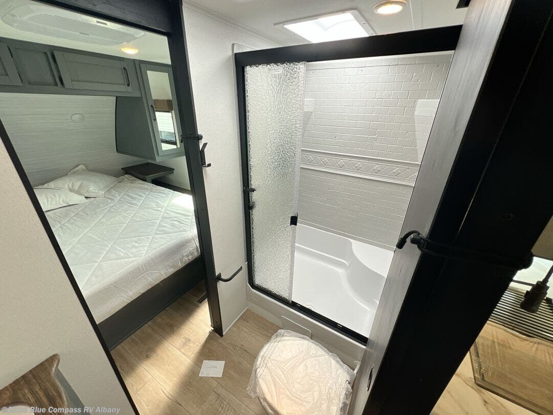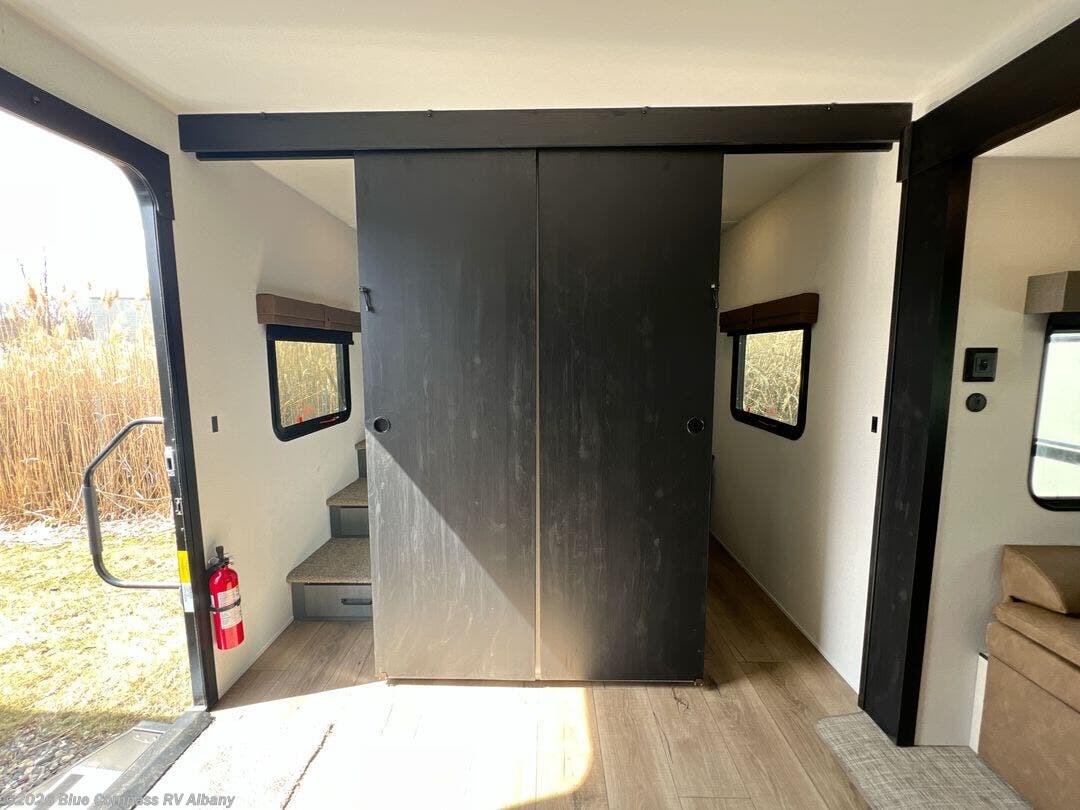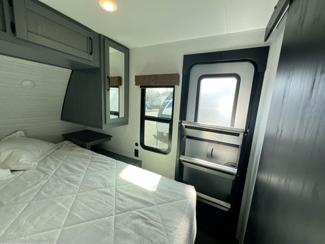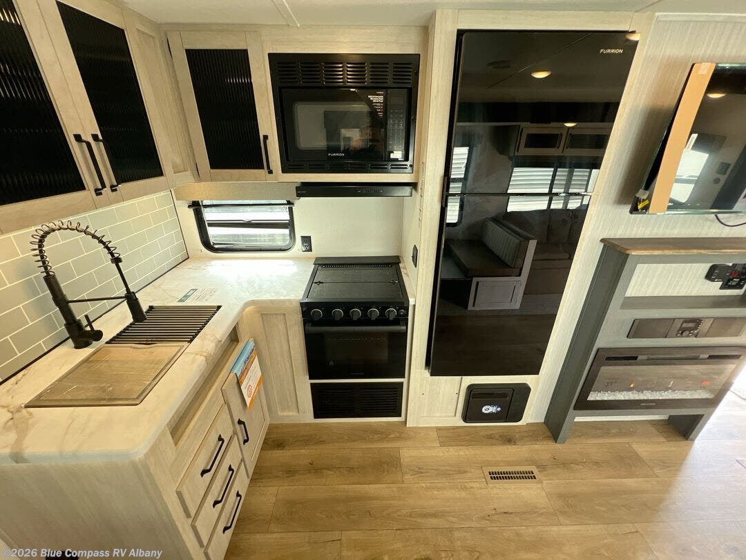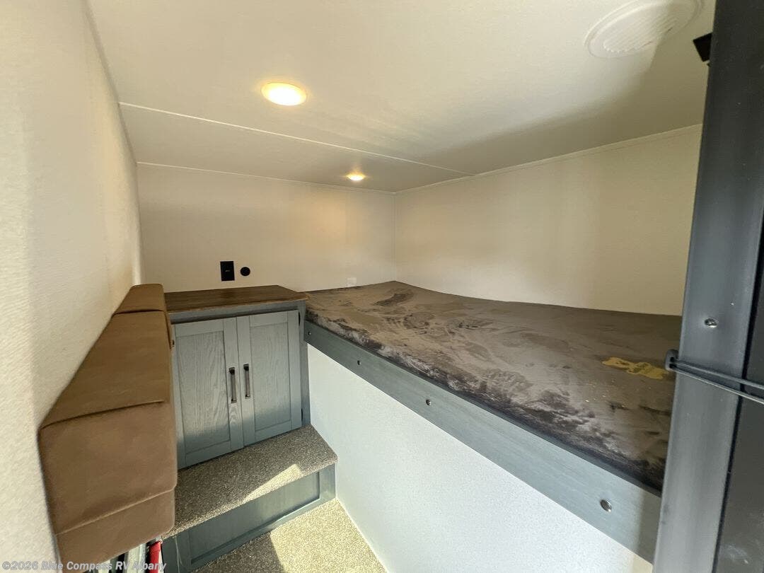 This travel trailer is perfect for camping with a larger group of friends or if you have older kids since there are two private bunkrooms! Each room includes a bunk bed and storage space for clothes, shoes, and more. You'll enjoy your own space up front in the master bedroom that includes a queen bed, dual shirt closets, and one of the dual entry doors to the unit for added convenience. Everyone can come together in the combined living area and kitchen that includes a large slide out with a sofa and booth dinette, plus there is a fireplace to make this space feel more like home. And a full kitchen lets you create home-cooked meals each day.