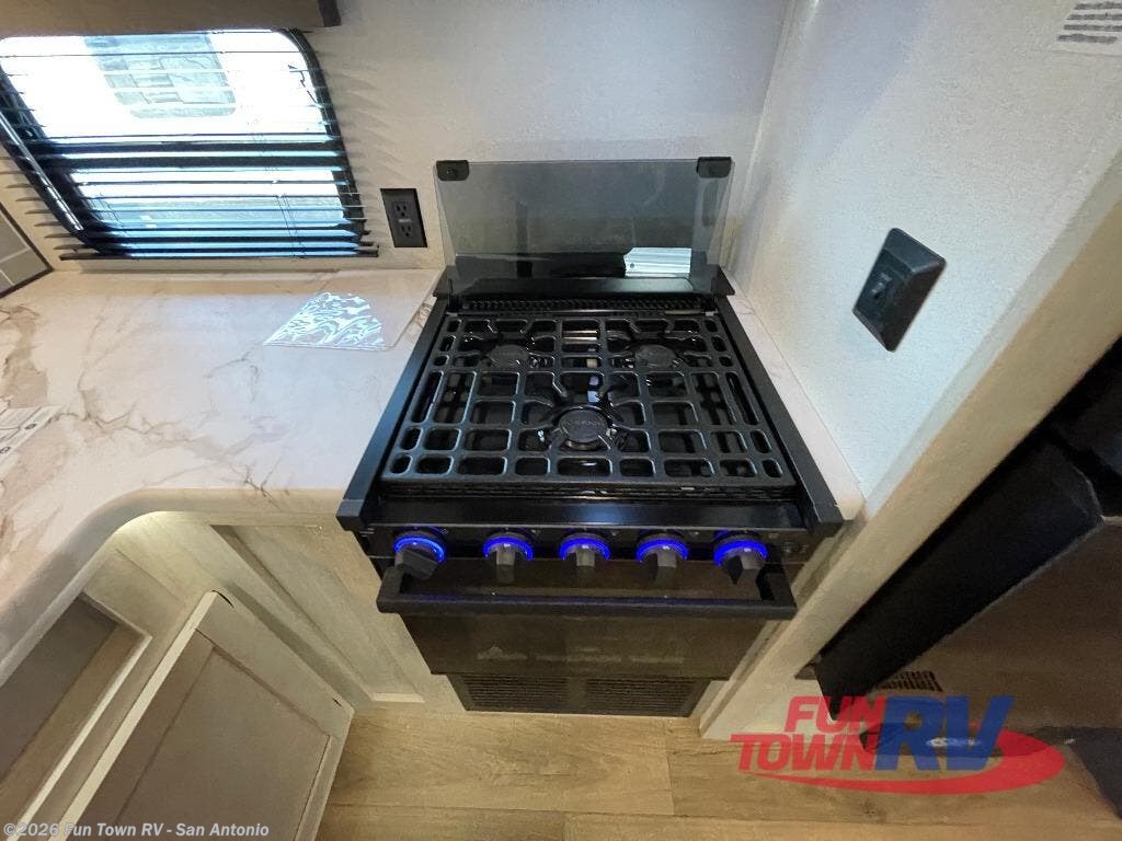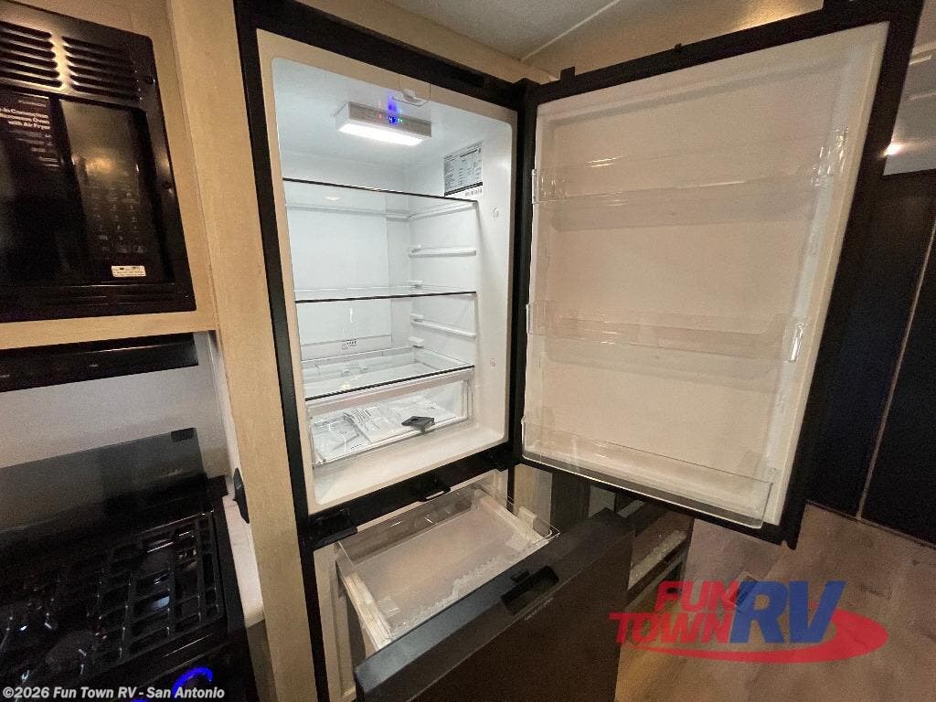 This travel trailer is perfect for camping with a larger group of friends or if you have older kids since there are two private bunkrooms! Each room includes a bunk bed and storage space for clothes, shoes, and more. You'll enjoy your own space up front in the master bedroom that includes a queen bed, dual shirt closets, and one of the dual entry doors to the unit for added convenience. Everyone can come together in the combined living area and kitchen that includes a large slide out with a sofa and booth dinette, plus there is a fireplace to make this space feel more like home. A full kitchen inside lets you create home-cooked meals each day, and you can choose to add the optional micro kitchen with a griddle for a pancake breakfast outdoors!