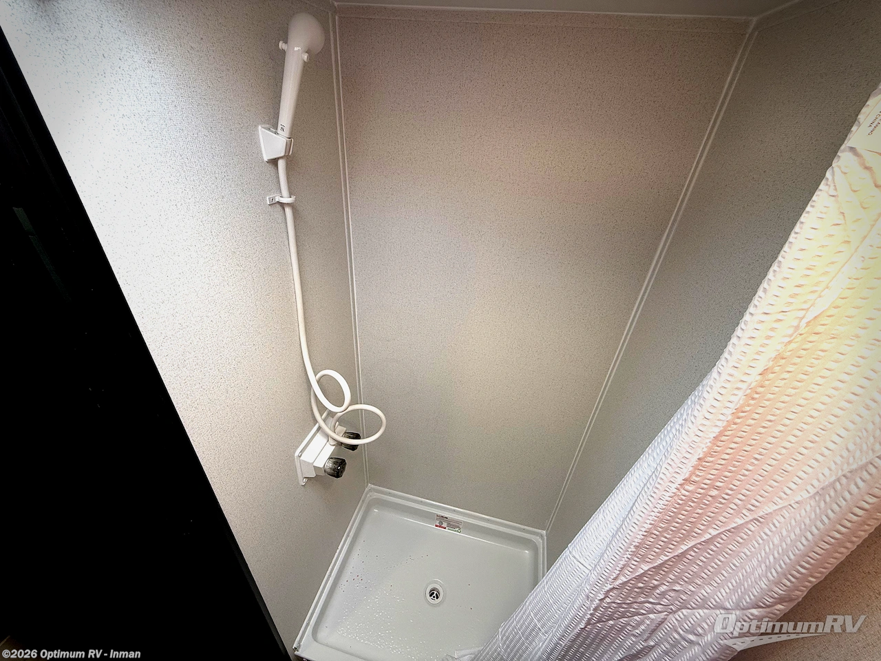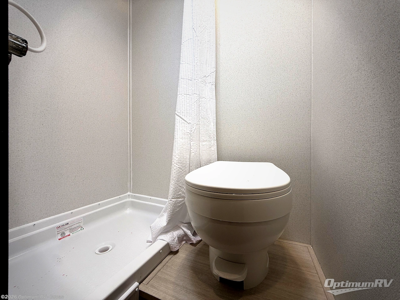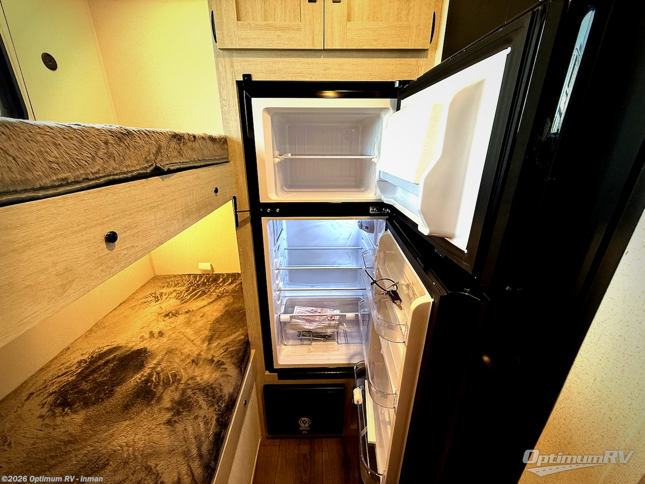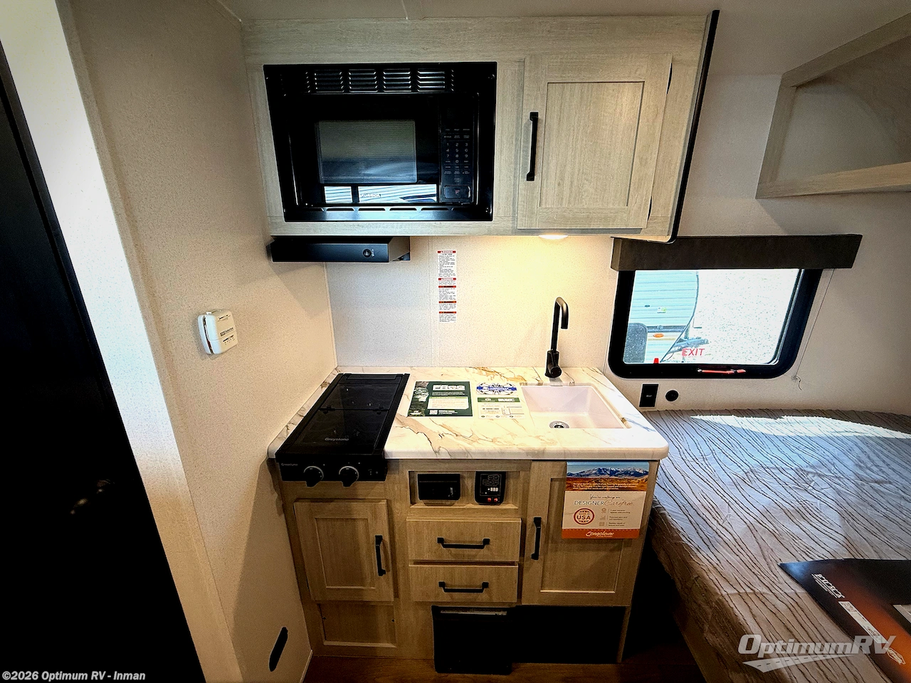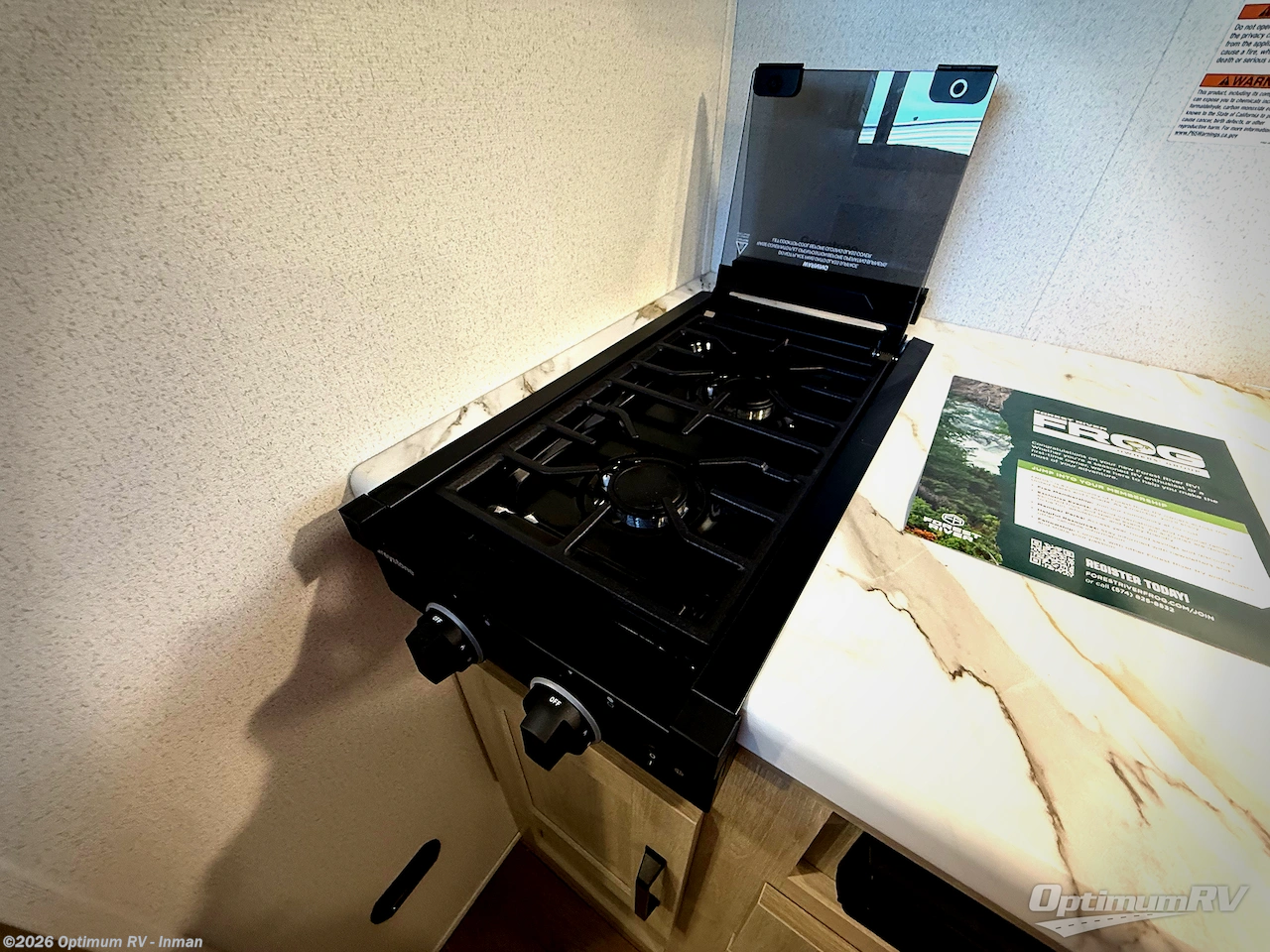 It will be so easy to enjoy camping trips in this single axle travel trailer! There is a front RV queen bed with flip-up storage at the foot of the bed for your belongings, and any additional guests can sleep on the 29" x 70" bunk beds. A full kitchen includes a stainless two burner cooktop and stainless microwave to cook meals each day, and the 4.3 cu. ft. 12V black glass refrigerator will keep your food fresh. And a private bath with a toilet and shower will let you freshen up without having to use the camp's facilities!
