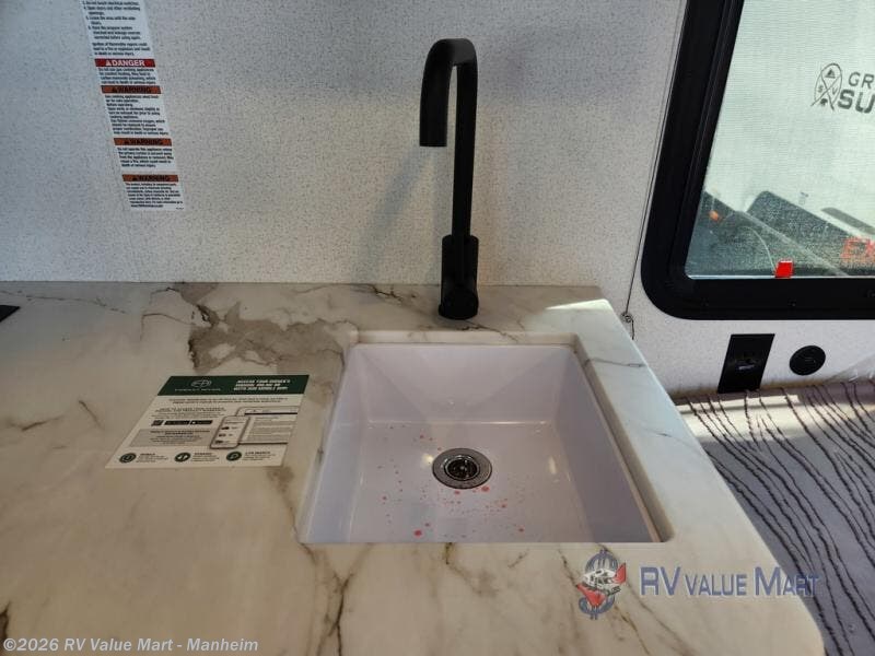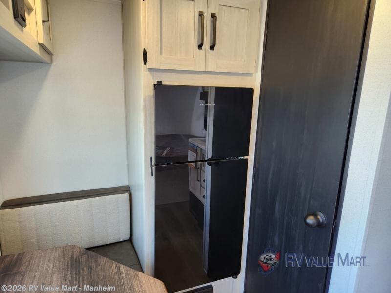 It will be so easy to enjoy camping trips in this single axle travel trailer! There is a front RV queen bed with flip-up storage at the foot of the bed for your belongings, and any additional guests can sleep on the booth dinette with an open shelf above. A full kitchen includes a stainless two burner cooktop and stainless microwave to cook meals each day, and the 4.3 cu. ft. 12V black glass refrigerator will keep your food fresh. And a private bath includes a 24" x 32" shower to clean off after a day outdoors!