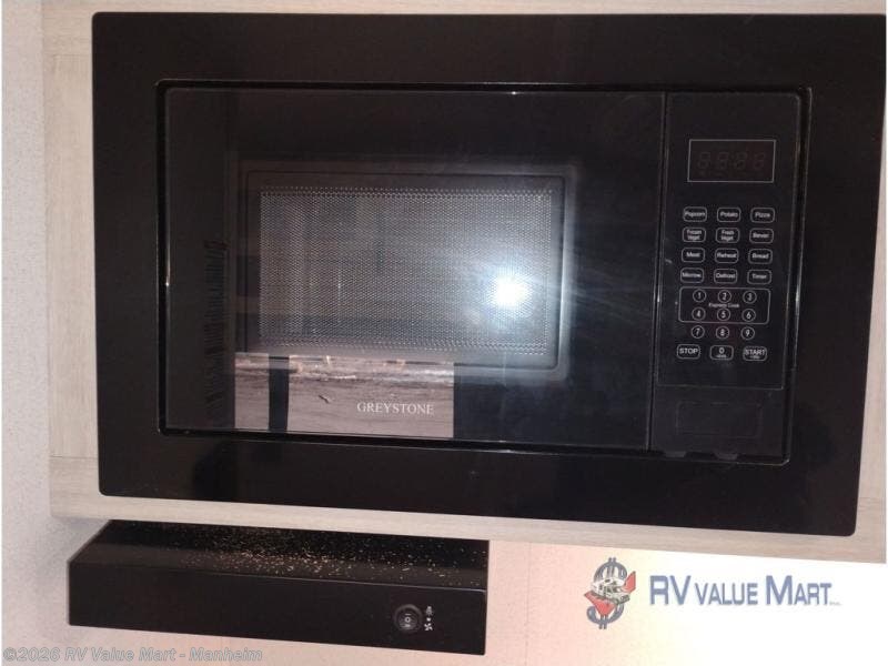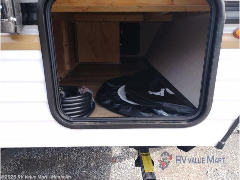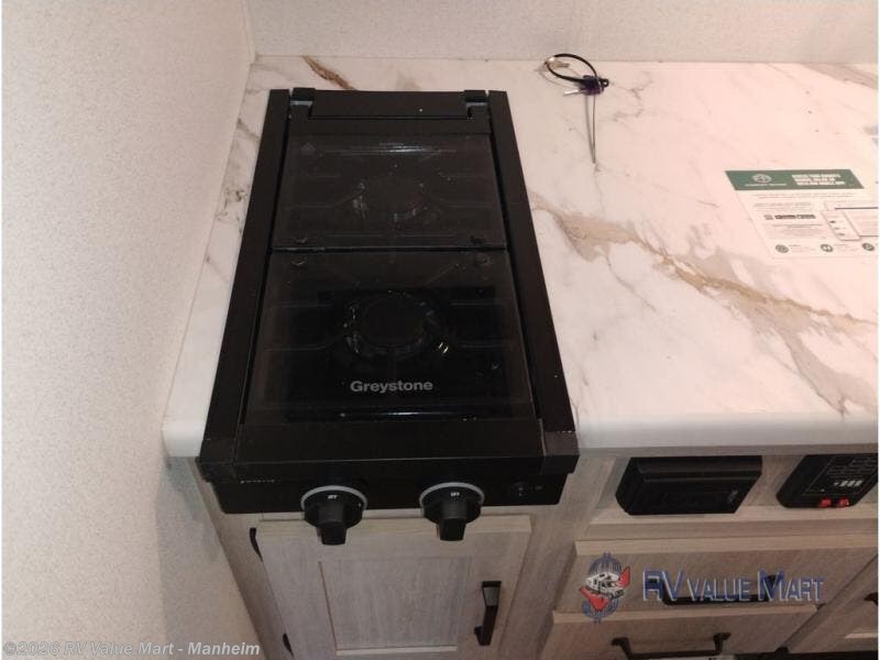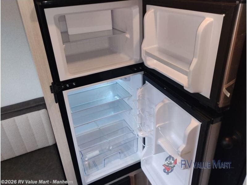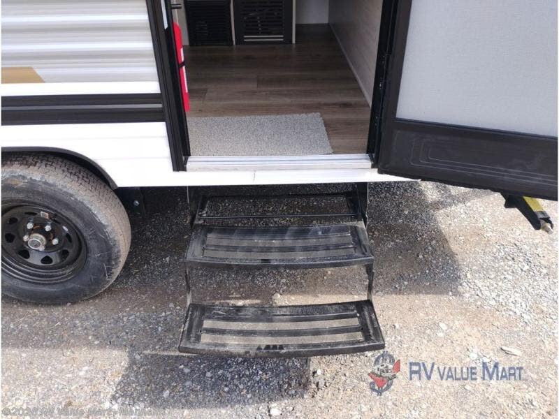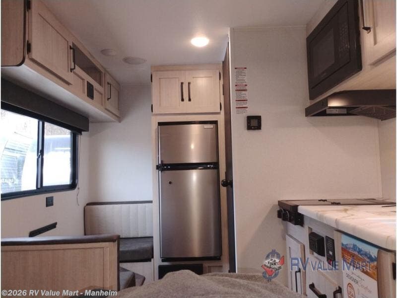 It will be so easy to enjoy camping trips in this single axle travel trailer! There is a front RV queen bed with flip-up storage at the foot of the bed for your belongings, and any additional guests can sleep on the booth dinette with an open shelf above. A full kitchen includes a two-burner cooktop and microwave to cook meals each day, and the 12V black glass refrigerator will keep your food fresh. And a private bath includes a 24" x 32" shower to clean off after a day outdoors!