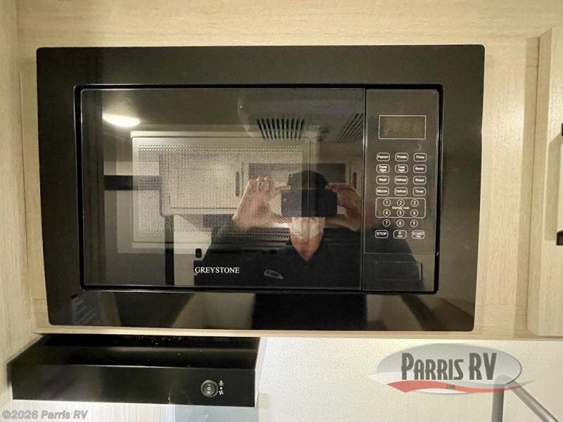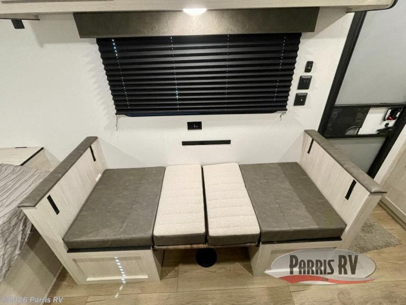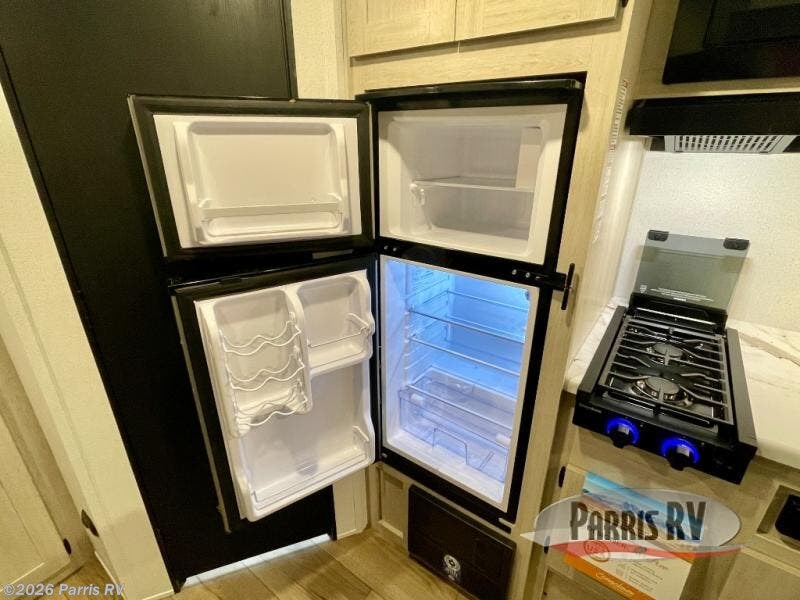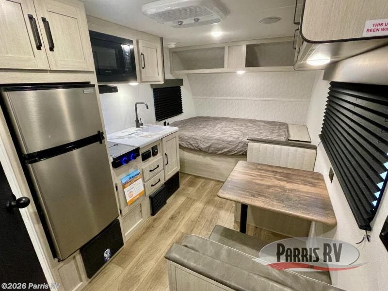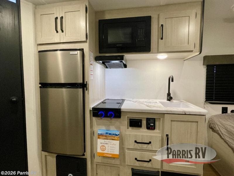 It will be so easy to enjoy camping trips in this single axle travel trailer! There is a front RV queen bed with flip-up storage at the foot of the bed for your belongings, and an additional guest or two little ones can sleep on the booth dinette when it's not being used to dine at. A full kitchen includes a stainless two burner cooktop and stainless microwave to cook meals each day, and the 4.3 cu. ft. 12V black glass refrigerator will keep your food fresh. And a private bath with a toilet and shower will let you freshen up without having to use the camp's facilities!