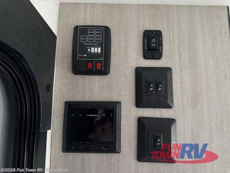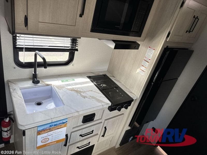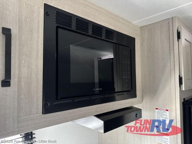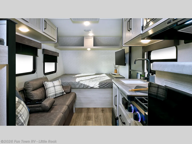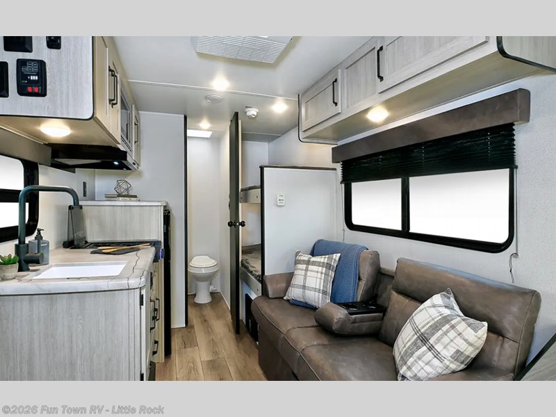 It will be so easy to enjoy camping trips in this single axle travel trailer! There is a front RV queen bed with flip-up storage at the foot of the bed for your belongings, and any additional guests can sleep on the bunk beds and sofa. A full kitchen includes a stainless two burner cooktop and stainless microwave to cook meals each day, and the 4.3 cu. ft. 12V black glass refrigerator will keep your food fresh. And a private bath with a toilet and shower will let you freshen up without having to use the camp's facilities!