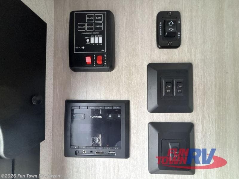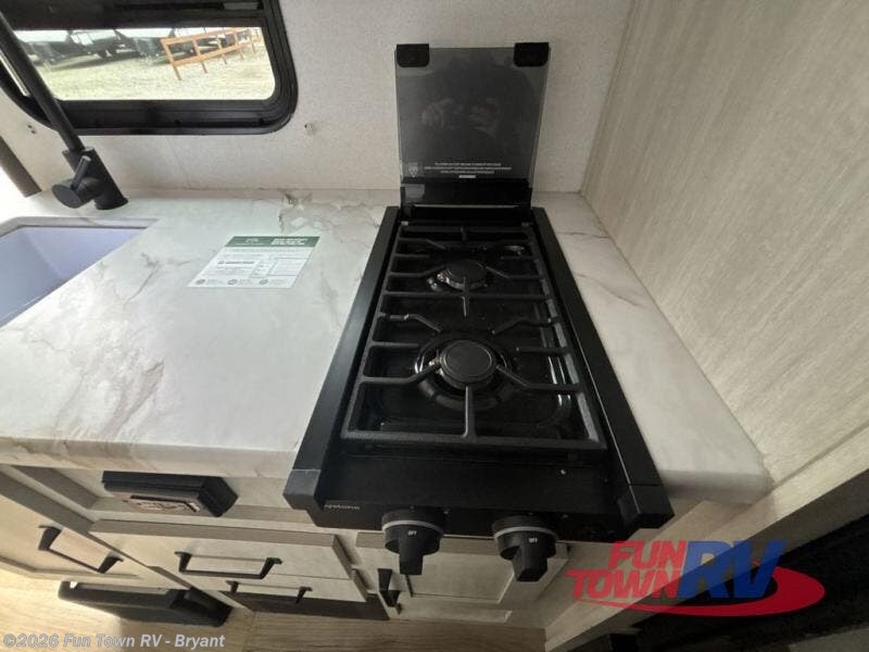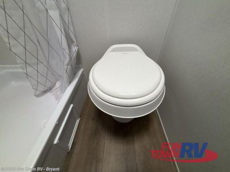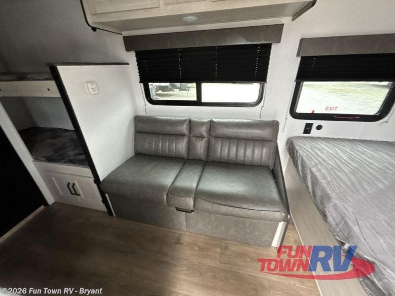 It will be so easy to enjoy camping trips in this single axle travel trailer! There is a front RV queen bed with flip-up storage at the foot of the bed for your belongings, and any additional guests can sleep on the bunk beds and sofa. A full kitchen includes a two-burner cooktop and microwave to cook meals each day, and the 12V black glass refrigerator will keep your food fresh. And a private bath with a toilet and shower will let you freshen up without having to use the camp's facilities!