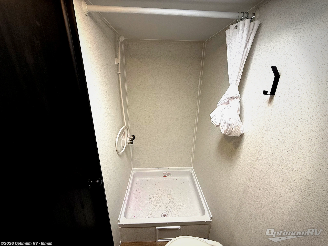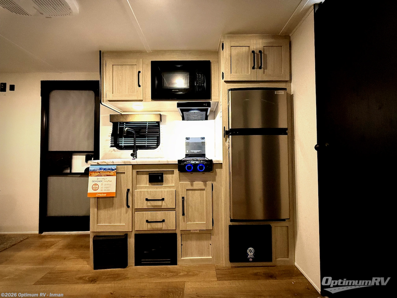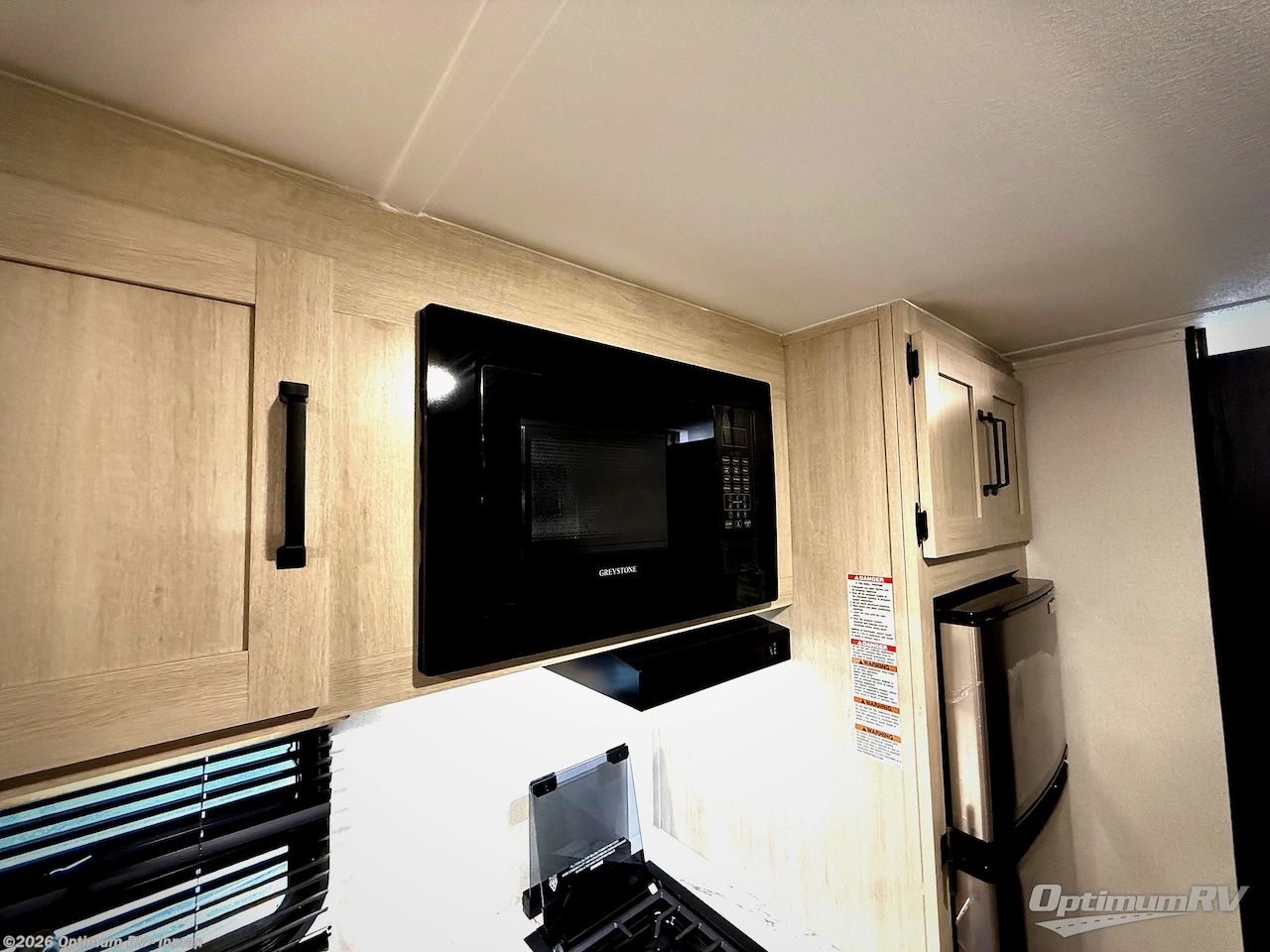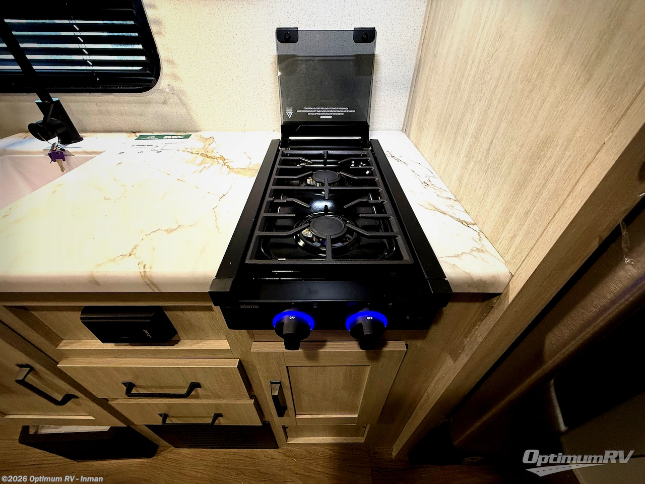 This travel trailer includes everything you need for camping trips at the lake. You'll sleep great each night on the front RV queen bed with a shirt closet to keep your things organized, or you can choose the optional Murphy bed with a shelf. The chef of your group can make meals on the two-burner cooktop or in the microwave oven, then you can dine around the U-shaped dinette slide. A full rear bath includes a 36" x 30" shower, a toilet, vanity, plus a medicine cabinet to keep your things organized.