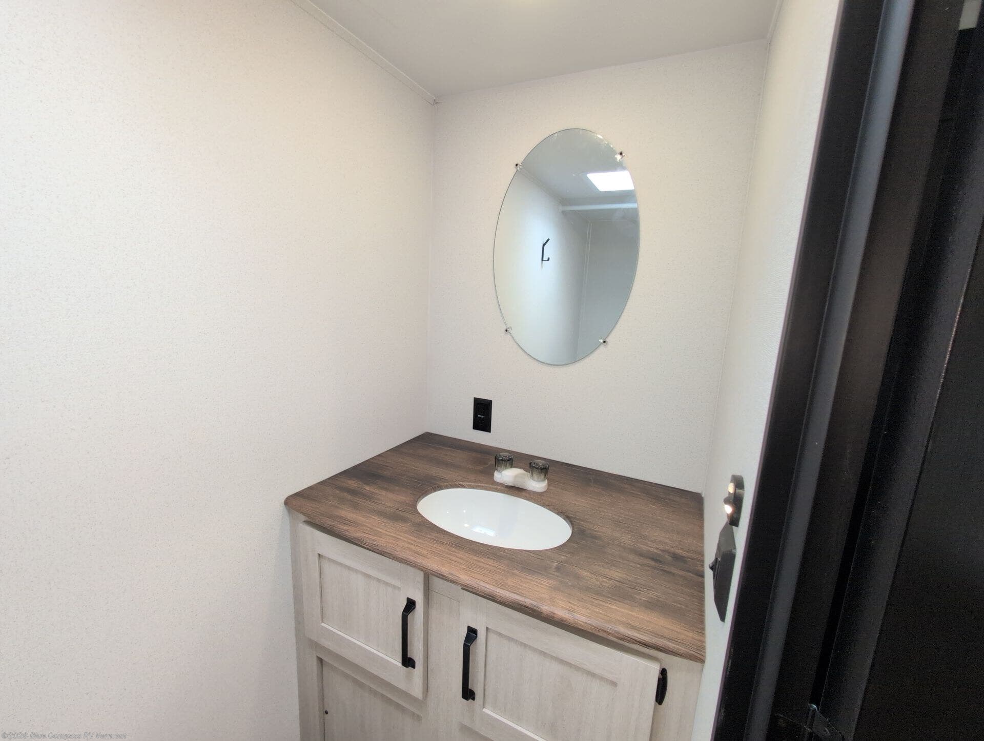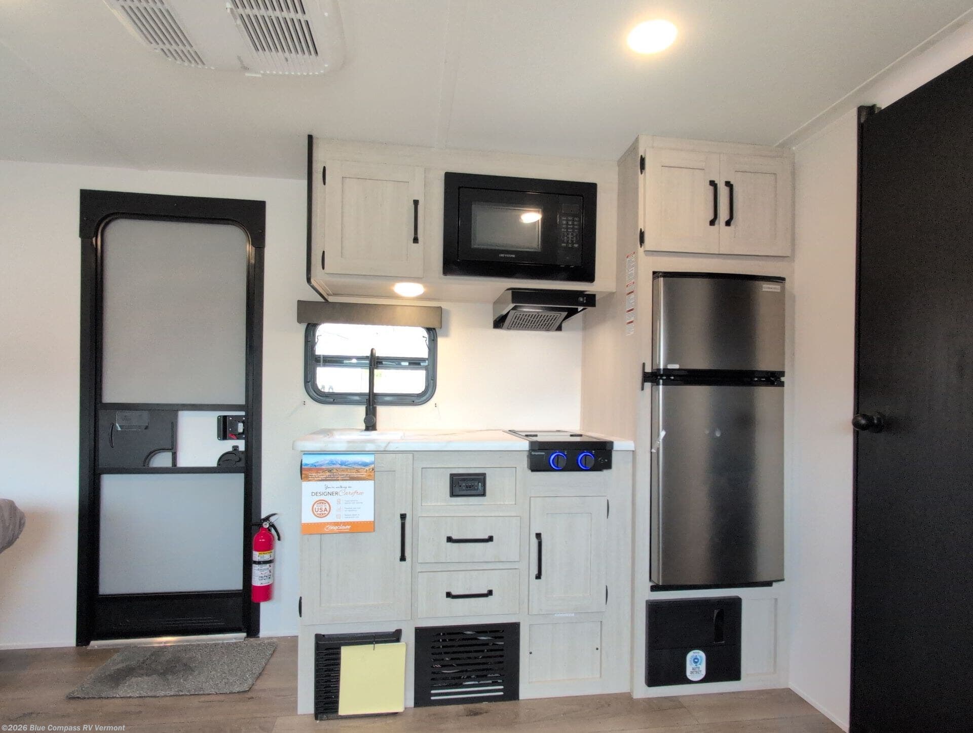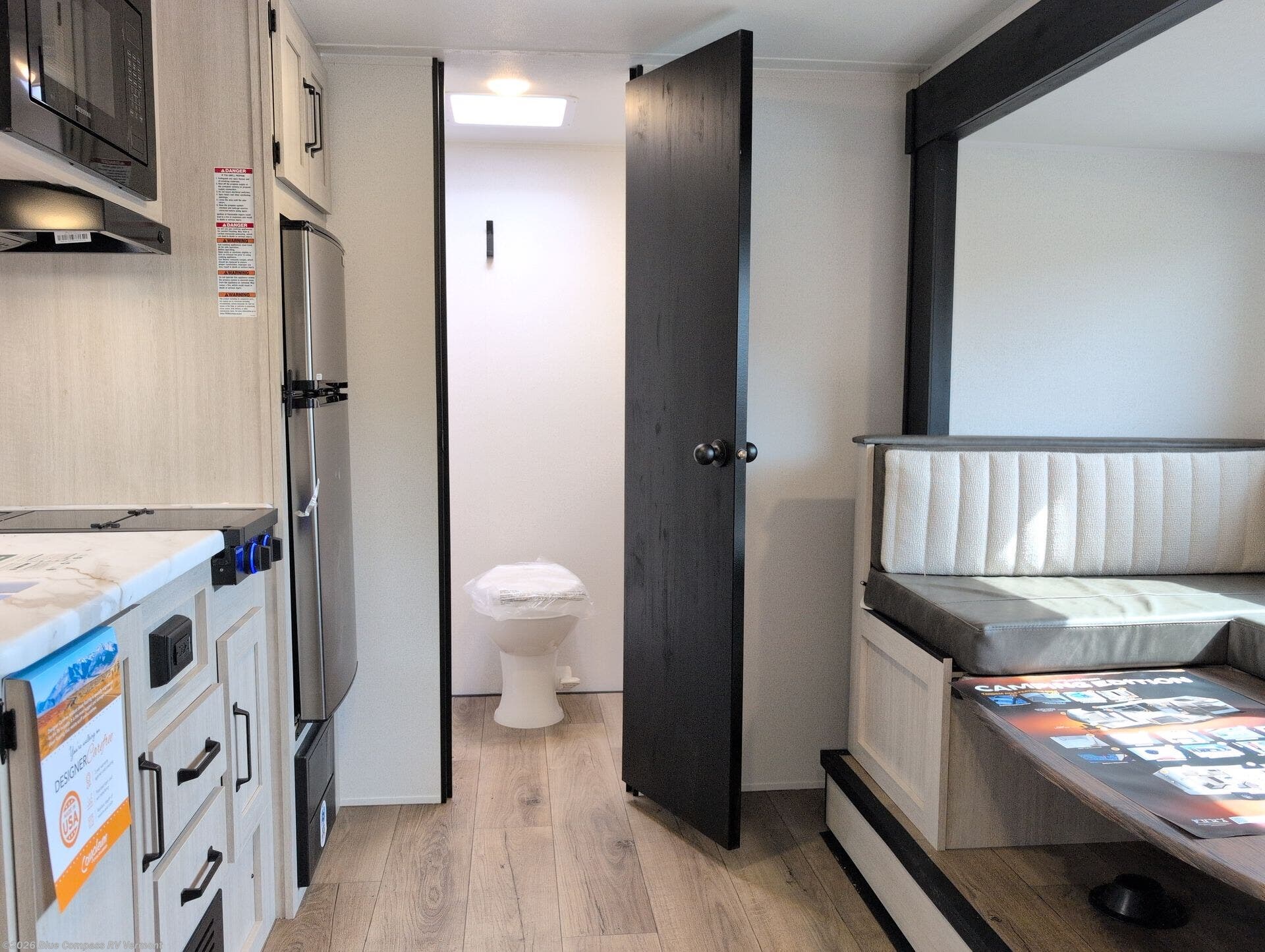 This travel trailer includes everything you need for camping trips at the lake. You'll sleep great each night on the front RV queen bed with a shirt closet to keep your things organized, or you can choose the optional Murphy bed with a shelf. The chef of your group can make meals on the two-burner cooktop or in the microwave oven, then you can dine around the U-shaped dinette slide. A full rear bath includes a 36" x 30" shower, a toilet, vanity, plus a medicine cabinet to keep your things organized.