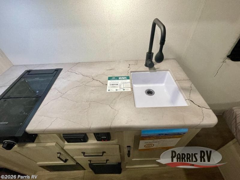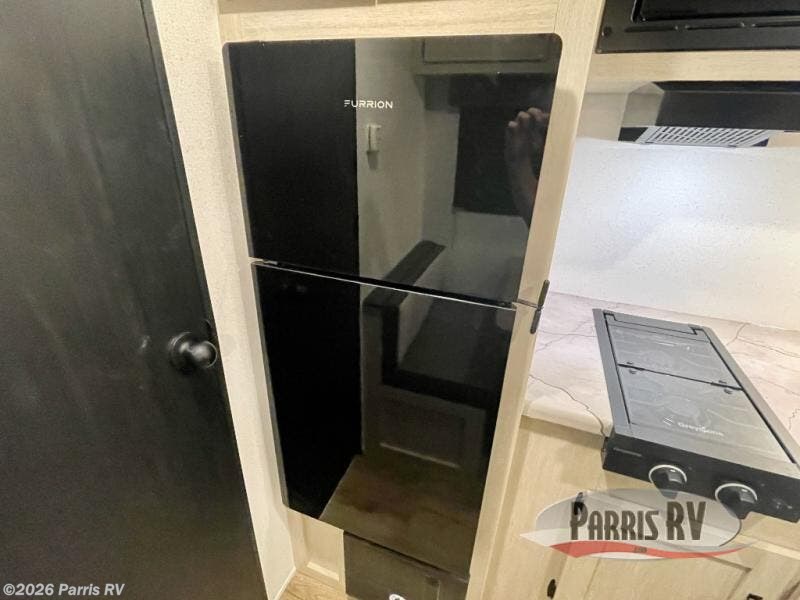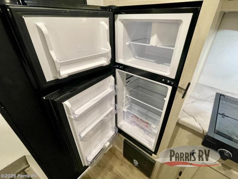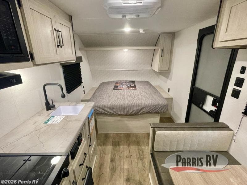 This single axle travel trailer is one you won't want to pass up! There is a front RV queen bed with a bedside shirt closet and overhead shelf for your things, and one more adult or two little ones can sleep on the booth dinette. A full kitchen includes a stainless two burner cooktop and stainless microwave to cook meals each day, and the 4.3 cu. ft. 12V black glass refrigerator will keep your food fresh. This model also includes a full rear bath with a toilet, sink, and 36" x 30" shower for easy cleaning up!