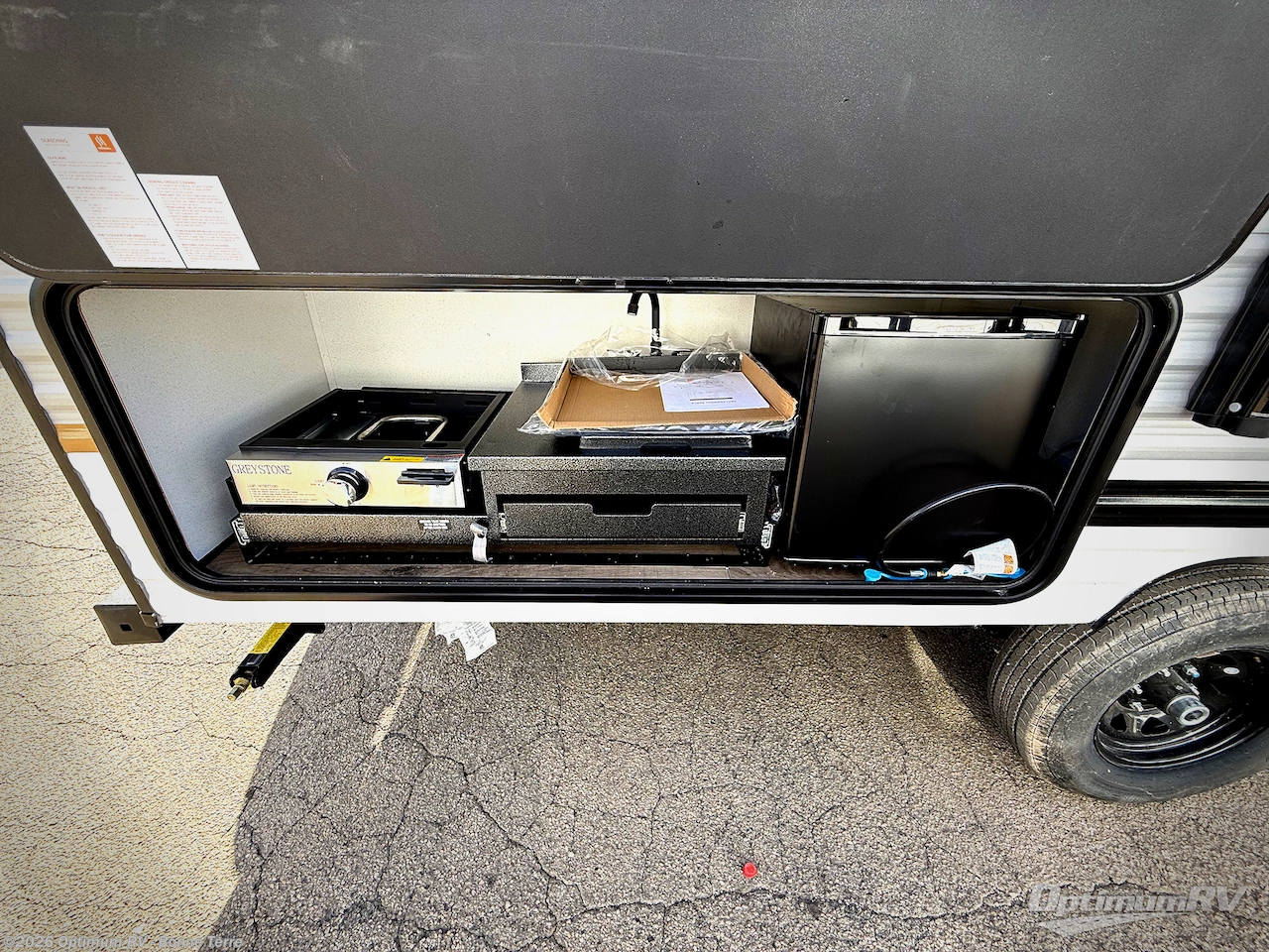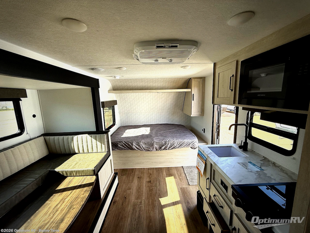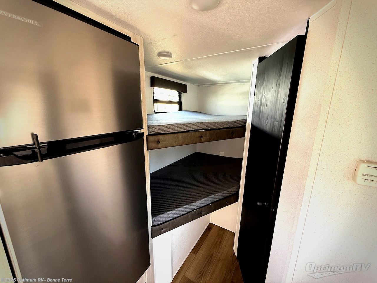 The whole gang will love camping in this travel trailer since there are double-size bunks for compact sleeping spaces and a slide out for more space to relax! The front RV queen bed is sure to provide a great night's rest, and you can choose the optional Murphy bed if you're needing more seating space during the day. Once you've made dinner on the two burner cooktop, you can dine around the U-shaped dinette. And an optional mini kitchen with a griddle is available if you'd rather cook outdoors! This unit includes ample storage space for your things, including exterior storage and storage under the bunks!