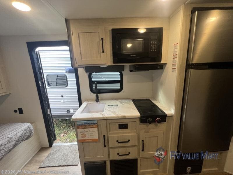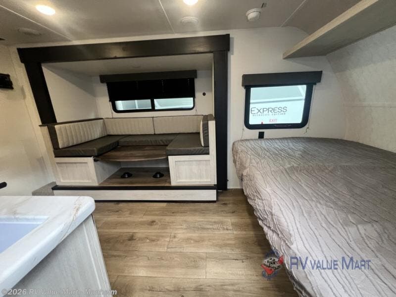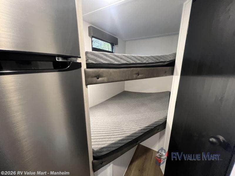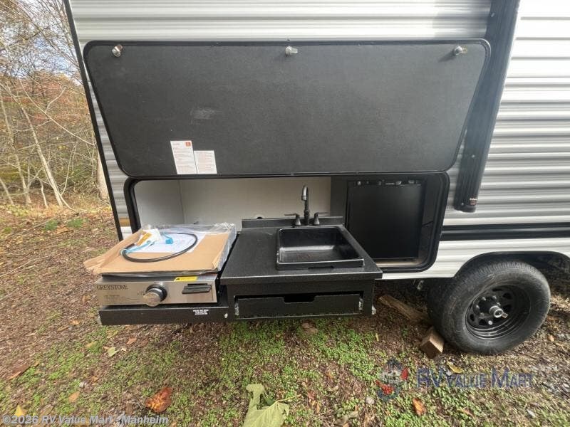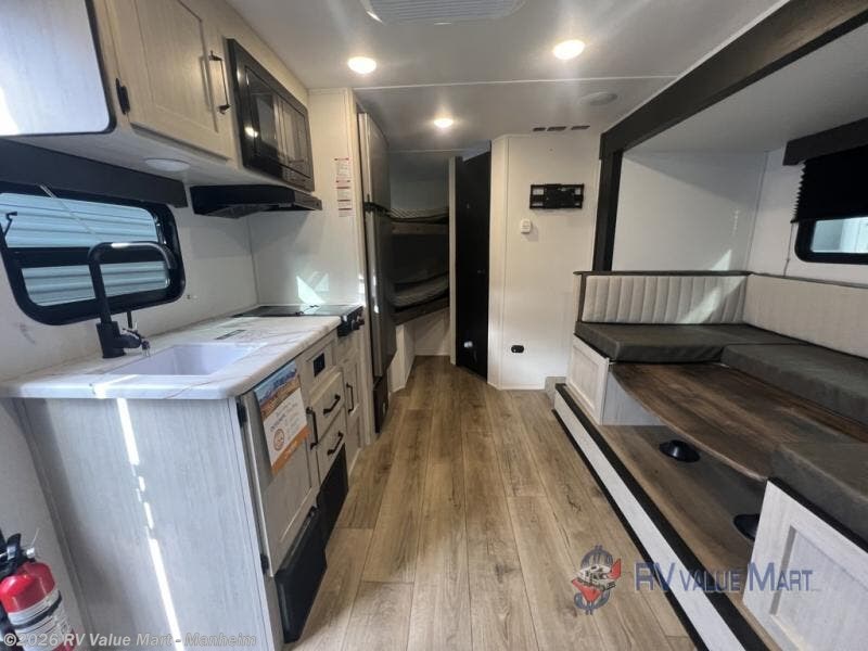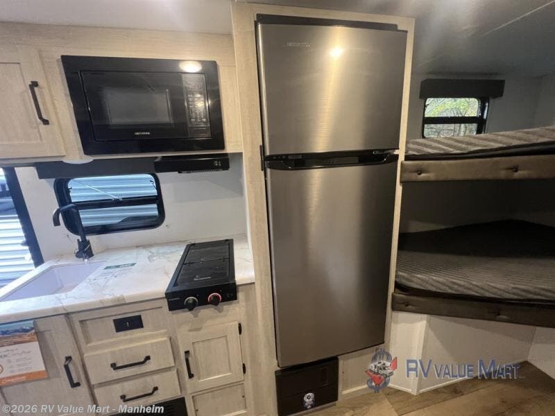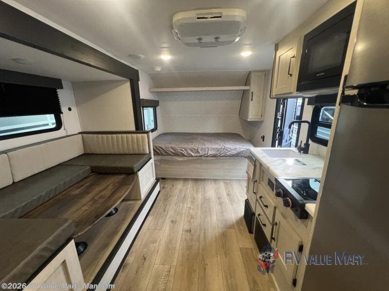 The whole gang will love camping in this travel trailer since there are double-size bunks for compact sleeping spaces and a slide out for more space to relax! The front RV queen bed is sure to provide a great night's rest, and you can choose the optional Murphy bed if you're needing more seating space during the day. Once you've made dinner on the two burner cooktop, you can dine around the U-shaped dinette. And an optional mini kitchen with a griddle is available if you'd rather cook outdoors! This unit includes ample storage space for your things, including exterior storage and storage under the bunks!