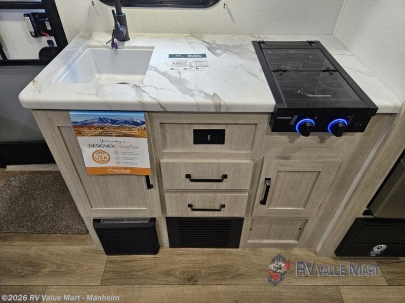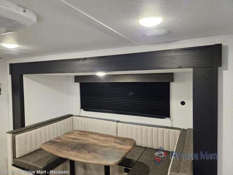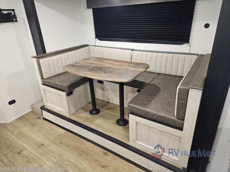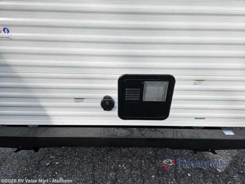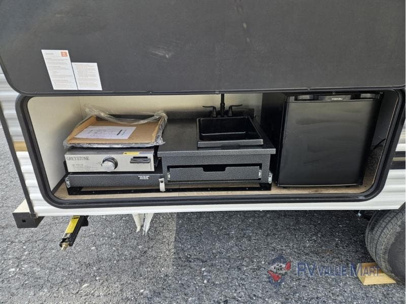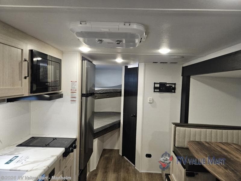 The whole gang will love camping in this travel trailer since there are double-size bunks for compact sleeping spaces and a slide out for more space to relax! The front RV queen bed is sure to provide a great night's rest, and you can choose the optional Murphy bed if you're needing more seating space during the day. Once you've made dinner on the two burner cooktop, you can dine around the U-shaped dinette. And an optional mini kitchen with a griddle is available if you'd rather cook outdoors! This unit includes ample storage space for your things, including exterior storage and storage under the bunks!