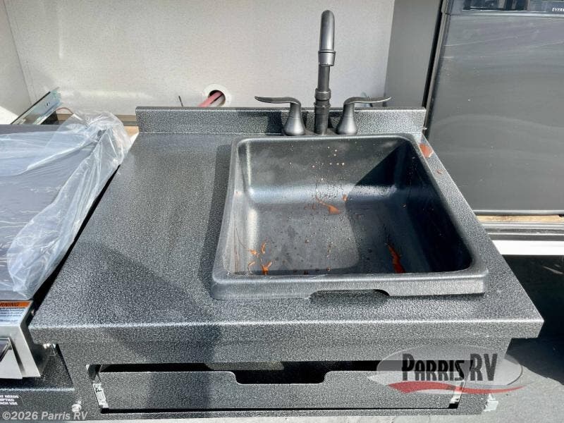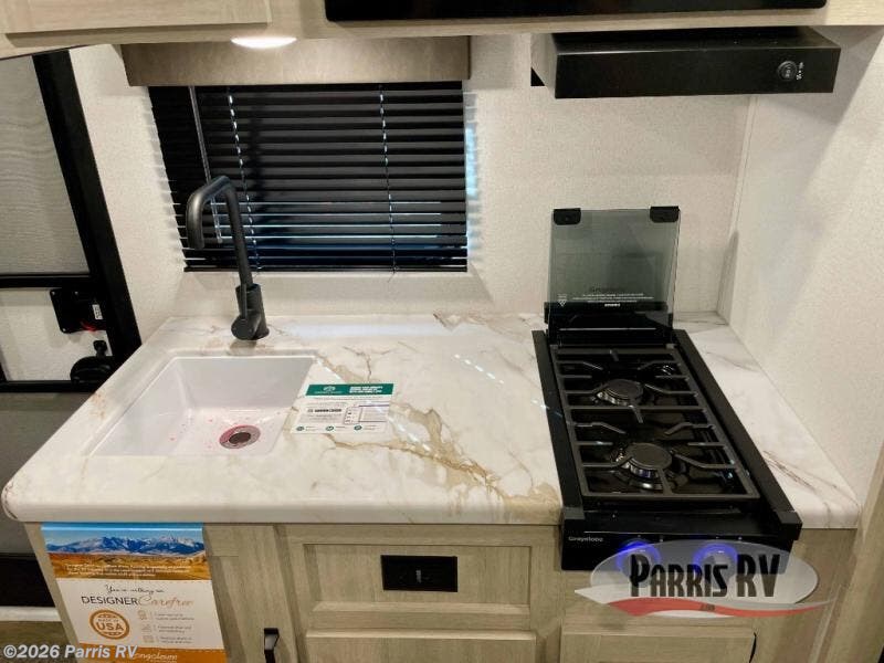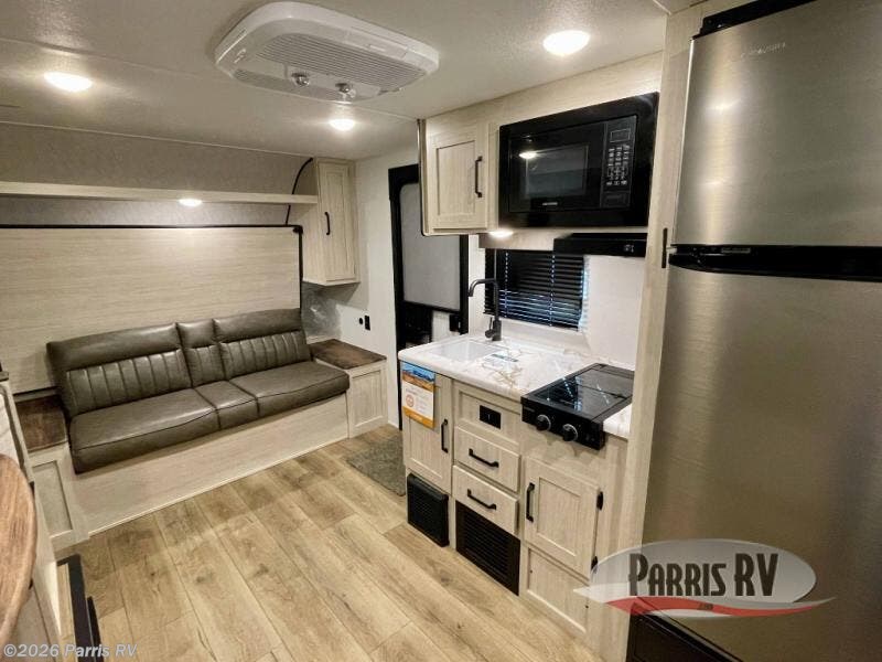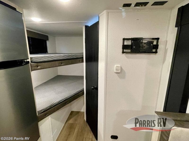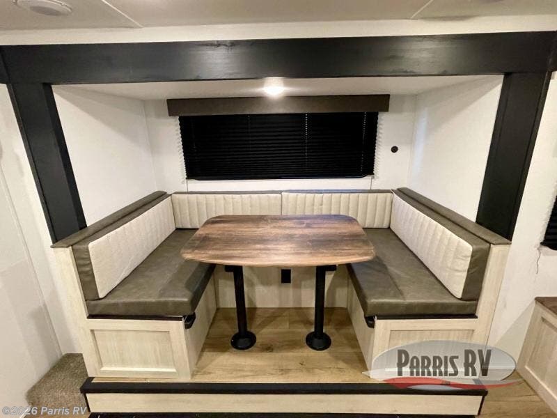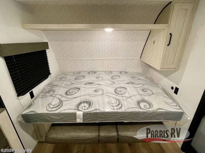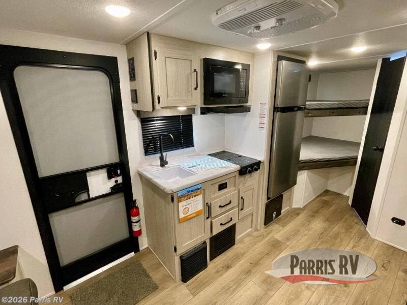 The whole gang will love camping in this travel trailer since there are double-size bunks for compact sleeping spaces and a slide out for more space to relax! The front RV queen bed is sure to provide a great night's rest, and you can choose the optional Murphy bed if you're needing more seating space during the day. Once you've made dinner on the two burner cooktop, you can dine around the U-shaped dinette. And an optional mini kitchen with a griddle is available if you'd rather cook outdoors! This unit includes ample storage space for your things, including exterior storage and storage under the bunks!