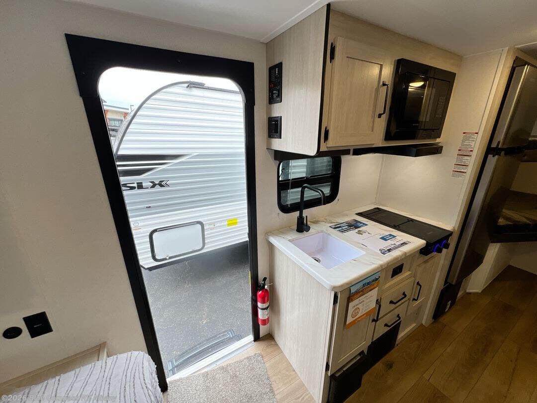 The whole gang will love camping in this travel trailer since there are double-size bunks for compact sleeping spaces and a slide out for more space to relax! The front RV queen bed is sure to provide a great night's rest, and you can choose the optional Murphy bed if you're needing more seating space during the day. Once you've made dinner on the two-burner cooktop, you can dine around the U-shaped dinette. And an optional mini kitchen with a griddle is available if you'd rather cook outdoors! This unit includes ample storage space for your things, including exterior storage and storage under the bunks!