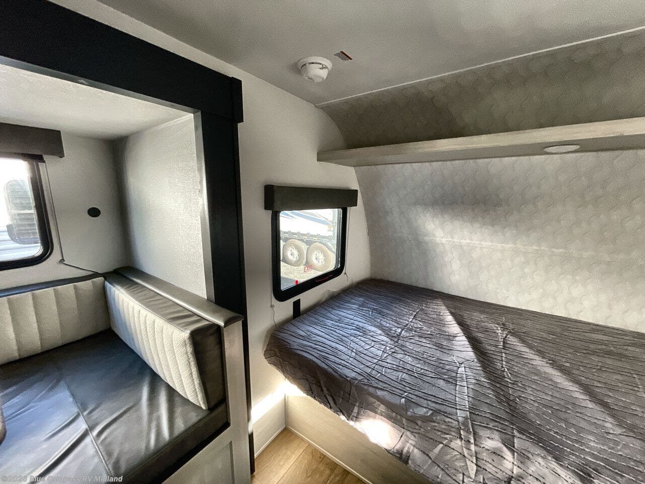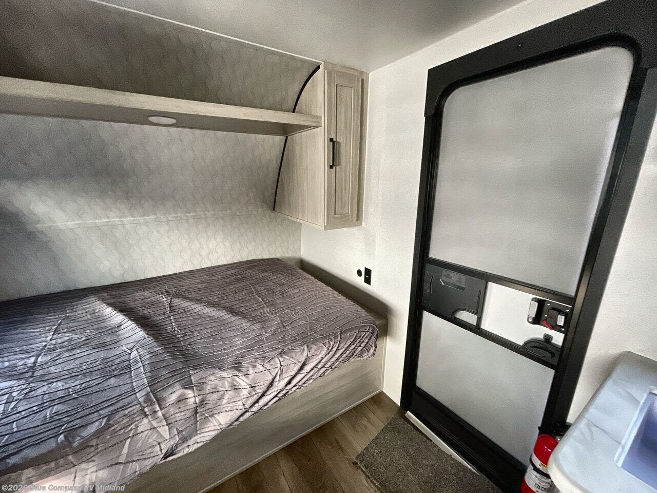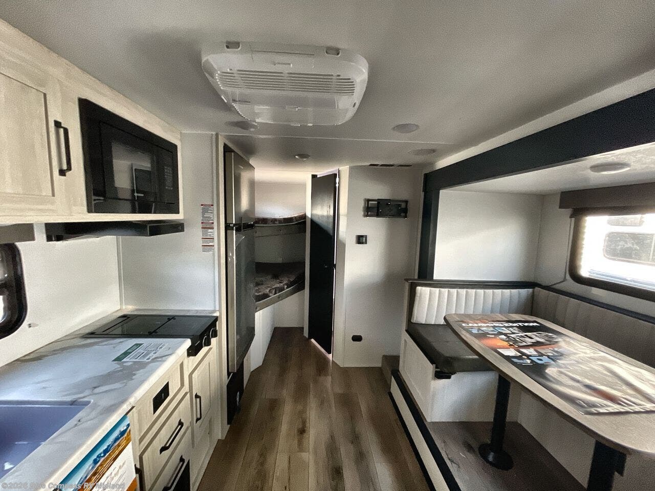 The whole gang will love camping in this travel trailer since there are double-size bunks for compact sleeping spaces and a slide out for more space to relax! The front RV queen bed is sure to provide a great night's rest, and you can choose the optional Murphy bed if you're needing more seating space during the day. Once you've made dinner on the two-burner cooktop, you can dine around the U-shaped dinette. And an optional mini kitchen with a griddle is available if you'd rather cook outdoors! This unit includes ample storage space for your things, including exterior storage and storage under the bunks!