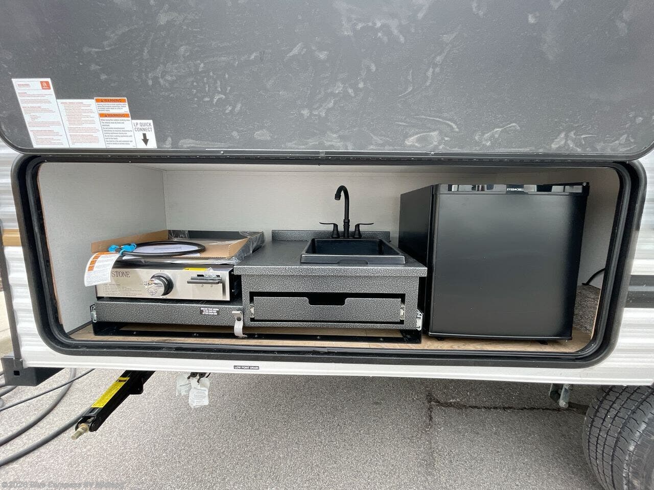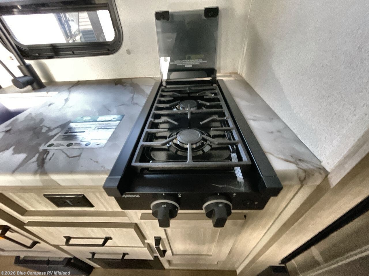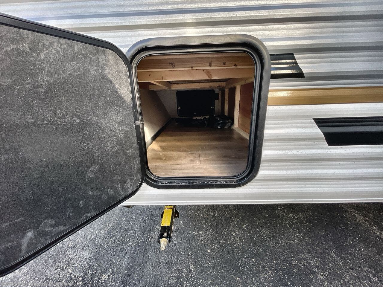 The whole gang will love camping in this travel trailer since there are double-size bunks for compact sleeping spaces and a slide out for more space to relax! The front RV queen bed is sure to provide a great night's rest, and you can choose the optional Murphy bed if you're needing more seating space during the day. Once you've made dinner on the two-burner cooktop, you can dine around the U-shaped dinette. And an optional mini kitchen with a griddle is available if you'd rather cook outdoors! This unit includes ample storage space for your things, including exterior storage and storage under the bunks!