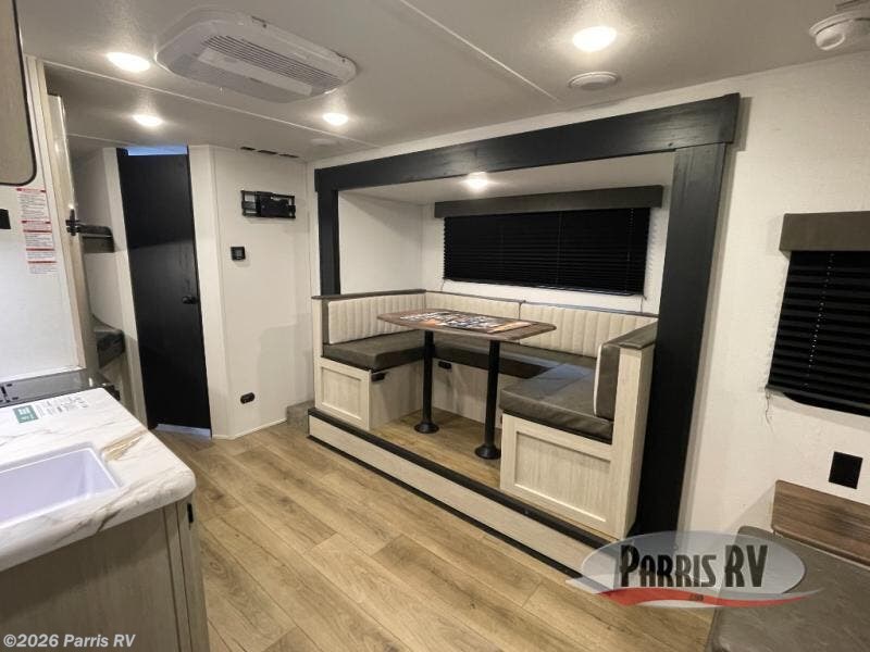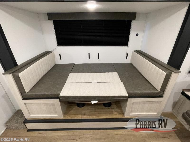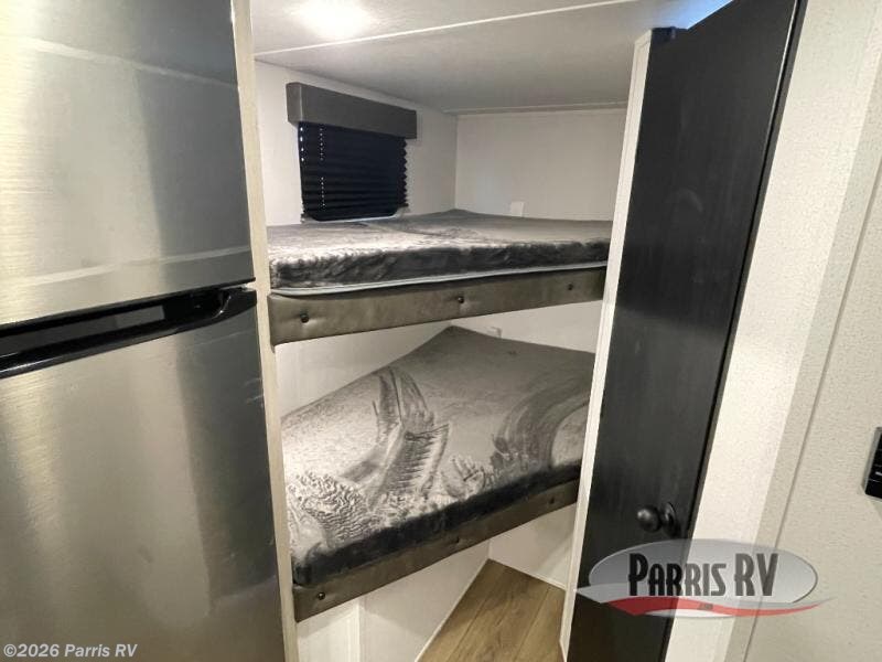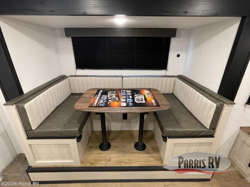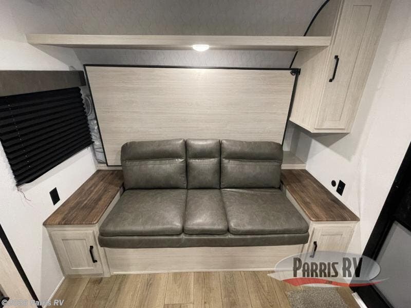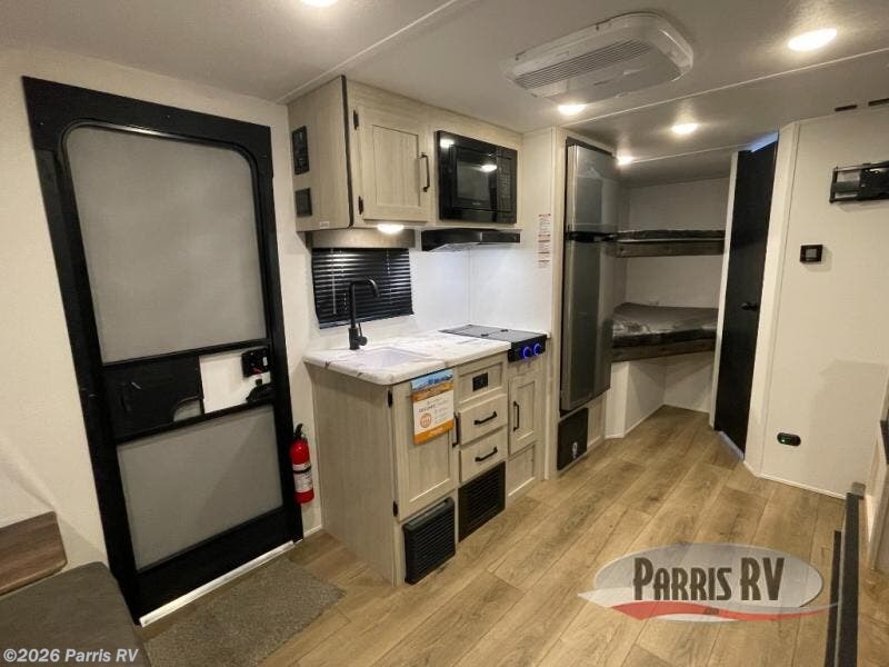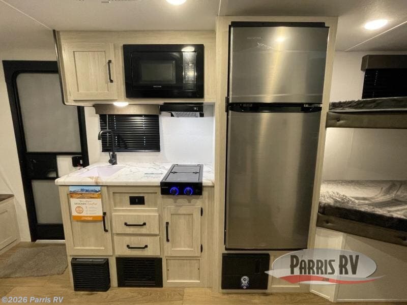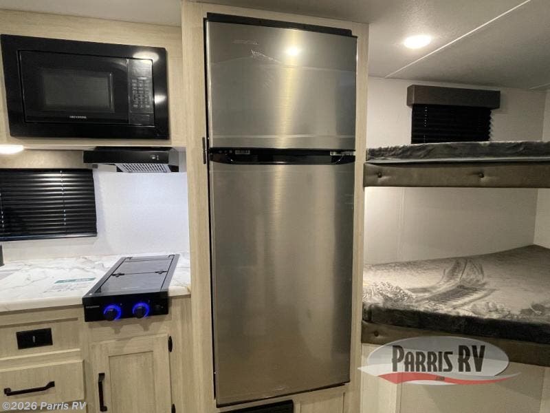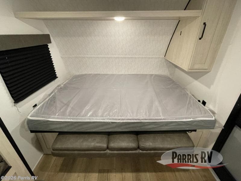 The whole gang will love camping in this travel trailer since there are double-size bunks for compact sleeping spaces and a slide out for more space to relax! The front RV queen bed is sure to provide a great night's rest, and you can choose the optional Murphy bed if you're needing more seating space during the day. Once you've made dinner on the two-burner cooktop, you can dine around the U-shaped dinette. And an optional mini kitchen with a griddle is available if you'd rather cook outdoors! This unit includes ample storage space for your things, including exterior storage and storage under the bunks!
