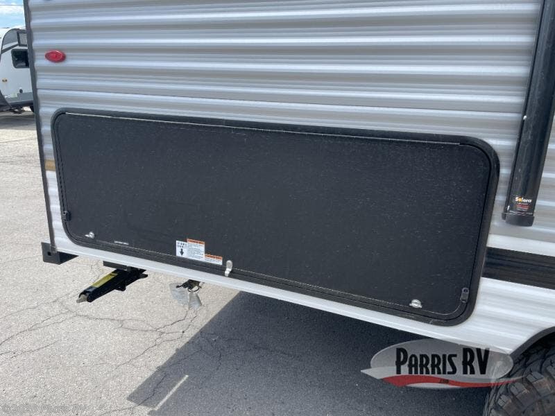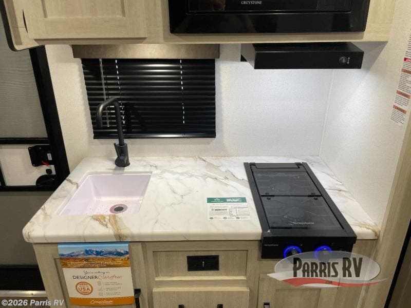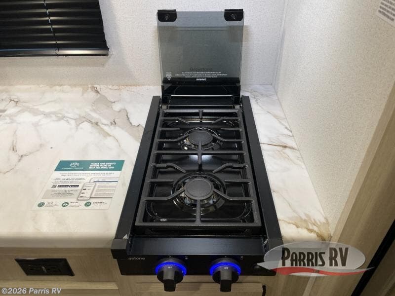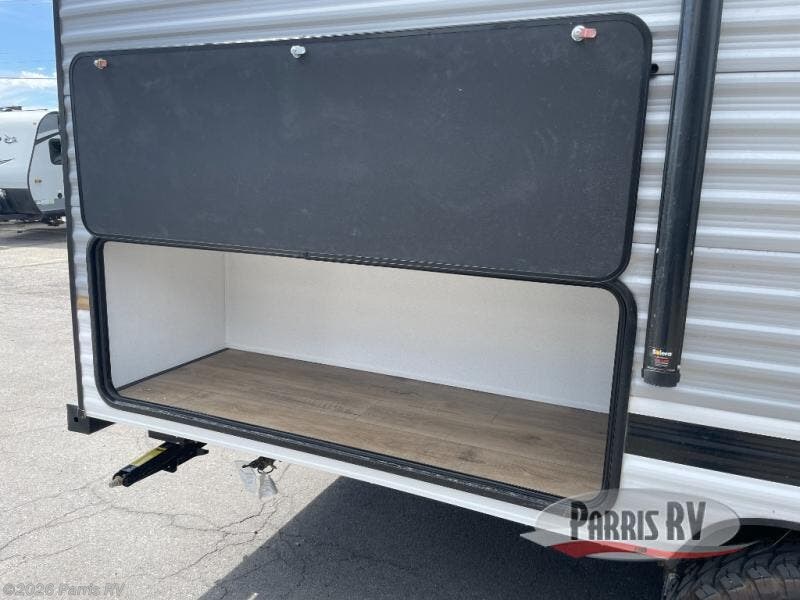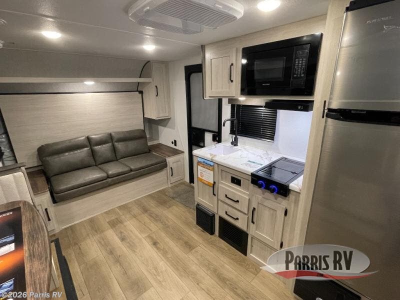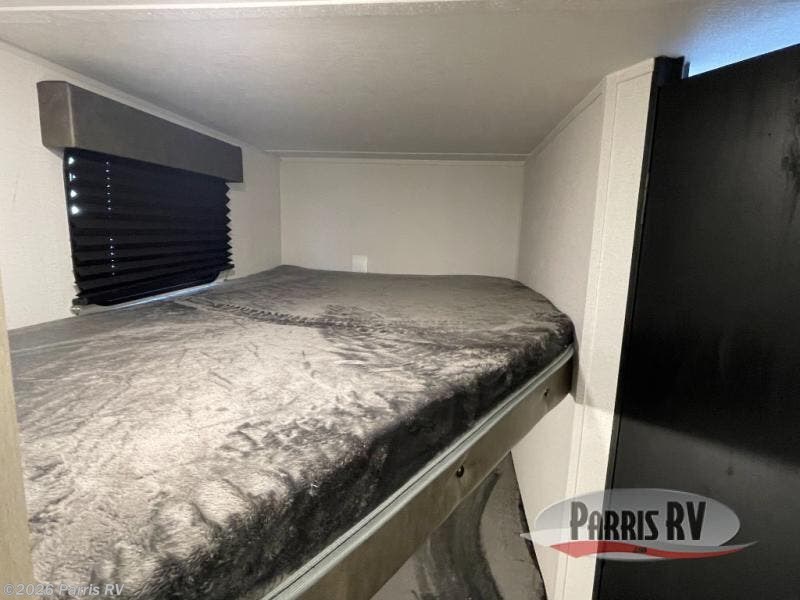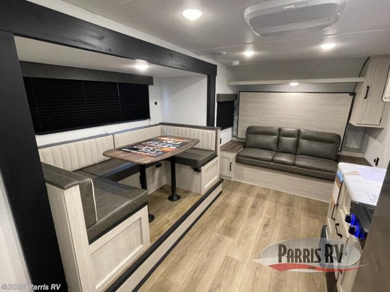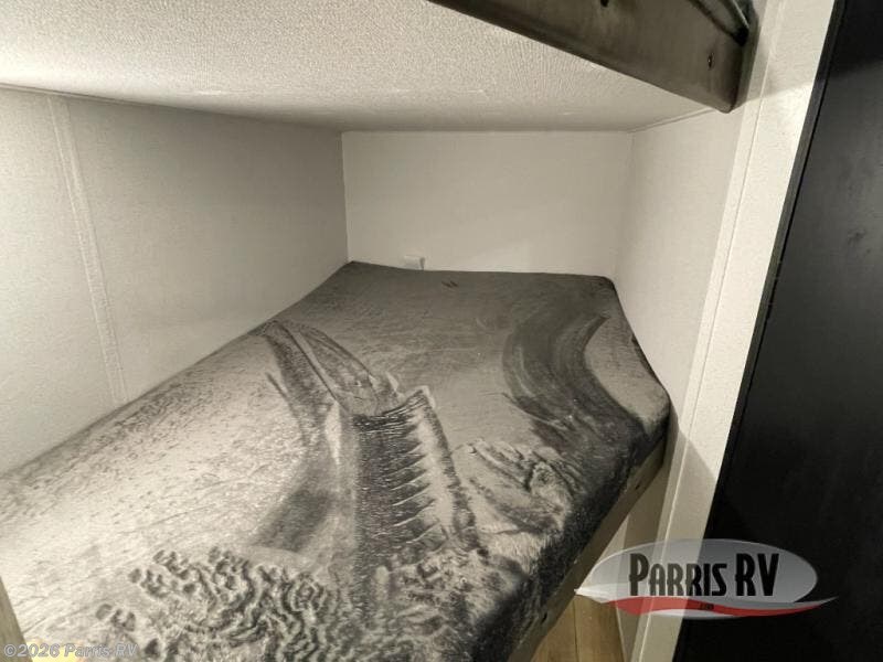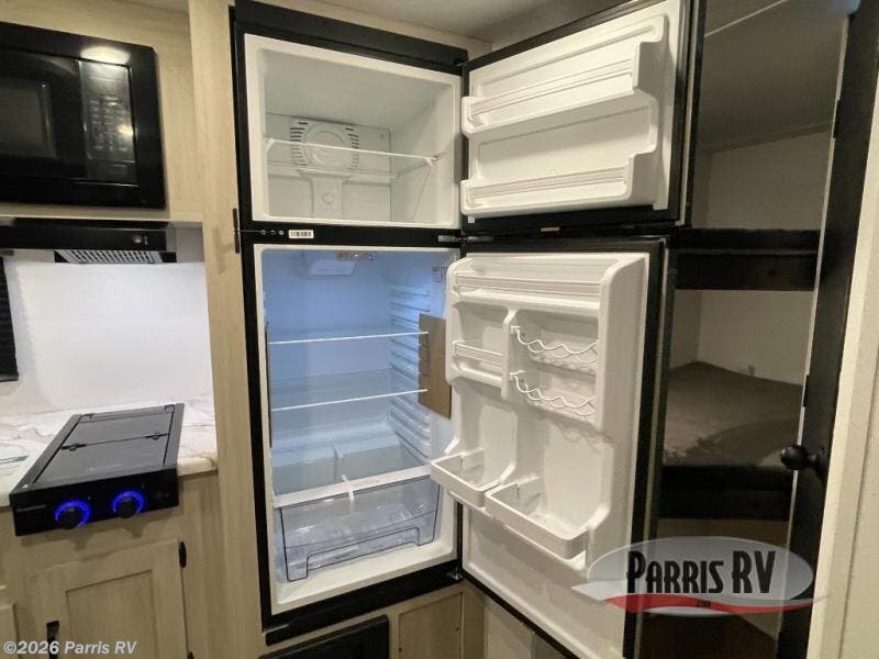 The whole gang will love camping in this travel trailer since there are double-size bunks for compact sleeping spaces and a slide out for more space to relax! The front RV queen bed is sure to provide a great night's rest, and you can choose the optional Murphy bed if you're needing more seating space during the day. Once you've made dinner on the two-burner cooktop, you can dine around the U-shaped dinette. And an optional mini kitchen with a griddle is available if you'd rather cook outdoors! This unit includes ample storage space for your things, including exterior storage and storage under the bunks!