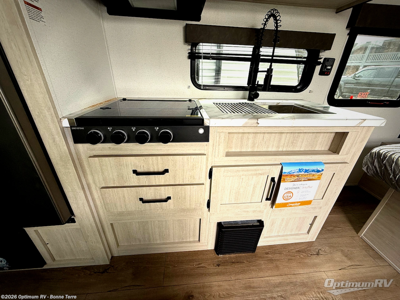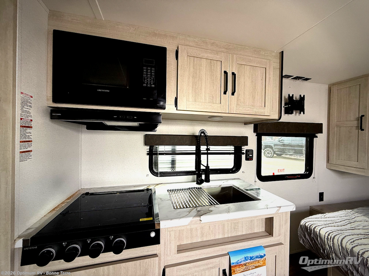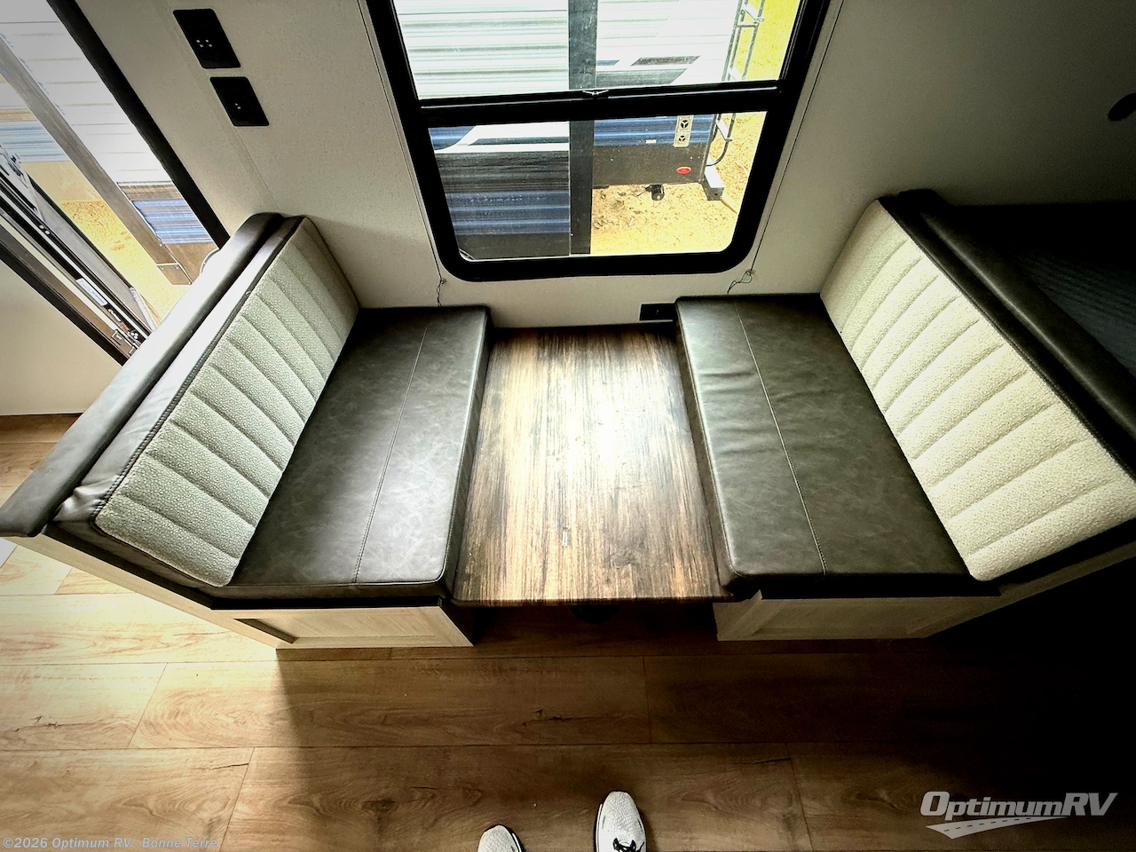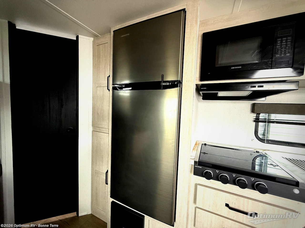 If you're looking for more sleeping space, this double axle unit features double-size bunks with storage under the bunks for your bags. The full kitchen includes a microwave and three burner cooktop to make meals, plus a pantry and 12V refrigerator for food storage. And an optional outside mini kitchen with a griddle can be added if you enjoy cooking outdoors! Up front, you'll find a 60" x 74" queen bed with an optional Murphy bed if you're needing more seating space during the day!