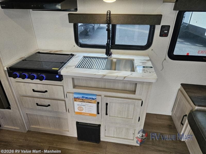 If you're looking for more sleeping space, this double axle unit features double-size bunks with storage under the bunks for your bags. The full kitchen includes a stainless microwave and three burner cooktop to make meals, plus a pantry and 12V refrigerator for food storage. And an optional outside mini kitchen with a griddle can be added if you enjoy cooking outdoors! Up front, you'll find a 60" x 74" queen bed with an optional Murphy bed if you're needing more seating space during the day!