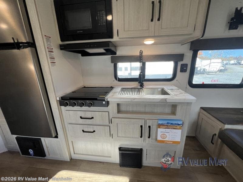If you're looking for more sleeping space, this double axle unit features double-size bunks with storage under the bunks for your bags. The full kitchen includes a stainless microwave and three burner cooktop to make meals, plus a pantry and 12V refrigerator for food storage. And an optional outside mini kitchen with a griddle can be added if you enjoy cooking outdoors! Up front, you'll find a 60" x 74" queen bed with an optional Murphy bed if you're needing more seating space during the day!
