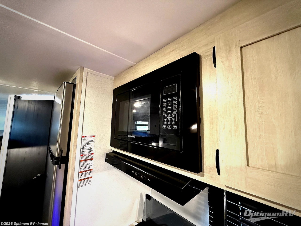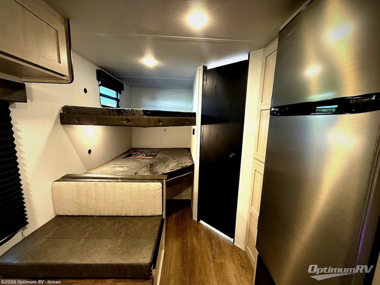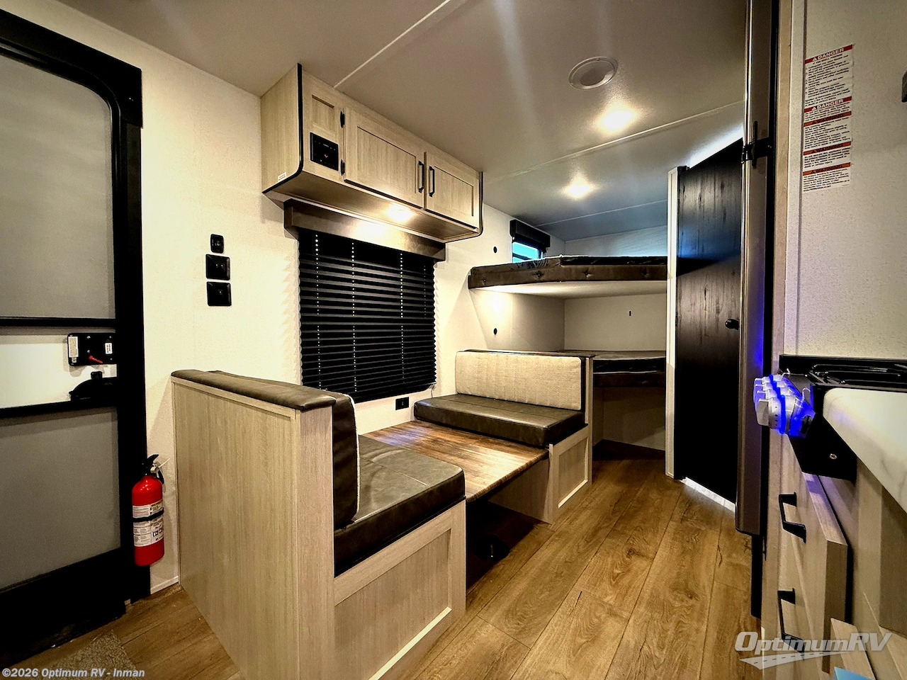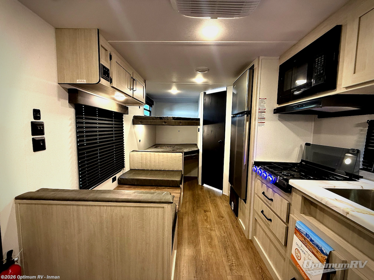 If you're looking for more sleeping space, this double axle unit features double-size bunks with storage under the bunks for your bags. The full kitchen includes a microwave and three burner cooktop to make meals, plus a pantry and 12V refrigerator for food storage. And an optional outside mini kitchen with a griddle can be added if you enjoy cooking outdoors! Up front, you'll find a 60" x 74" queen bed with an optional Murphy bed if you're needing more seating space during the day!