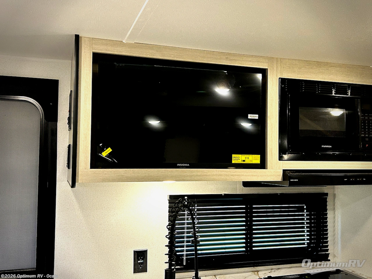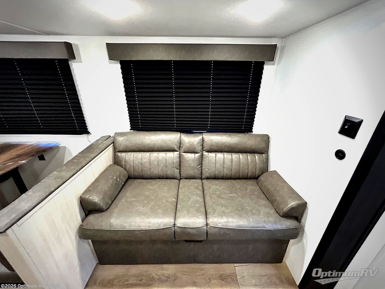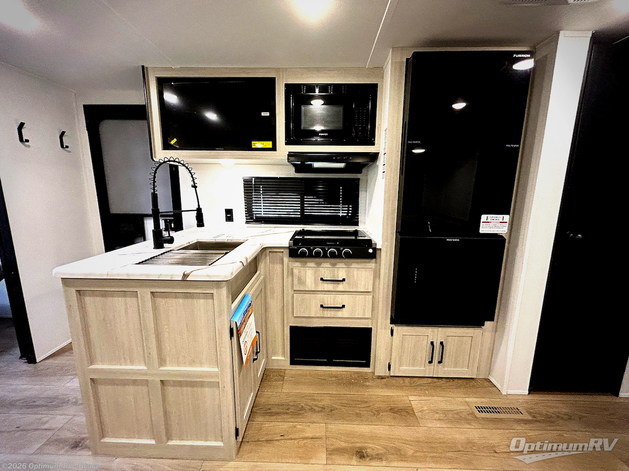 Wherever you decide to camp, you can be sure to have a great time in this rear bath travel trailer! The combined kitchen and living area is made spacious thanks to the large slide out. Here, you can relax on the sofa and dine at the booth dinette, and an optional TV can be added if you want the option for movie night. The full kitchen will allow you to make meals each day, and you can choose to add the optional outside mini kitchen with a griddle if you want to cook with fresh air. This unit also includes a front private bedroom, complete with an RV queen bed, an overhead shelf and dual shirt closets to keep clothes wrinkle-free.