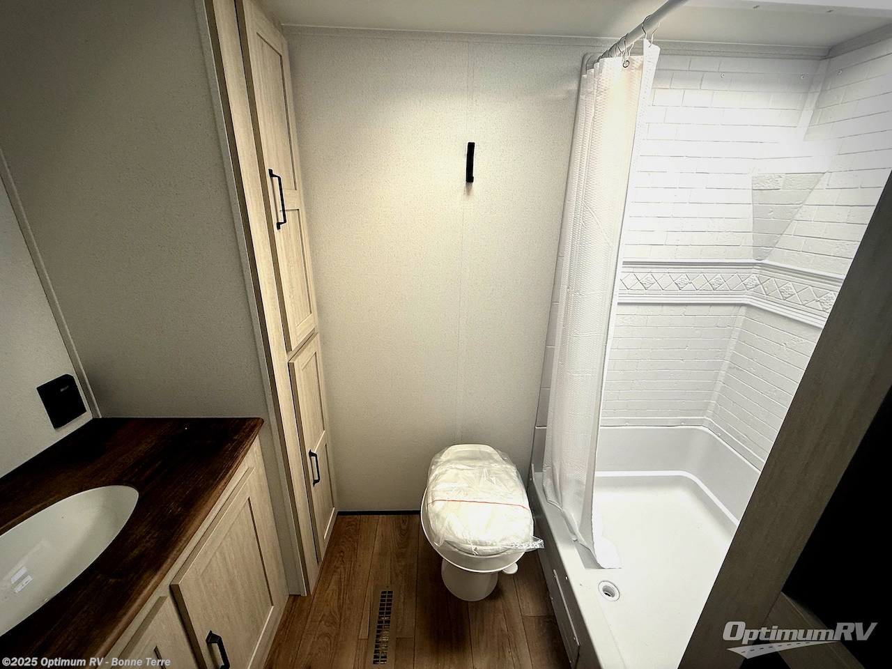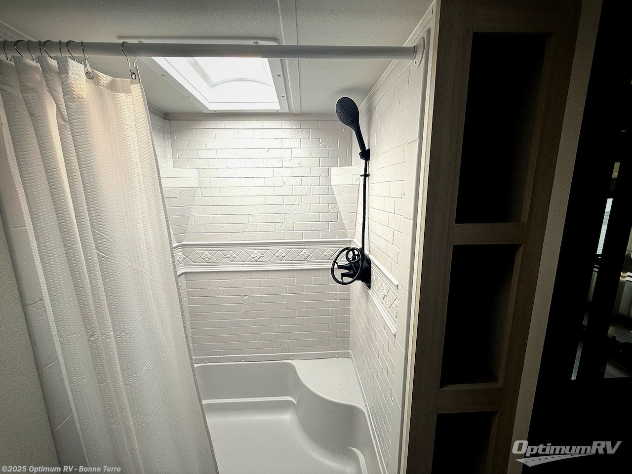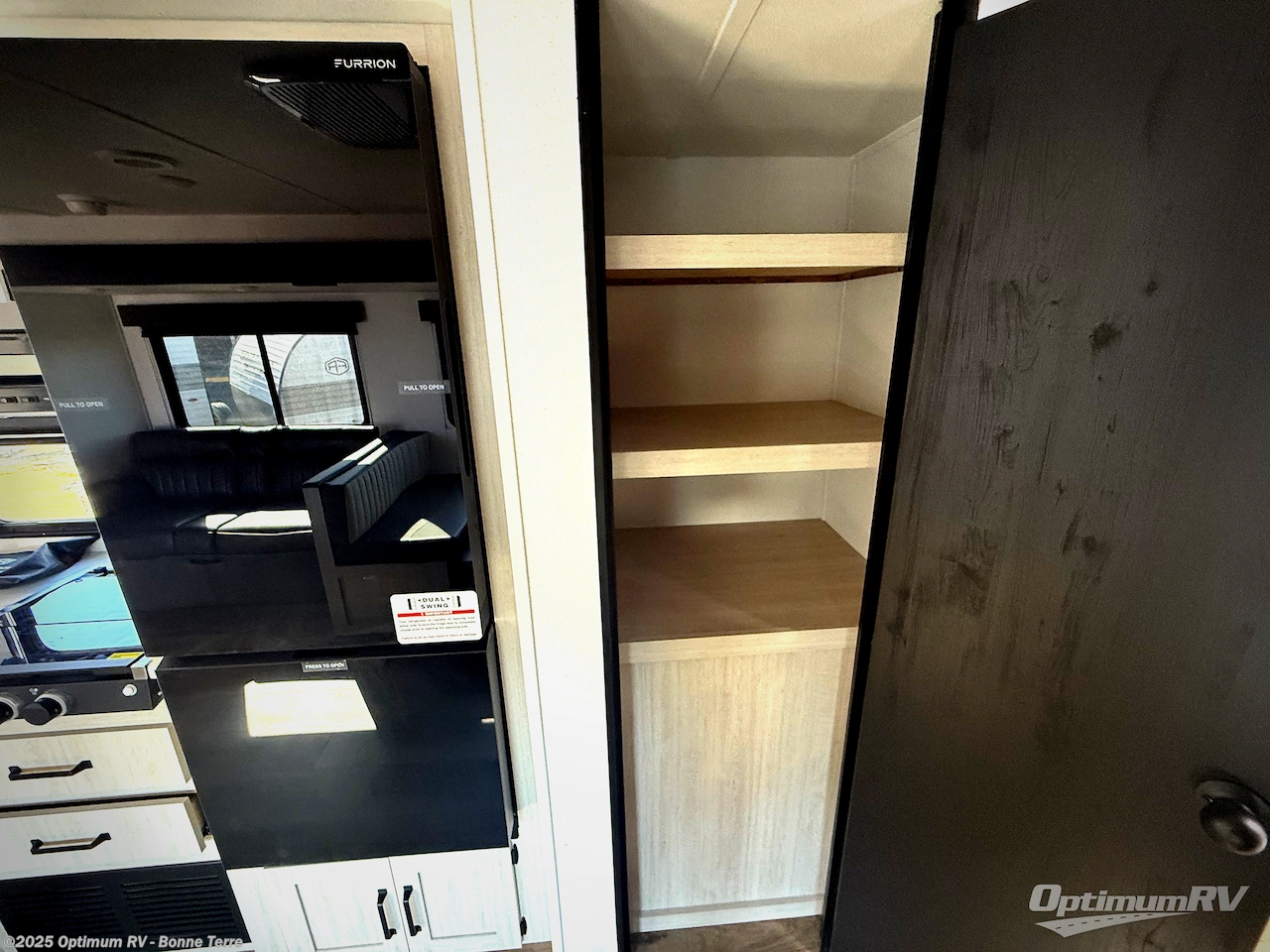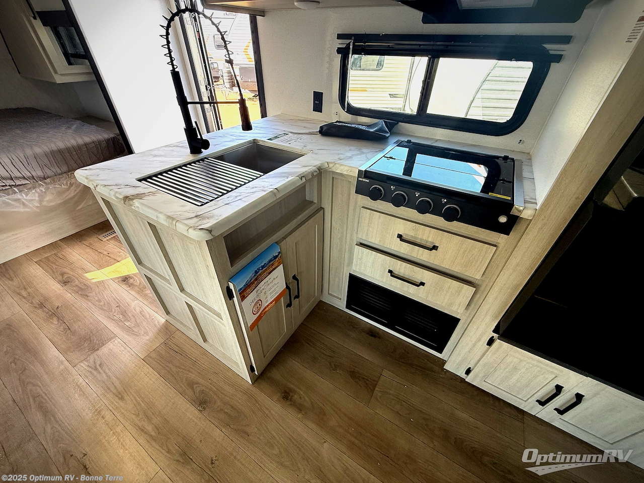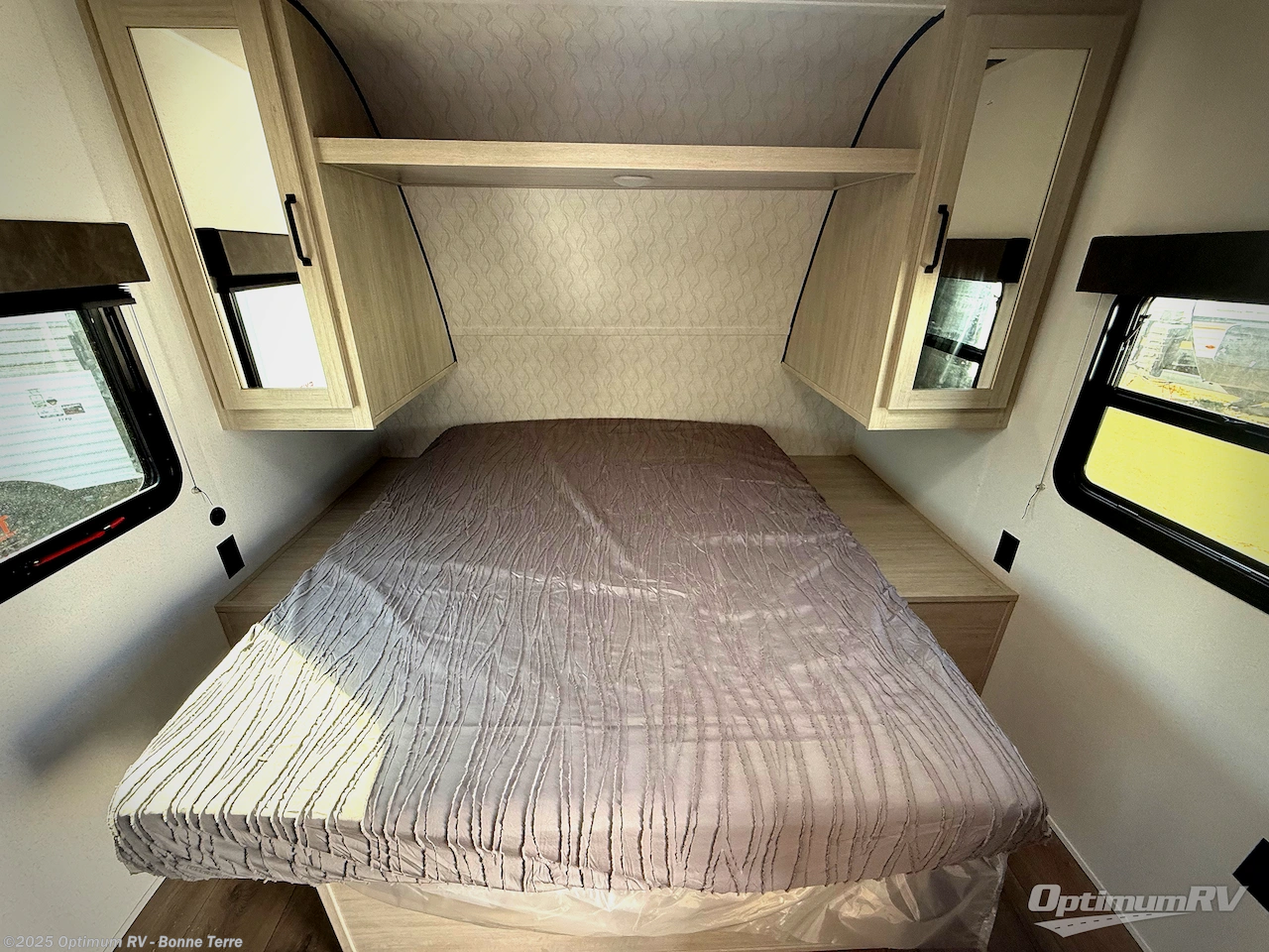 Wherever you decide to camp, you can be sure to have a great time in this rear bath travel trailer! The combined kitchen and living area is made spacious thanks to the large slide out. Here, you can relax on the sofa and dine at the booth dinette, and an optional TV can be added if you want the option for movie night. The full kitchen will allow you to make meals each day, and you can choose to add the optional outside mini kitchen with a griddle if you want to cook with fresh air. This unit also includes a front private bedroom, complete with an RV queen bed, an overhead shelf and dual shirt closets to keep clothes wrinkle-free.
